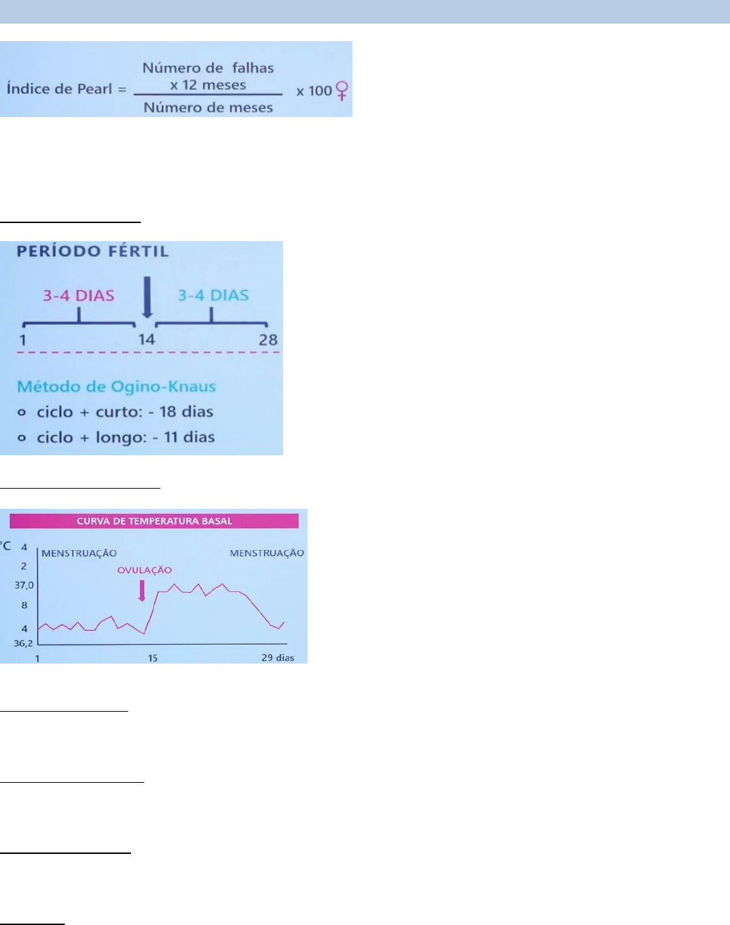 <p>Anticoncepção – métodos comportamentais, barreira e intrauterinos</p><p>*A cada 100 mulheres que utilizam desse método, quantas apresentam falhas.</p><p>A OMS considera que o método é eficaz quando o IP < 1</p><p>Divisão dos métodos anticonceptivos: comportamentais, barreira, intrauterinos, hormonais e cirúrgicos.</p><p>1) Abstinência sexual periódica (IP = 24/Altas taxas de falha)</p><p>- Método Ogino-Knaus</p><p>Necessário reconhecer o período fértil. O ciclo mais curto ao longo dos últimos meses e diminui 18 dias (início do período fértil), e o mais longo subtrai 11 dias (final do período fértil): tabelinha.</p><p>- Método da temperatura</p><p>Outra forma de identificar o período fértil é através da temperatura (a progesterona aumenta a temperatura, que quando aumentada, significaria o período fértil)</p><p>- Método de Billings</p><p>A paciente precisa avaliar o seu muco para saber quando evitar a relação sexual.</p><p>- Método sintotérmico</p><p>Envolve a combinação de várias técnicas (temperatura, muco e ogino-knaus)</p><p>- Coito interrompido</p><p>2) Métodos de barreira</p><p>- Condom</p><p>· Camisinha masculina</p><p>· Camisinha feminina</p><p>· Proteção contra ISTs</p><p>· IP = 2 (uso perfeito), 18 (uso comum/incorreto)</p><p>Obs. Preservativo é um método falho, mas sempre indicado para evitar ISTs. Isso porque muitas pessoas utilizam de maneira errada.</p><p>- Espermicidas (IP = 18 a 28)</p><p>São fármacos que rompem a membrana do espermatozoide. O principal fármaco é o Nonoxinol-9, porém em uso repetitivo, pode causar micro-erosões na mucosa vaginal, que podem ser porta de entrada para infecções sexualmente transmissíveis.</p><p>- Diafragma (IP = 6 a 12)</p><p>Dispositivo de borracha que deve ser inserido antes da relação sexual e deve ser retirado no mínimo 6 horas após ejaculação.</p><p>3) Métodos intrauterinos</p><p>- Dispositivo intrauterino (DIU) não hormonal</p><p>Mecanismo de ação: o DIU cria uma reação inflamatória no útero e deixa o muco vaginal hostil ao espermatozoide, além de que o cobre tem efeito espermicida. Se eventualmente o espermatozoide conseguir “passar”, não é possível fecundar, justamente por conta desse ambiente.</p><p>· Cobre (IP = 0,6 a 0,8)</p><p>· As taxas de expulsão são inversamente proporcionais ao tempo de inserção. Isso quer dizer que o útero contrai para tentar expulsar o dispositivo (aproximadamente 3 dias principalmente) são nos primeiros 20 dias.</p><p>· O melhor momento para colocar o DIU é quando a paciente está menstruada (orifício entreaberto e certeza de que não está menstrudada), até 48h ou após 4 semanas pós-parto (após 48h tem que esperar porque nesse período é quando ocorre a involução uterina e a chance de expulsão é alta), após aborto (caso não exista infecção)</p><p>Obs. nos primeiros meses, as taxas de DIP são maiores, porém, depois as taxas são iguais a das mulheres que não tem DIU. Lembrando que não é o DIU que causa DIP, a paciente é quem tinha o patógeno e desenvolveu através da manipulação.</p><p>Efeitos adversos: sangramento excessivo e dismenorreia (cólica).</p><p>Contraindicações: gravidez, cervicite purulenta (tratar clamídia), DIP atual ou suspeita, tuberculose pélvica, sangramento sem causa conhecida, câncer de colo, endométrio ou ovário, alterações anatômicas do útero (septado, bicorno, delfo), sangramento excessivo, dismenorreia (se tem cólica, o ideal é evitar), discrasias sanguíneas (p.ex. von willebrand), trombocitopenia, HIV estágios 3 e 4 (não pode inserir, mas se já tem antes, não deve se retirar), doença de Wilson (dificuldade na excreção do cobre), antecedente de doença trofoblástica (mola hidatiforme).</p><p>Obs. Nuligestas = pode usar DIU mesmo se não tiver engravidado.</p><p>Obs. Não se faz antibioticoprofilaxia (se suspeitar de gonococco, não faz a inserção)</p><p>Obs. Validade do DIU de cobre = 10 anos</p><p>- DIU de prata (objetivo de diminuir taxas de dismenorreia), com duração de 5 anos.</p><p>Obs. Estudos dizem que não necessariamente necessita de USG após colocação do DIU, apesar de ser muito solicitado dia a dia. Se a paciente estiver assintomática, não precisa. Porém, se a paciente começa a ter dor, cólicas, menstruação irregular, solicita-se.</p><p>Paciente grávida em uso de DIU: Se o DIU estiver distante do saco gestacional e fios visíveis, a conduta é retirar pois as taxas de aborto é maior. Se os fios não estiverem visíveis, recomenda-se deixar/não faz manobras intrauterinas</p><p>Obs. No climatério, recomenda-se 1 ano de amenorreia antes de tirar o DIU (<50 anos, espera-se 2 anos para retirar. Se >50, espera-se 1 ano de amenorreia)</p><p>· DIU com levonogestrel (IP=0,2/similar a laqueadura)</p><p>· Ocorre liberação de progesterona dentro do útero</p><p>· Alteração do muco</p><p>· Atrofia de endométrio</p><p>· Tipos: 52mg (contraceptivo e tratamento) e 19,5mg (considerado como método contraceptivo apenas)</p><p>· Objetivo: amenorreia do segundo ao quinto ano.</p><p>Obs. Paciente ovula apesar da liberação de progesterona e pode também formar cistos no ovário (que são normais em razão do método). Após retirada, o retorno a fertilidade é imediato.</p><p>Obs. Miomatose (grandes miomas que causam sangramento) = não se utiliza</p><p>Contraindicações: as mesmas, exceto sangramento excessivo, discrasias, dismenorreia (a progesterona liberada constantemente tem efeito miorrelaxante), doença de Wilson.</p><p>Obs. Contraindicado em histórico de ca de mama e doenças hepáticos (sensíveis ao esteroides), cirrose e hepatocarcinoma. LES com AF+ também não podem utilizar.</p><p>Questões:</p><p>Anticoncepção – Métodos hormonais (Fármacos)</p><p>Mecanismo de ação: funcionam através de hormônios sintéticos (estrogênio e progesterona)</p><p>Obs. O estrogênio sozinho não conseguem fazer o bloqueio d