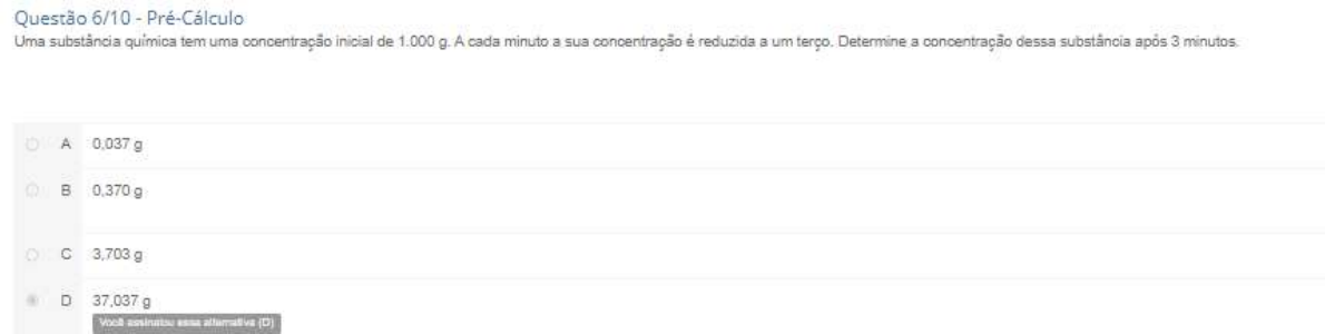 <p>Questão 6/10 - Pré-Cálculo Uma substância química tem uma concentração inicial de 1.000 g. A cada minuto a sua concentração é reduzida a um Determine a concentração dessa substância 3 A 0,037 g B 0,370 g 3,703 g 37,037 g</p>