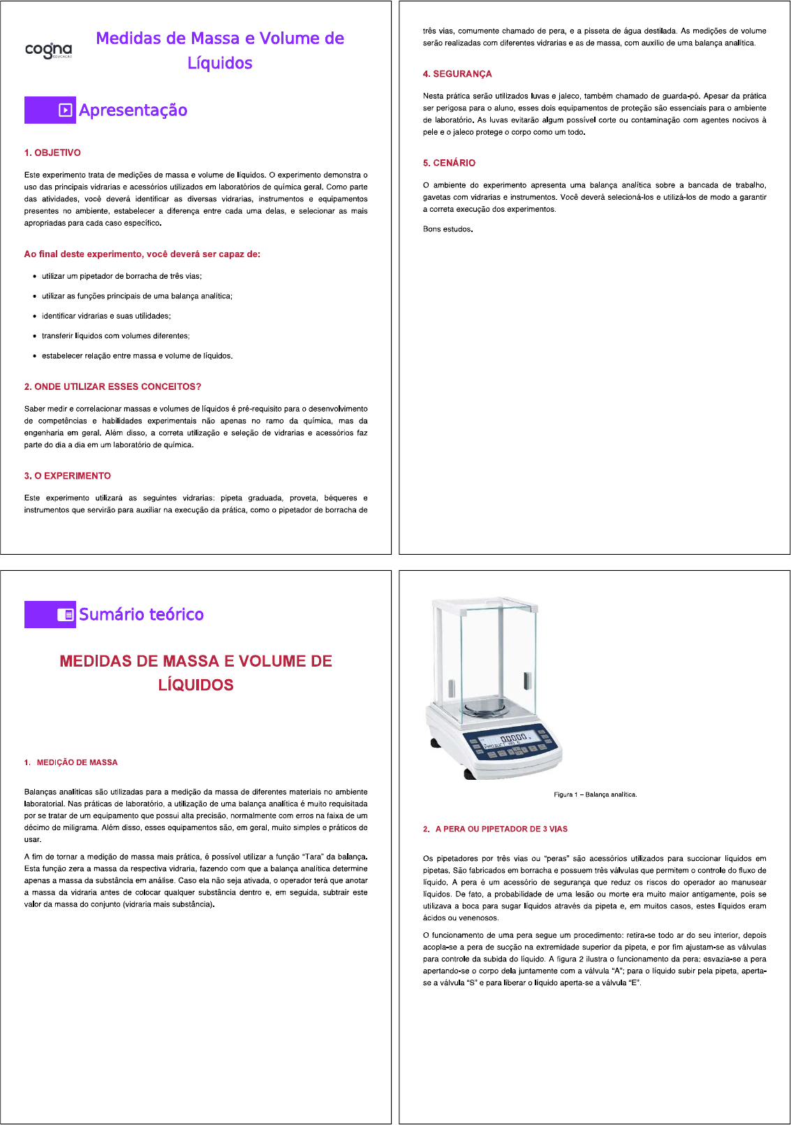 <p>três comumente chamado de pera, e a pisseta de água destilada. As medições de volume Medidas de Massa e Volume de serão realizadas com diferentes vidrarias e as de massa. com auxílio de uma balança analítica. cogna Líquidos 4. SEGURANÇA Nesta prática serão utilizados luvas e jaleco, também chamado de guarda-pó. Apesar da prática Apresentação ser perigosa para o esses dois equipamentos de proteção são essenciais para o ambiente de laboratório. As luvas evitarão algum possível corte ou contaminação com agentes nocivos à pele e o jaleco protege o corpo como um todo. 1. OBJETIVO 5. CENÁRIO Este experimento trata de medições de massa e volume de líquidos. experimento demonstra o uso das principais vidrarias e acessórios utilizados em laboratórios de química geral. Como parte ambiente do experimento apresenta uma balança analítica sobre a bancada de trabalho. das você deverá identificar as diversas vidrarias, instrumentos e equipamentos gavetas com vidrarias e instrumentos. Você deverá selecioná-los e utilizá-los de modo a garantir presentes no ambiente, estabelecer a diferença entre cada uma e selecionar as mais a correta execução dos experimentos apropriadas para cada caso específico. Bons estudos. Ao final deste experimento, você deverá ser capaz de: utilizar um pipetador de borracha de três vias: utilizar as funções principais de uma balança analítica; identificar vidrarias e suas utilidades; transferir líquidos com volumes diferentes; estabelecer relação entre massa e volume de líquidos. 2. ONDE UTILIZAR ESSES CONCEITOS? Saber medir e correlacionar massas e volumes de líquidos é pré-requisito para o desenvolvimento de competências e habilidades experimentais não apenas no ramo da química, mas da engenharia em Além disso. a correta utilização e seleção de vidrarias e acessórios faz parte do dia a dia em um laboratório de 3. o EXPERIMENTO Este experimento utilizará as seguintes vidrarias: pipeta graduada, proveta, béqueres e instrumentos que servirão para auxiliar na execução da prática, como o pipetador de borracha de Sumário teórico MEDIDAS DE MASSA E VOLUME DE LÍQUIDOS 1. MEDIÇÃO DE MASSA Balanças analíticas são utilizadas para a medição da massa de diferentes materiais no ambiente Figura Balança analítica. laboratorial. Nas práticas de laboratório, a utilização de uma balança analítica é muito requisitada por se tratar de um equipamento que possui alta precisão, normalmente com erros na faixa de um décimo de miligrama. Além disso, esses equipamentos são, em muito simples e práticos de 2. A PERA ou PIPETADOR DE 3 VIAS usar. A fim de tornar a de massa mais prática, é possível utilizar a função "Tara" da Os pipetadores por três vias ou "peras" são acessórios utilizados para succionar líquidos em Esta função zera a massa da respectiva fazendo com que a balança analítica determine pipetas. São fabricados em borracha e possuem três válvulas que permitem o controle do fluxo de apenas a massa da substância em análise. Caso ela não seja o operador terá que anotar líquido. A pera é um acessório de segurança que reduz os riscos do operador ao manusear a massa da vidraria antes de colocar qualquer substância dentro e. em seguida, subtrain este líquidos. De fato, a probabilidade de uma lesão ou morte era muito maior antigamente, pois se valor da massa do conjunto (vidraria mais substância). utilizava a boca para sugar líquidos através da pipeta e, em muitos casos, estes líquidos eram ácidos ou o funcionamento de uma pera segue um procedimento: retira-se todo do seu interior, depois acopla-se a pera de sucção na extremidade superior da pipeta, e por fim ajustam-se as válvulas para controle da subida do líquido. A figura 2 ilustra o funcionamento da pera: esvazia-se a pera apertando-se o corpo dela juntamente com a válvula para o líquido subir pela pipeta, aperta- se a válvula "S" e para liberar o líquido aperta-se a válvula</p><p>(A) Retira da pera (S) Succiona água dentro do béquer (E) Libera que se encontra Figura 3 Vidrarias comumente utilizadas em laboratórios de dentro pipeta Figura 2 Pipetador de borracha com três vias. A precisão de uma medida de massa e volume se refere à proximidade entre os resultados de medições de uma mesma quantidade em um mesmo instrumento de É possível uma massa e encontrar valores como 100,06 g. 100.10 ou 99,92 em cada uma das aferições 3. RELAÇÃO ENTRE MASSA E VOLUME DE UM LÍQUIDO realizadas. Exatidão é a concordância entre o valor medido e o real. erro em uma medida é calculado a A densidade relaciona a massa de certo material ao volume que ele ocupa, sendo uma partir do valor que na maioria das vezes é desconhecido Com o objetivo de tornar tão propriedade característica do servindo assim para identificar uma Quando se pequeno quanto possível o desvio em relação a esse deve-se sempre utilizar instrumentos trata de elementos químicos, essa densidade tende a aumentar em direção à região central e de de medida que foram devidamente testados e calibrados. baixo da tabela É possível afirmar que, ao comparar diferentes aquela que possuir menor massa em um mesmo volume também será a que possui menor densidade. Essa É importante salientar que existem vidrarias mais precisas do que Para a medição de relação de densidade pode ser calculada através da fórmula abaixo: volumes de por pode-se utilizar vidrarias não muito precisas. como o béquer ou cilindro graduado ou vidrarias de maior precisão como pipetas volumétricas ou buretas Massa D Volume REFERÊNCIAS BIBLIOGRÁFICAS 4. PRECISÃO DAS MEDIÇÕES As medidas de uma determinada massa ou volume são afetadas por uma conhecida geralmente como desvio ou imprecisão da medida A diferença entre o valor real e o valor CHANGE Raymond; GOLDSBY, Kenneth A. 11. ed. Porto Alegre: 2013. medido consiste no erro da medida Esses erros podem ser sistemáti