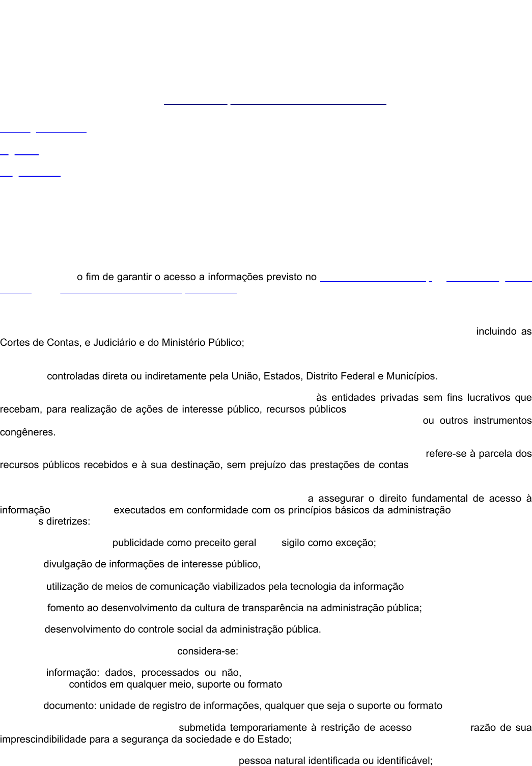 <p>03/10/2023, 12:06 L12527</p><p>https://www.planalto.gov.br/ccivil_03/_ato2011-2014/2011/lei/l12527.htm 1/12</p><p>Presidência da República</p><p>Casa Civil</p><p>Subchefia para Assuntos Jurídicos</p><p>LEI Nº 12.527, DE 18 DE NOVEMBRO DE 2011.</p><p>Mensagem de veto</p><p>Vigência</p><p>Regulamento</p><p>Regula o acesso a informações previsto no inciso XXXIII</p><p>do art. 5º , no inciso II do § 3º do art. 37 e no § 2º do art.</p><p>216 da Constituição Federal; altera a Lei nº 8.112, de 11</p><p>de dezembro de 1990; revoga a Lei nº 11.111, de 5 de</p><p>maio de 2005, e dispositivos da Lei nº 8.159, de 8 de</p><p>janeiro de 1991; e dá outras providências.</p><p>A PRESIDENTA DA REPÚBLICA Faço saber que o Congresso Nacional decreta e eu sanciono a seguinte Lei:</p><p>CAPÍTULO I</p><p>DISPOSIÇÕES GERAIS</p><p>Art. 1º Esta Lei dispõe sobre os procedimentos a serem observados pela União, Estados, Distrito Federal e</p><p>Municípios, com o fim de garantir o acesso a informações previsto no inciso XXXIII do art. 5º , no inciso II do § 3º do</p><p>art. 37 e no § 2º do art. 216 da Constituição Federal.</p><p>Parágrafo único. Subordinam-se ao regime desta Lei:</p><p>I - os órgãos públicos integrantes da administração direta dos Poderes Executivo, Legislativo, incluindo as</p><p>Cortes de Contas, e Judiciário e do Ministério Público;</p><p>II - as autarquias, as fundações públicas, as empresas públicas, as sociedades de economia mista e demais</p><p>entidades controladas direta ou indiretamente pela União, Estados, Distrito Federal e Municípios.</p><p>Art. 2º Aplicam-se as disposições desta Lei, no que couber, às entidades privadas sem fins lucrativos que</p><p>recebam, para realização de ações de interesse público, recursos públicos diretamente do orçamento ou mediante</p><p>subvenções sociais, contrato de gestão, termo de parceria, convênios, acordo, ajustes ou outros instrumentos</p><p>congêneres.</p><p>Parágrafo único. A publicidade a que estão submetidas as entidades citadas no caput refere-se à parcela dos</p><p>recursos públicos recebidos e à sua destinação, sem prejuízo das prestações de contas a que estejam legalmente</p><p>obrigadas.</p><p>Art. 3º Os procedimentos previstos nesta Lei destinam-se a assegurar o direito fundamental de acesso à</p><p>informação e devem ser executados em conformidade com os princípios básicos da administração pública e com as</p><p>seguintes diretrizes:</p><p>I - observância da publicidade como preceito geral e do sigilo como exceção;</p><p>II - divulgação de informações de interesse público, independentemente de solicitações;</p><p>III - utilização de meios de comunicação viabilizados pela tecnologia da informação;</p><p>IV - fomento ao desenvolvimento da cultura de transparência na administração pública;</p><p>V - desenvolvimento do controle social da administração pública.</p><p>Art. 4º Para os efeitos desta Lei, considera-se:</p><p>I - informação: dados, processados ou não, que podem ser utilizados para produção e transmissão de</p><p>conhecimento, contidos em qualquer meio, suporte ou formato;</p><p>II - documento: unidade de registro de informações, qualquer que seja o suporte ou formato;</p><p>III - informação sigilosa: aquela submetida temporariamente à restrição de acesso público em razão de sua</p><p>imprescindibilidade para a segurança da sociedade e do Estado;</p><p>IV - informação pessoal: aquela relacionada à pessoa natural identificada ou identificável;</p><p>http://legislacao.planalto.gov.br/legisla/legislacao.nsf/Viw_Identificacao/lei%2012.527-2011?OpenDocument</p><p>https://www.planalto.gov.br/ccivil_03/_ato2011-2014/2011/Msg/VEP-523.htm</p><p>https://www.planalto.gov.br/ccivil_03/_ato2011-2014/2012/Decreto/D7724.htm</p><p>https://www.planalto.gov.br/ccivil_03/Constituicao/Constituicao.htm#art5xxxiii</p><p>https://www.planalto.gov.br/ccivil_03/Constituicao/Constituicao.htm#art37%C2%A73ii</p><p>https://www.planalto.gov.br/ccivil_03/Constituicao/Constituicao.htm#art37%C2%A73ii</p><p>https://www.planalto.gov.br/ccivil_03/Constituicao/Constituicao.htm#art216%C2%A72</p><p>Genky</p><p>Realce</p><p>Genky</p><p>Realce</p><p>Genky</p><p>Realce</p><p>Genky</p><p>Realce</p><p>Genky</p><p>Realce</p><p>Genky</p><p>Realce</p><p>Genky</p><p>Realce</p><p>Genky</p><p>Realce</p><p>Genky</p><p>Realce</p><p>Genky</p><p>Realce</p><p>Genky</p><p>Realce</p><p>Genky</p><p>Realce</p><p>Genky</p><p>Realce</p><p>Genky</p><p>Realce</p><p>Genky</p><p>Realce</p><p>Genky</p><p>Realce</p><p>Genky</p><p>Realce</p><p>Genky</p><p>Realce</p><p>Genky</p><p>Realce</p><p>Genky</p><p>Realce</p><p>Genky</p><p>Realce</p><p>Genky</p><p>Realce</p><p>Genky</p><p>Realce</p><p>Genky</p><p>Realce</p><p>Genky</p><p>Realce</p><p>Genky</p><p>Realce</p><p>Genky</p><p>Realce</p><p>Genky</p><p>Realce</p><p>Genky</p><p>Realce</p><p>Genky</p><p>Realce</p><p>Genky</p><p>Realce</p><p>Genky</p><p>Realce</p><p>03/10/2023, 12:06 L12527</p><p>https://www.planalto.gov.br/ccivil_03/_ato2011-2014/2011/lei/l12527.htm 2/12</p><p>V - tratamento da informação: conjunto de ações referentes à produção, recepção, classificação, utilização,</p><p>acesso, reprodução, transporte, transmissão, distribuição, arquivamento, armazenamento, eliminação, avaliação,</p><p>destinação ou controle da informação;</p><p>VI - disponibilidade: qualidade da informação que pode ser conhecida e utilizada por indivíduos, equipamentos</p><p>ou sistemas autorizados;</p><p>VII - autenticidade: qualidade da informação que tenha sido produzida, expedida, recebida ou modificada por</p><p>determinado indivíduo, equipamento ou sistema;</p><p>VIII - integridade: qualidade da informação não modificada, inclusive quanto à origem, trânsito e destino;</p><p>IX - primariedade: qualidade da informação coletada na fonte, com o máximo de detalhamento possível, sem</p><p>modifica