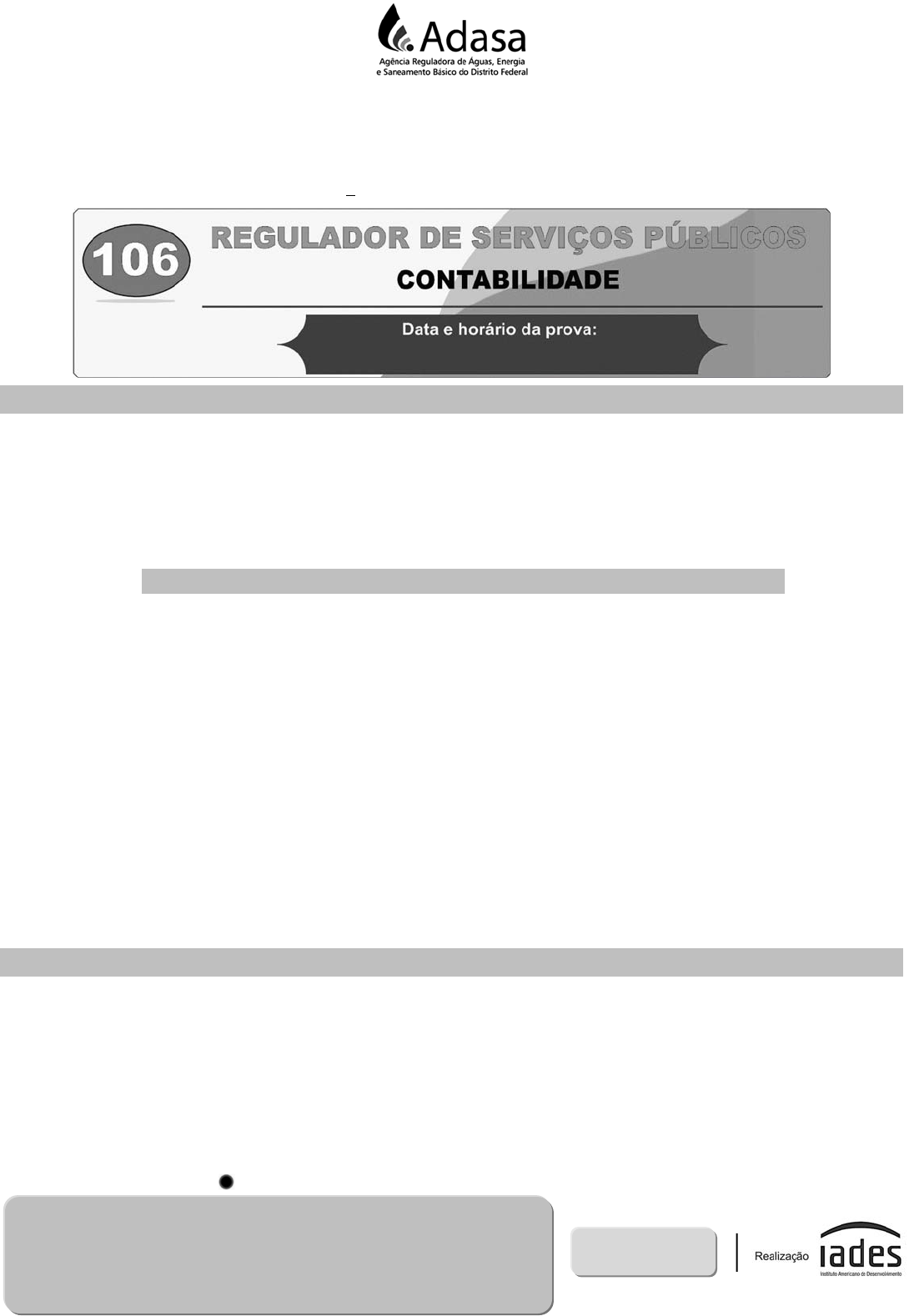 <p>GOVERNO DO DISTRITO FEDERAL</p><p>AGÊNCIA REGULADORA DE ÁGUAS, ENERGIA E SANEAMENTO BÁSICO DO DISTRITO FEDERAL</p><p>CONCURSO PÚBLICO PARA O PROVIMENTO DE VAGAS E PARA A FORMAÇÃO DE CADASTRO DE RESERVA</p><p>NOS CARGOS DE REGULADOR DE SERVIÇOS PÚBLICOS E DE TÉCNICO DE REGULAÇÃO DE SERVIÇOS</p><p>PÚBLICOS DA CARREIRA REGULAÇÃO DE SERVIÇOS PÚBLICOS</p><p>EDITAL NO 1 - ADASA, DE 3 DE MARÇO DE 2020</p><p>Tipo “A”</p><p>Domingo, 7/8/2022, 8 h.</p><p>I N S T R U Ç Õ E S</p><p> Você receberá do fiscal:</p><p>o um caderno de questões das provas objetiva e discursiva contendo 60 (sessenta) questões de múltipla escolha,</p><p>com 5 (cinco) alternativas de resposta cada uma e apenas 1 (uma) alternativa correta, e 2 (duas) questões discursivas;</p><p>o uma folha de respostas personalizada da prova objetiva; e</p><p>o duas folhas de texto definitivo da prova discursiva.</p><p> Quando autorizado pelo fiscal do IADES, no momento da identificação, escreva no espaço apropriado da folha de respostas da</p><p>prova objetiva, com a sua caligrafia usual, a seguinte frase:</p><p>A felicidade não é algo pronto.</p><p> Verifique se estão corretas a numeração das questões e a paginação do caderno de questões, bem como a codificação da folha</p><p>de respostas da prova objetiva e das folhas de texto definitivo da prova discursiva.</p><p> Você dispõe de 4 (quatro) horas e 30 (trinta) minutos para fazer as provas objetiva e discursiva e deve controlar o tempo, pois</p><p>não haverá prorrogação desse prazo. Esse tempo inclui a marcação da folha de respostas da prova objetiva e o preenchimento</p><p>das folhas de texto definitivo da prova discursiva.</p><p> Somente 1 (uma) hora após o início da prova, você poderá entregar sua folha de respostas da prova objetiva, as folhas de texto</p><p>definitivo da prova discursiva e o caderno de provas, bem como retirar-se da sala.</p><p> Somente será permitido levar o caderno de questões das provas objetiva e discursiva 3 (três) horas e 23 (vinte e três) minutos</p><p>após o início da prova.</p><p> Após o término da prova, entregue ao fiscal do IADES a folha de respostas da prova objetiva, devidamente assinada, e as folhas de texto</p><p>definitivo da prova discursiva.</p><p> Deixe sobre a carteira apenas o documento de identidade e a caneta esferográfica de tinta preta, fabricada com material transparente.</p><p> Não é permitida a utilização de nenhum aparelho eletrônico ou de comunicação.</p><p> Não é permitida a consulta a livros, dicionários, apontamentos e (ou) apostilas.</p><p> Você somente poderá sair e retornar à sala de aplicação de provas na companhia de um fiscal do IADES.</p><p> Não será permitida a utilização de lápis em nenhuma etapa da prova.</p><p>I NS T RU Ç Õ ES P A R A A S P R O V AS O B J ETI V A E D I S C UR S IV A</p><p> Verifique se os seus dados estão corretos na folha de respostas da prova objetiva e nas folhas de texto definitivo da prova</p><p>discursiva. Caso haja algum dado incorreto, comunique ao fiscal.</p><p> Leia atentamente cada questão e assinale, na folha de respostas da prova objetiva, uma única alternativa.</p><p> A folha de respostas da prova objetiva e as folhas de texto definitivo da prova discursiva não podem ser dobradas, amassadas,</p><p>rasuradas ou manchadas e nem podem conter nenhum registro fora dos locais destinados às respostas.</p><p> O candidato deverá transcrever, com caneta esferográfica de tinta preta, as respostas da prova objetiva para a folha de respostas</p><p>e os textos definitivos da prova discursiva para as folhas de texto definitivo.</p><p> A maneira correta de assinalar a alternativa na folha de respostas da prova objetiva é cobrir, fortemente, com caneta</p><p>esferográfica de tinta preta, o espaço a ela correspondente.</p><p> Marque as respostas assim:</p><p>CONCURSO PÚBLICO – ADASA REGULADOR DE SERVIÇOS PÚBLICOS</p><p>106 – CONTABILIDADE – TIPO “A” PÁGINA 2/20</p><p>P R O V A O B J E T I V A</p><p>CONHECIMENTOS GERAIS</p><p>Questões de 1 a 30</p><p>LÍNGUA PORTUGUESA</p><p>Questões de 1 a 7</p><p>Texto 1 para responder às questões de 1 a 4.</p><p>1</p><p>4</p><p>7</p><p>10</p><p>13</p><p>16</p><p>19</p><p>22</p><p>25</p><p>28</p><p>31</p><p>34</p><p>37</p><p>40</p><p>43</p><p>46</p><p>49</p><p>52</p><p>Aproveitamento de águas pluviais e reúso de águas</p><p>cinzas em edificações</p><p>Aproveitar a água da chuva de telhados ou até mesmo</p><p>reutilizar água do enxague de máquinas de lavar roupa para</p><p>molhar jardins e lavar pisos é uma prática que vem sendo</p><p>realizada há anos em residências brasileiras de maneira</p><p>rústica, como alternativa para reduzir os gastos com a conta</p><p>de água. Nas últimas duas décadas, houve um aumento na</p><p>procura e na oferta de sistemas hidráulicos que facilitem o</p><p>aproveitamento de águas pluviais e o reúso de águas cinzas</p><p>em diversos usos não potáveis nas mais variadas tipologias</p><p>de edificações em prol da sustentabilidade. Dessa maneira,</p><p>surge um novo modelo de abastecimento descentralizado no</p><p>País, que faz uso de fontes alternativas de água em usos não</p><p>potáveis. Sistemas de aproveitamento de águas pluviais e de</p><p>reúso de águas cinzas são capazes de promover reduções</p><p>significativas no consumo predial e de garantir um</p><p>abastecimento contínuo nas principais atividades</p><p>consumidoras de água em caso de cortes no abastecimento</p><p>público – como foi observado na crise hídrica de 2014. Essa</p><p>medida, tomada em larga escala, é capaz de reduzir os</p><p>impactos gerados pela exploração de recursos hídricos.</p><p>O Distrito Federal (DF) vivenciou uma crise hídrica</p><p>sem precedentes em sua história. A seca de 2016 reduziu</p><p>drasticamente os níveis dos principais reservatórios, o que</p><p>fez com que a Barragem do Descoberto, que abastece 