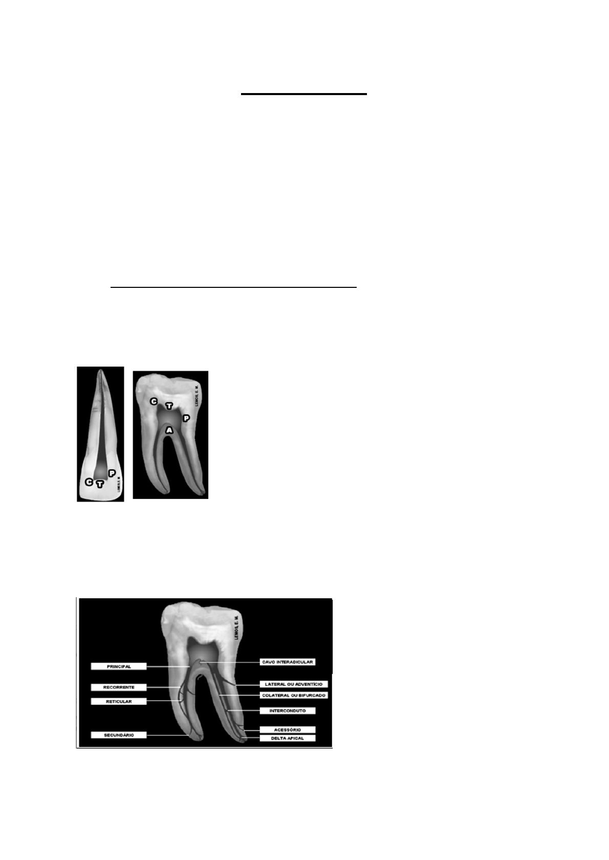 <p>Endodontia</p><p>Para uma endo de sucesso é necessário ter :</p><p>● Uma boa análise radiográfica : Observar o volume da câmara pulpar e presença de</p><p>cárie,presença de curvaturas acentuadas, presença de nódulos pulpares e</p><p>calcificações</p><p>● Uma boa exploração do canal</p><p>● Um bom conhecimento anatômico interno geral e individual dos dentes</p><p>1. Anatomia interna geral dos dentes :</p><p>→ Cavidade Pulpar :</p><p>- Espaço onde a polpa do dente está presente</p><p>- Se divide em câmara pulpar e canal radicular</p><p>- A câmara pulpar é composta por faces</p><p>A : Assoalho</p><p>C: Cornos pulpares ( extremidade da câmara pulpar)</p><p>P : Paredes</p><p>T : Teto da câmara pulpar</p><p>- O canal principal radicular se ramifica em variados :</p><p>Na ponta do assoalho ( região cervical</p><p>do canal) da câmara pulpar há o cavo inter radicular; no ápice do canal há o canal delta</p><p>apical.</p><p>- O canal radicular é dividido em terços : Cervical, médio e apical</p><p>Na sua porção há apical, o canal delta apical forma um forame principal e foraminas; há</p><p>presença de um canal cementário e dentinário ( canal principal) e há uma diminuição do</p><p>diâmetro do canal nas proximidades do canal dentinário e canal cementário ( CDC)--></p><p>chamado de cone invertido → ele tem em torno de 0,5 a 1 mm de distância.</p><p>Obs : A câmara pulpar pode ter alterações volumétricas podendo ser fisiológicas, como</p><p>idade avançada ou não fisiológica, como processo carioso</p><p>1.1 Anatomia dos dente anteriores e pré-molares :</p><p>a) Incisivo central superior: Possui apenas 1 canal, com uma raiz cônica piramidal de</p><p>forma mais retilínea→ Ao “cortar” a raiz no “meio” conseguimos ver que sua secção</p><p>é circular, com comprimento médio de 23mm</p><p>b) Incisivo lateral superior : Possui apenas 1 canal, com uma raiz trapeizodal com um</p><p>achatamento mésio-distal e inclinação no sentido disto palatino→ Ao “cortar” a raiz</p><p>no “meio” conseguimos ver que sua secção é circular , com comprimento médio de</p><p>22 mm</p><p>c) Incisivo inferiores : Possui apenas 1 canal, com uma raiz trapezoidal de pequeno</p><p>volume e um achatamento mésio-distal acentuado formando nas suas faces</p><p>proximais,mormente na distal, sulcos, normalmente possui forame único → Ao</p><p>“cortar” a raiz no “meio” conseguimos ver que sua secção é elipsóide , com</p><p>comprimento médio de 21 mm.</p><p>d) Canino superior : Possui apenas um canal, com uma raiz cônica piramidal de grande</p><p>volume mais retilínea, apresentando uma curvatura disto-vestibular —> Ao “cortar” a</p><p>raiz no “meio” conseguimos ver que sua secção é circular, com comprimento médio</p><p>de 27 mm</p><p>e) Canino inferior : Possui apenas um canal com uma raiz cônica piramidal mais</p><p>achatada mesio distalmente que o superior, normalmente apresenta forame único,</p><p>Ao “cortar” a raiz no “meio” conseguimos ver que sua secção é ovóide, com</p><p>comprimento médio de 25 mm</p><p>f) Primeiro pré molar superior: Apresenta dois canais, com duas raízes com maior</p><p>achatamento na raiz vestibular —> Ao “cortar” a raiz no “meio” conseguimos ver que</p><p>sua secção na porção cervical e medial mais circular e na porção apical mais ovóide,</p><p>com comprimento médio de 21 mm. Obs : pode ter variedades na divisão e fusão</p><p>g) Segundo pré molar superior : Apresenta apenas um canal, com uma raiz com</p><p>achatamento bem acentuado → Ao “cortar” a raiz no “meio” conseguimos ver que</p><p>sua secção é elíptica, com comprimento médio de 22 cm. obs : Pode haver</p><p>duplicidade de cana em raiz bifurcada ou em raiz única</p><p>h) Primeiro pré molar inferior : Apresenta um canal, com uma raiz achatada mesio</p><p>distalmente e com uma curvatura disto-lingual, com maior diametro V-L→ Ao “cortar”</p><p>a raiz no “meio” conseguimos ver que sua secção na região cervical e media é</p><p>ovalada e na apical circular, com comprimento médio de 22 cm. Obs : Pode</p><p>apresentar dois ou três canais com divisão ao nível médio ou apical</p><p>i) Segundo pré molar inferior :Anatomicamente parecido com o 1 PMI, apenas muda</p><p>que possui menos frequência de possuir dois canais.</p><p>OBS : Variações anatômicas : o incisivo inferior pode apresentar dois canais ; o canino</p><p>inferior pode apresentar uma bifurcação radicular; dens in dente → invaginação da camada</p><p>intermediária da papila dental, os dentes que ocorre com mais frequência são os ILS; Fusão</p><p>—> junção de duas coroas com uma única raiz</p><p>2. Instrumentos endodônticos:</p><p>2.1 - Instrumental Clínico :</p><p>- Escavador de dente: Retira a dentina amolecida</p><p>- Sonda exploradora reta e número 5 : Analisar se há ainda teto</p><p>- Sonda milimetrada : Avaliar o periodonto</p><p>2.2 - Diagnóstico :</p><p>- Espelho : Dar umas batidas no dente para ver se o paciente sente dor</p><p>- Endo- frost : Analisar se há polpa ainda está viva ou morta por meio de uma</p><p>temperatura de -50 graus ( teste para o frio)</p><p>- Guta percha : teste para o quente</p><p>- Radiografia</p><p>2.3 - Anestesia : Carpule e anestésico</p><p>2.4 - Cirurgia de acesso : Necessário o uso de instrumentos rotatórios ( caneta de</p><p>alta )</p><p>- Uso de broca esférica carbide de número 2 e 4 ; ou Pontas diamantadas de</p><p>número 1011-1016, dependendo do dente que vai ser acessado → Começar</p><p>acessar o dente.</p><p>- Uso de brocas tronco cônicas/endo-z, long neck ou transmetal→ para</p><p>remover o teto —> entrar com ela a 45 graus</p><p>2.5 - Isolamento : Grampos ( 00,2,2A,3,7,8,8A,9,14), lençol de borracha , porta</p><p>grampo, pinça e arco de ostby</p><p>2.6- Preparo da embocadura</p><p>- Broca largo :Possui uma forma cilíndrica, possu