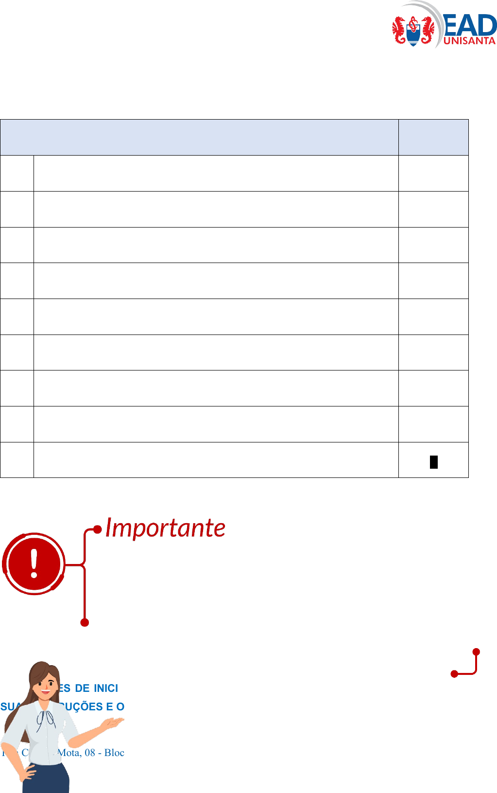 <p>INSTITUTO SUPERIOR DE EDUCAÇÃO SANTA CECÍLIA</p><p>C.N.P.J. 58.251.711/0001-19 - Santos-SP</p><p>Curso de Licenciatura em Educação Especial</p><p>RELAÇÃO DOS FORMULÁRIOS PARA REALIZAÇÃO DO ESTÁGIO CURRICULAR SUPERVISIONADO</p><p>ITENS NECESSÁRIOS EM SUA PASTA DE ESTÁGIO:</p><p>Checagem</p><p>1.</p><p>Carta de Apresentação para Estágio (opcional)</p><p>X</p><p>2.</p><p>Ficha de informações gerais sobre o (a) aluno (a) estagiário (a)</p><p>X</p><p>3.</p><p>Ficha de registro de frequência</p><p>X</p><p>4.</p><p>Ficha de Avaliação do (a) estagiário (a) pela Instituição Concedente</p><p>X</p><p>5.</p><p>Declaração de Conclusão de Estágio pela Instituição Concedente</p><p>X</p><p>6.</p><p>Comprovante de Realização de Estágio Supervisionado</p><p>X</p><p>7.</p><p>Entrevista com um profissional da Instituição concedente do estágio</p><p>X</p><p>8.</p><p>Relatório de observação do estágio</p><p>X</p><p>9.</p><p>Plano de Aula alinhado à BNCC</p><p>X</p><p>Apenas a Carta de Apresentação e a Ficha de Informações Gerais sobre o aluno (itens 1 e 2) deverão ser preenchidos manuscritos. Os demais documentos devem ser digitados em computador.</p><p>Sua pasta deve conter todos os itens, com exceção da “Carta de apresentação”, pois ela pode ficar no local onde você fez o estágio. Caso não fique com a escola, inclua-a na pasta.</p><p>Ao final todos os itens devem ser convertidos em .pdf (arquivo único) e entregues via AVA na página da disciplina.</p><p>ANTES DE INICIAR O SEU ESTÁGIO LEIA O GUIA DA DISCIPLINA NO AVA E SIGA SUAS INSTRUÇÕES E ORIENTAÇÕES. SE NECESSÁRIO, ACESSE NOSSA ÁREA DE APOIO TÉCNICO E VEJA NOSSOS TUTORIAIS.</p><p>O SEU ESTÁGIO CURRICULAR SUPERVISIONADO DEVERÁ OCORRER OBRIGATORIAMENTE EM INSTITUIÇÕES REGULARES, CONFORME DESCRIÇÃO ABAIXO:</p><p>Modalidade</p><p>Carga-horária de observação</p><p>Carga-horária de</p><p>relatório</p><p>Educação Básica</p><p>160h</p><p>40h</p><p>Este estágio poderá ser realizado em instituições como:</p><p>Escolas de educação básica (ed. Infantil, ensino fundamental, ensino médio e/ou EJA).</p><p>Em caso de dúvidas sobre o aceite da instituição em que você tem interesse em estagiar, procure orientação de sua tutora ou professora da disciplina.</p><p>ATENÇÃO! – LEIA AS INSTRUÇÕES ACIMA!</p><p>OBJETIVOS ESPERADOS PARA O ESTÁGIO CURRICULAR SUPERVISIONADO:</p><p>· Conhecer a realidade educacional em diferentes aspectos, como: físico, pedagógico e administrativo;</p><p>· Observar, refletir e propor ações para auxiliar de forma qualitativa a construção do conhecimento aliado à realidade observada;</p><p>· Analisar os diferentes aspectos que envolvem o cotidiano escolar dos estudantes;</p><p>· Envolver os alunos nas mais diferentes situações escolares;</p><p>· Estimular os alunos/professores a observarem de maneira investigativa as produções das crianças, para encontrarem nelas elementos que lhes permitam compreender o momento de aprendizagem de cada um;</p><p>INSTITUTO SUPERIOR DE EDUCAÇÃO SANTA CECÍLIA</p><p>C.N.P.J. 58.251.711/0001-19 - Santos-SP</p><p>Curso de Licenciatura em Educação Especial</p><p>· Apresentar o relatório final de estágio e sua produtividade quando estiver, futuramente, atuando como docente.</p><p>EAD UNISANTA</p><p>Rua Cesário Mota, 08 - Bloco F, Sala F12 – Boqueirão – Santos/SP – CEP 11045-040 – Tel. (13) 3202-7159</p><p>3. FICHA DE REGISTRO DE FREQUÊNCIA EM ESTÁGIO CURRICULAR SUPERVISIONADO EM ED. BÁSICA</p><p>Nome do estagiário: Rosangela Cristina de Sousa</p><p>RA: 225125</p><p>Semestre: 4° semestre</p><p>Ano:2024</p><p>Data de início do estágio: 01-08-2024</p><p>Data de término: 09-09-2924</p><p>Horas realizadas: 200h</p><p>Instituição: EM ANTONIO MARQUES FIGUEIRA</p><p>Endereço:Rua Sara Cooper nº 2</p><p>Cidade:Suano</p><p>CEP: 08674-249</p><p>Fone:11 989380432</p><p>DATA</p><p>SÉRIE/ANO</p><p>DESCRIÇÃO DAS ATIVIDADES ACOMPANHADAS NO DIA</p><p>(usar uma linha para cada dia - crie cópias da página se necessário)</p><p>CARGA</p><p>HORÁRIA</p><p>(em horas)</p><p>RÚBRICA DO PROF. TITULAR DA SALA</p><p>01/08/24</p><p>5ºC</p><p>Leitura e interpretação de texto ((gênero Fábula) A cigarra e a formiga), Noção de fração)</p><p>05</p><p>02/08/24</p><p>5ºC</p><p>Foco Narrativo Fábula: A cigarra e a formiga: Fração Simples. Cores e Universo</p><p>05</p><p>0/08/24</p><p>5ºC</p><p>Discurso Direto e indireto. Adição de Fração. Jogos Cooperativos</p><p>05</p><p>06/08/24</p><p>5ºC</p><p>Discurso Direto e indireto. Adição de Fração. Jogos Cooperativos História ria das Capitanias.</p><p>05</p><p>07/08/24</p><p>5ºC</p><p>Discurso Direto e indireto. Adição de Fração. História ria das Capitanias.</p><p>05</p><p>08/08/24</p><p>5ºC</p><p>Gramática. Sílabas Tônicas. Cores Frias. Releitura O quarto.</p><p>05</p><p>09/08/24</p><p>5ºC</p><p>Ciclo da Água. Sequência Didática Fábulas. Problemas com frações</p><p>05</p><p>12/08/24</p><p>5ºC</p><p>Continuação Releitura O Quarto. Sequência didática fábula. Problemas com frações</p><p>05</p><p>13/08/24</p><p>5ºC</p><p>Sequência Didática Fábulas. Capitanias Hereditárias. Mapas</p><p>05</p><p>14/08/24</p><p>5ºC</p><p>Sequência Didática Fábulas. Regras Jogos Cooperativos</p><p>05</p><p>16/08/24</p><p>5ºC</p><p>Sequência Didática Fábulas. Leitura de obra de Arte: O Grito.</p><p>05</p><p>19/08/24</p><p>5ºC</p><p>Sequência Didática Fábulas. Leitura de obra de Arte: O Grito. Mapas</p><p>05</p><p>2008/24</p><p>5ºC</p><p>Sequência Didática Fábulas. Jogos com regras. Subtração de Frações</p><p>05</p><p>2108/24</p><p>5ºC</p><p>Sequência Didática Fábulas. Fração Própria e impropria</p><p>05</p><p>2208/24</p><p>5ºC</p><p>Sequência Didática Fábulas Fração Própria e impropria</p><p>05</p><p>2308/24</p><p>5ºC</p><p>Fração Própria e impropria. Tratado de Tordesilhas. Ciclo d’água.</p><p>0