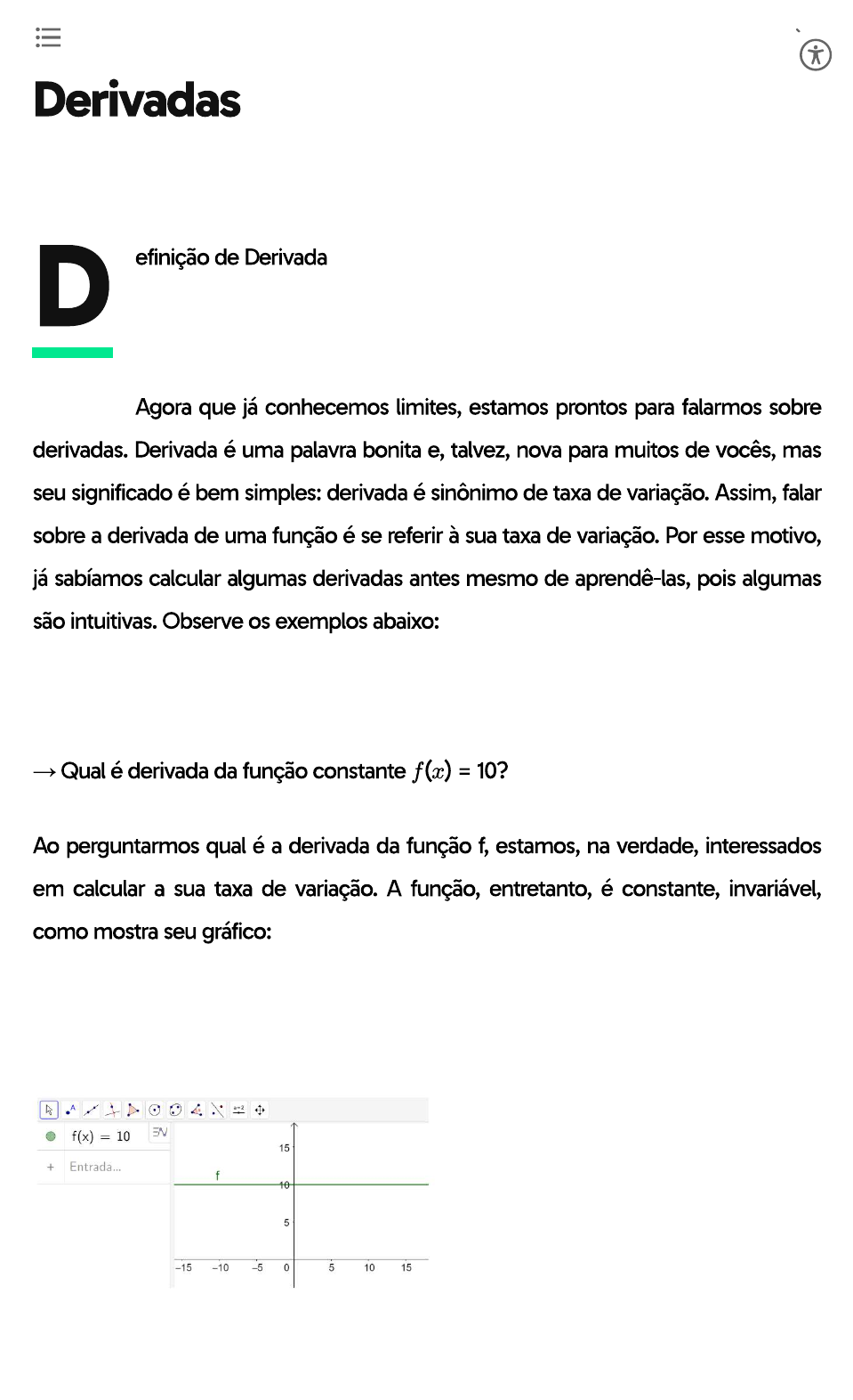 <p>Derivadas efinição de Derivada D Agora que já conhecemos limites, estamos prontos para falarmos sobre derivadas. Derivada é uma palavra bonita e, talvez, nova para muitos de vocês, mas seu significado é bem simples: derivada é sinônimo de taxa de variação. Assim, falar sobre a derivada de uma função é se referir à sua taxa de variação. Por esse motivo, já sabíamos calcular algumas derivadas antes mesmo de aprendê-las, pois algumas são intuitivas. Observe os exemplos abaixo: Qual é derivada da função constante = Ao perguntarmos qual é a derivada da função f, estamos, na verdade, interessados em calcular a sua taxa de variação. A função, entretanto, é constante, invariável, como mostra seu gráfico: .A + f(x) = 10 EN 15 Entrada... f 10 5 -15 -10 -5 0 5 10 15</p><p>Por isso, sua derivada é zero. Uma casa de shows cobra cinquenta reais de entrada e mais 10 reais por bebida consumida. Como vimos na aula 4, a função que modela matematicamente esse contexto é f(x) = 50 + 10x, sendo X quantidade de bebida consumida. Qual é a derivada dessa função? Para responder a essa pergunta, precisamos lembrar que derivada é a taxa de variação. Nesse sentido, o que faz a função dos gastos variar é justamente a quantidade de bebidas consumidas. A entrada é invariável, custa R$ 50,00, não há discussão quanto a isso. que vai determinar gasto dessa pessoa é a quantidade de bebida consumida. Quantidade de Bebidas Total Gasto 1 60 2 70 3 80 4 90 5 100 Reparemos na variação do total gasto. A cada bebida consumida a mais, total de gastos aumenta em R$ 10,00. Este valor não é aleatório, é, justamente, o valor da bebida. Ou seja, a taxa de variação é de 10 unidades. Assim, a derivada da função f(x) = 50 + 10x é 10. É interessante notar que, na aula de função do primeiro grau, vimos que o coeficiente angular da função, o número que multiplica X é a taxa de variação da função. Por isso, o resultado é imediato:</p><p>A derivada de uma função do primeiro grau é seu próprio coeficiente angular Definição Geométrica de Derivada Temos desenhado abaixo gráfico de uma função que relaciona a produção de uma empresa e seu respectivo lucro. Lucro (L) Produção (P) 3 5 10 20 Para avaliarmos derivada dessa função, não é de todo estranho usarmos retas tangentes. Observe: Lucro (L) Produção (P) 3 5 10 20</p><p>Como podemos notar, a seta roxa representa um cenário de crescimento do uma taxa de variação positiva do lucro. A seta azul representa o momento em qu lucro se estabiliza antes de começar a cair. Por fim, a seta vermelha representa o cenário de queda do lucro, uma taxa de variação negativa deste. Com esse exemplo, queremos mostrar que a reta tangente ao gráfico de uma função possui um papel fundamental na derivada. Formalmente falando, temos: A derivada de uma função em um ponto P é igual ao coeficiente angular da reta tangente à função no ponto P. Para entender melhor essa definição de derivada, mas definir o que é a taxa de variação da função entre dois pontos. Seja uma função f e P(a,f(a)) e Q(x,f(x)) dois de seus pontos. A taxa de variação da função f entre os pontos P e Q é dada pela seguinte fórmula: A Taxa de Variação = : x-a y f(x)-f(a) P(a,f(a)) x-a 0 a À medida em que o ponto Q se aproxima de P, o segmento azul, que é secante à função, altera-se. Quando P e Q se encontram, a reta secante vira uma reta</p><p>tangente: y A t Q Q P Q 0 Para que P e Q se encontrem, as suas abscissas precisam ser iguais. Assim, a derivada de uma função em um ponto específico é o limite. A derivada de uma função em um denotada por é Se limite Onde queremos chegar é o que já dissemos anteriormente: a derivada de uma função em um ponto P é o coeficiente angular da reta tangente à função neste ponto P. Além disso, há três símbolos para designar a derivada de uma função: * f(x) * Sx * Sx</p><p>Cálculo de derivadas Já vimos algumas regras de derivação anteriormente. Vamos aprender algumas outras. Derivada da função constante: = Derivada da função de primeiro grau: Derivada da função polinomial: Se entao Esta regra é chamada de regra do tombo Por exemplo, se podemos facilmente calcular sua derivada pela regra do tombo:</p><p>Podemos, também, calcular a derivada de qualquer função pelo GeoGebra usando o comando derivada. EN + der Derivada Derivada ? Função Função Basta selecionar a função fe teremos sua derivada instantaneamente. EN = Derivada(f) Propriedades das derivadas Regra de multiplicação por constante:</p><p>Exemplo: Calcule a derivada da função Regra da soma: a derivada de uma soma é a soma das derivadas. Exemplo: Calcule a derivada da função = Regra do produto: Exemplo: Calcule a derivada da função</p><p>Regra do quociente: Exemplo: Calcule a derivada da função = = x4 Atividade Extra A definição formal de derivada como sendo o coeficiente angular da reta tangente ao gráfico não é simples de ser entendida. Por isso, separamos um vídeo para não restar dúvida!</p><p>Bibliografia Flemming, D. M; Gonçalves, M. B. Cálculo A: Funções, Limite, Derivação, Integração. São Paulo: Pearson Prentice Hall. 2006. Fernandes, D. B. Cálculo Diferencial. São Paulo: Pearson Prentice Hall. 2014. Stewart, James. Cálculo, volume I. São Paulo: Cengage Learning, 2013. In para exercício</p>