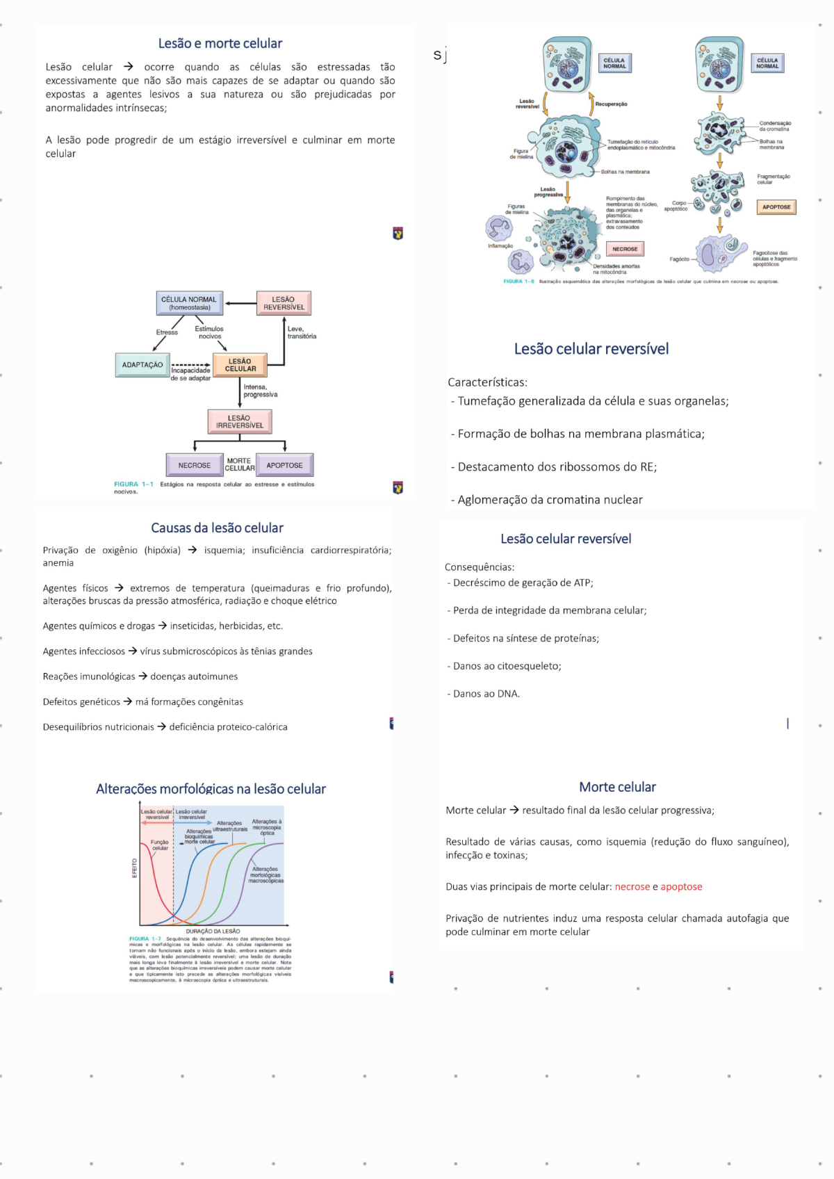 <p>Lesão e morte celular S Lesão celular ocorre quando as células são estressadas tão NORMAL NORMAL excessivamente que não são mais capazes de se adaptar ou quando são expostas a agentes lesivos a sua natureza ou são prejudicadas por Lesão Recuperação anormalidades intrínsecas; da cromatina A lesão pode progredir de um estágio irreversível e culminar em morte Bolhas na endoplasmático mitocôndria membrana celular Figura de mielina membrana Fragmentação celular Lesão progressiva Rompimento das Figuras membranas Corpo APOPTOSE de mielina das organelas apoptótico extravasamento dos conteúdos NECROSE Fagocitose das células fragmento apoptóticos na mitocôndria FIGURA das alterações da lesão celular que culmina em necrose ou apoptose NORMAL LESÃO (homeostasia) REVERSÍVEL Estímulos Etresss Leve. nocivos transitória Lesão celular reversível LESÃO ADAPTAÇÃO Incapacidade CELULAR de adaptar Características: progressiva - Tumefação generalizada da célula e suas organelas; LESÃO IRREVERSÍVEL Formação de bolhas na membrana plasmática; MORTE NECROSE CELULAR APOPTOSE Destacamento dos ribossomos do RE; 1-1 Estágios na resposta celular ao estresse e nocivos. Aglomeração da cromatina nuclear Causas da lesão celular Lesão celular reversível Privação de oxigênio (hipóxia) isquemia; insuficiência cardiorrespiratória; anemia Consequências: Decréscimo de geração de ATP; Agentes físicos extremos de temperatura (queimaduras e frio profundo), alterações bruscas da pressão atmosférica, radiação e choque elétrico Perda de integridade da membrana celular; Agentes químicos e drogas inseticidas, herbicidas, etc. Defeitos na síntese de proteínas; Agentes infecciosos vírus submicroscópicos às tênias grandes - Danos ao citoesqueleto; Reações imunológicas doenças autoimunes Danos ao DNA. Defeitos genéticos má formações congênitas Desequilíbrios nutricionais deficiência proteico-calórica Alterações morfológicas na lesão celular Morte celular Lesão celular Lesão celular Morte celular resultado final da lesão celular progressiva; reversivel Alterações Alterações à Alterações ultraestruturais microscopia Função - morte celular Resultado de várias causas, como isquemia (redução do fluxo sanguíneo), celular infecção e toxinas; Alterações morfologicas Duas vias principais de morte celular: necrose e apoptose Privação de nutrientes induz uma resposta celular chamada autofagia que DURAÇÃO DA LESÃO pode culminar em morte celular FIGURA 1-7 do desenvolvimento das alterações bioqui micas morfológicas na lesão As células rapidamente se não funcionais após inicio da embora estejam ainda com lesão potencialmente uma lesão de duração mais longa leva finalmente lesão irreversível morte celular Note que as alterações irreversíveis podem causar morte celular e que tipicamente isto precede as alterações morfológicas visíveis microscopia ultraestruturais.</p><p>Necrose celular CÉLULA NORMAL Resulta da desnaturação de proteínas intracelulares e da Lesão Recuperação digestão enzimática das células lesadas letalmente; reticulo endoplasmático mitocôndria Figura mielina Células necróticas são incapazes de Bolhas manter a integridade da membrana Lesão e seus conteúdos sempre progressiva Rompimento das Figuras membranas núcleo extravasam, um processo que pode de mielina das organela travasamento iniciar inflamação no tecido dos conteúdos circundante; NECROSE amortas na mitocôndria Apoptose NORMAL Via de morte celular induzida por um programa de estritamente regulado no qual as células destinadas a morrer ativam enzimas que degradam o seu próprio DNA e as proteínas nucelares e Condensação citoplasmáticas; da cromatina Bolhas na membrana Células apoptóticas se quebram nos chamados Fragmentação corpos apoptóticos e são fagocitados; celula Corpo APOPTOSE A morte por essa via não inicia uma resposta inflamatória no hospedeiro, uma vez que as células mortas e seus fragmentos são rapidamente Fagocitose das fagocitados antes de extravasarem seu células fragmento apoptóticos Degenerações celulares Processo patológico caracterizado por modificações da morfologia das células com diminuição de suas funções. Cada degeneração ocorrida é dividida de acordo com a natureza da substância acumulada (classificação de Letterer): Degeneração Hidrópica: acúmulo de água e eletrólitos (sódio, principalmente). - Degeneração Hialina: acúmulo de proteínas no interior das - Degeneração acúmulo de lipídeos dentro das - Degeneração Glicogênica: acúmulo de carboidratos dentro das Degeneração Mucoide: acúmulo de muco, ocorrendo de forma mais específica em locais onde existam células Os acúmulos citados ocorrem no citoplasma, nas organelas citoplasmáticas e no núcleo. Consequências da degeneração para os tecidos: as organelas citoplasmáticas e núcleo ficam comprimidos e deslocados para a periferia, comprometendo a função Degeneração hidrópica Figura 04 Rim. Degeneração Observar vacuolização celular com contornos imprecisos no epitélio tubular (setas). HE Objetiva 40x</p>