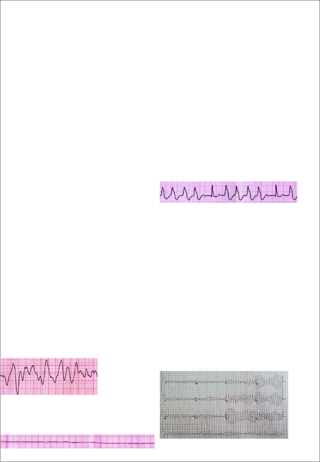 <p>Arritmias cardíacas</p><p>Sistema de condução elétrico intracardíaco</p><p>· Nó sinusal, nó atrioventricular, feixe juncional ou de His, ramos direito e esquerdo e fibras de Purkinje</p><p>ARRITMIAS: análise das ondas P, PR e complexo QRS</p><p>Mecanismos</p><p>· Alteração do automatismo cardíaco: aceleração ou desaceleração automática de alguma estrutura</p><p>· Distúrbios de condução atrioventricular</p><p>· Combinações de distúrbios de automatismo e de condução</p><p>4Ds</p><p>· Dizziness: tontura, sonolência (alteração da consciência por DC pela arritmia?)</p><p>· Dispneia (insuficiência respiratória, congestão pulmonar devido à arritmia?)</p><p>· Dor torácica (dor torácica com características isquêmicas?)</p><p>· Down pressure: hipotensão (sinais de choque ou DC?)</p><p>QRS não é identificado</p><p>· Fibrilação ventricular</p><p>· Origem ventricular, desorganizado, representando a despolarização caótica dos ventrículos</p><p>· Despolarização não gera contração ventricular coordenada e efetiva, gerando parada cardíaca</p><p>· ECG: não se identifica QRS, FC e caótica, ritmo irregular, sem onda P, complexo QRS, segmento ST ou onda T</p><p>· Desfibrilação elétrica</p><p>· Assistolia</p><p>· Ausência de atividade elétrica ventricular</p><p>· Adrenalina</p><p>· Taquicardia ventricular</p><p>· ≥ 3 batimentos sucessivos de origem ventricular, com FC > 120bpm e QRS > 0,12s</p><p>· ECG: FC > 100, ritmo regular, onda P não visível, QRS, ST e onda T serrilhados com duração > 0,12 segundos</p><p>· Monomórfica: morfologia do QRS é constante</p><p>· Polimórfica: morfologia do QRS varia</p><p>· Estabilidade hemodinâmica + QT prévio normal: amiodarona</p><p>· Estabilidade hemodinâmica + QT aumentado: lidocaína</p><p>· Se instabilidade hemodinâmica: cardioversão elétrica</p><p>· Torsades de pointes (torção da ponta)</p><p>· Tipo de TV polimórfica</p><p>· QRS parecem estar mudando de eixo após cada 5 a 20 batimentos</p><p>· Normalmente desencadeado por distúrbios metabólicos (hipomagnesia, hipocalcemia), alargamentos do intervalo QT e efeito pró-arrítmico de alguma droga (quinidina)</p><p>· Desfibrilação elétrica com carga máxima, sulfato de magnésio, lidocaína, marca-passo com alta frequência e suspensão de fármacos que aumentem o intervalo QT</p><p>· Extrassístole ventricular</p><p>· QRS de aspecto anormal (> 0,12ms) intercalados com QRS normais</p><p>· ECG: QRS aberrante, ritmo irregular, onda P oculta pela ESV</p><p>Onda P identificada</p><p>· Fibrilação atrial</p><p>· ECG: frequência ventricular entre 160 e 180, ritmo irregular (devido ao bloqueio AV fisiológico), ondas P diferentes umas das outras, intervalo QRS normal</p><p>· Aguda: 1º episódio com > 30 segundos</p><p>· Crônica</p><p>· Paroxística: redução espontânea da arritmia e sem tratamento de manutenção</p><p>· Persistente: tratamento específico para reversão</p><p>· Permanente: cardioversão química ou elétrica falharam</p><p>· Recorrente: ≥ 2 episódios, fazer anticoagulação e controle da FC</p><p>· Manter FC de 80bpm em repouso e 110bpm aos esforços</p><p>· β-bloqueador (atenolol, propranolol)</p><p>· Digoxina, se insuficiência cardíaca e FA</p><p>· Verapamil ou diltiazem, se FA permanente e aguda</p><p>· Anticoagulação: reduzir a probabilidade de eventos cardioembólicos (de acordo com o escore CHA2DS2-VASc)</p><p>· FA aguda (< 24 a 48h): não anticoagular e reverter a FA</p><p>· FA crônica ou duração indeterminada: anticoagulação + controle da FC, após 3 a 4 semanas, INR entre 2 e 3, proceder cardioversão e manter anticoagulante por mais 3 a 4 semanas</p><p>· Se ECO transesofágico negativo para trombo atrial: cardioversão e anticoagulação por 3 a 4 semanas</p><p>· Flutter atrial: dente de serra</p><p>· Arritmia desencadeada por um circuito de macrorreentrada intra-atrial</p><p>· Despolarização atrial ocorre de baixo para cima e é mais bem visualizada em D2, D3 e aVF</p><p>· Geralmente associada a doença valvar mitral ou tricúspide, cor pulmonale crônico e agudo e doença coronariana</p><p>· ECG: frequência atrial em torno de 300bpm, ritmo regular, onda P em dente de serra, intervalor PR e QRS normais</p><p>· Cardioversão elétrica (início com 50J)</p><p>· FC controlada: diltiazem, verapamil ou β-bloqueadores</p><p>· Reversão com quinidina ou amiodarona</p><p>· Se falha, cardioversão elétrica</p><p>Onda P e QRS sem relação</p><p>· Bloqueios são causados por alteração na condução por meio do nó AV ( condução no nó AV, intervalo PR)</p><p>· Bloqueio de 1º grau</p><p>· ECG: QRS normal, ritmo regular, onda P normal e seguida de QRS, intervalo PR > 0,2s</p><p>· Bloqueio de 2º grau</p><p>· Mobitz 1: tônus simpático no nó AV ou ação de drogas (verapamil)</p><p>· Aumento progressivo do intervalo PR, até o bloqueio total de uma onda P</p><p>· Mobitz 2: lesão orgânica do sistema de condução</p><p>· Sem alargamento do intervalo PR antes da onda P</p><p>· Se instabilidade hemodinâmica: marca-passo transcutâneo</p><p>· Bloqueio de 3º grau: desconexão total entre átrio e ventrículo</p><p>· Associado a IAM, efeito de drogas (β-bloqueadores) ou dano no nó AV</p><p>· Marca-passo transcutâneo</p><p>· Complexos juncionais: tecido de condução próximo ao nó AV assume a função de marca-passo</p><p>· Ocorre em pacientes com FC baixa (40 a 60bpm) e complexos QRS invertidos e estreitos</p><p>· Extrassístole juncional: impulso elétrico com origem na junção AV, antes do próximo impulso sinusal fisiológico, determinando uma despolarização atrial retrógrada</p><p>· ECG: QRS normal, ritmo irregular, onda P negativa (em D2, D3 e aVF), intervalo PR < 0,12s</p><p>· Escape juncional: ocorre quando não há o estímulo do no AV pela ordem sinusal em 1 a 1,5s, fazendo com que o nó AV se despolarize de forma