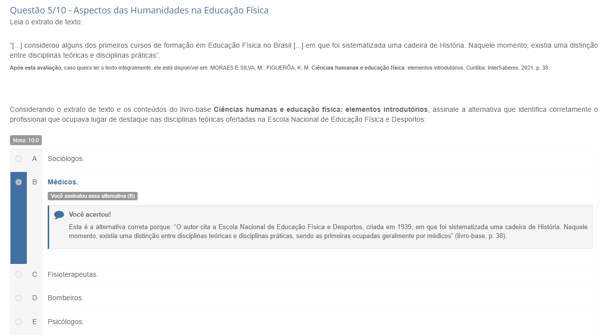 <p>Questão 5/10 Aspectos das Humanidades na Educação Física Leia o extrato de "[...] considerou alguns dos primeiros cursos de formação em Educação Física no Brasil [...] em que foi sistematizada uma cadeira de Naquele existia uma distinção entre disciplinas teóricas e disciplinas Após esta avaliação, caso queira ler texto ele está disponível MORAES F M. K.M. Ciências humanas e educação elementos Curitiba: InterSaberes, 2021. p. Considerando o extrato de texto e os conteúdos do livro-base Ciências humanas e educação elementos assinale a alternativa que identifica corretamente profissional que ocupava lugar de destaque nas disciplinas teóricas ofertadas na Escola Nacional de Educação Física e Desportos: 10.0 A B Você assinalou essa alternativa (B) Você acertou! Esta é a alternativa correta porque: "O autor cita a Escola Nacional de Educação Física e Desportos, criada em em que foi sistematizada uma cadeira de Naquele momento, existia uma distinção entre disciplinas teóricas e disciplinas práticas, sendo as primeiras ocupadas geralmente por médicos" (livro-base, p. 38). C D F</p>