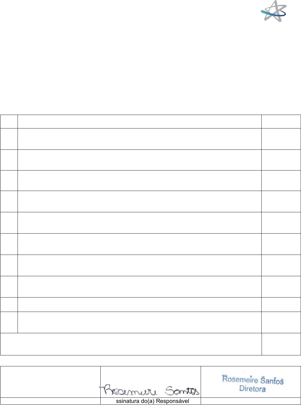 <p>FICHA DE AVALIAÇÃO DE ESTÁGIO</p><p>ALUNO(A): Evelyn Maia Reis RGM Nº 33630674</p><p>CURSO: Pedagogia DATA DA AVALIAÇÃO: 27/09/2024</p><p>INSTITUIÇÃO: UNICID UNIVERSIDADE Cidade de S.Paulo</p><p>ITEM</p><p>CRITÉRIOS DE AVALIAÇÃO</p><p>AVALIAÇÃO</p><p>1</p><p>ASSIDUIDADE E PONTUALIDADE (0,5): obrigações funcionais do(a) aluno(a) decorrente do contrato de estágio supervisionado.</p><p>2</p><p>VESTIMENTA E MATERIAL DE BOLSO CONFORME NORMAS (0,5): Cada área de atividade possui suas particularidades. As condições de trabalho são agentes diretos na saúde e bem-estar do indivíduo.</p><p>3</p><p>POSTURA, ÉTICA E SIGILO (0,5): Discrição no ambiente de estágio. Sigilo quanto às informações dos envolvidos. Postura ética em relação às informações e às atividades desenvolvidas no local de estágio.</p><p>4</p><p>CAPACIDADE DE RELACIONAR TEORIA E PRÁTICA (2,0): o(a) aluno(a) aplica seus conhecimentos baseado em literaturas com competência e habilidade técnica.</p><p>5</p><p>RECEPTIVIDADE ÀS ORIENTAÇÕES E CRÍTICAS (0,5): aceita novas orientações e ensinamentos empenhando-se em melhorar.</p><p>6</p><p>INICIATIVA (1,0): identifica a necessidade da situação e realiza ou sugere condutas com antecedência.</p><p>7</p><p>CONTROLE EMOCIONAL EM SITUAÇÕES ADVERSAS (1,0): apresenta equilíbrio emocional ao passar por situações de alta complexidade em procedimentos e decisões.</p><p>8</p><p>TRABALHO EM EQUIPE (1,0): consegue ter bom relacionamento e desempenho em procedimentos e condutas a serem tomadas em grupo.</p><p>9</p><p>ENGAJAMENTO (1,0): desenvolve as atividades programadas respeitando os prazos estipulados.</p><p>10</p><p>CAPACIDADE TÉCNICA (2,0): demonstra conhecimento das particularidades dos procedimentos empregados nos campos de estágio</p><p>NOTA FINAL DA AVALIAÇÃO</p><p>Rosemeire Santos</p><p>Nome completo do(a) Responsável</p><p>Assinatura do(a) Responsável</p><p>Carimbo do(a) Responsável</p><p>Orientações: O preenchimento da avaliação é realizado pelo profissional responsável por acompanhar você durante a realização do seu estágio em campo. Após o preenchimento e assinatura realize o upload do documento no AVA, especificamente, na disciplina de estágio em que estiver matriculado(a). Documento válido somente com assinatura e carimbos.</p><p>image1.png</p><p>image2.jpeg</p><p>image3.jpeg</p>