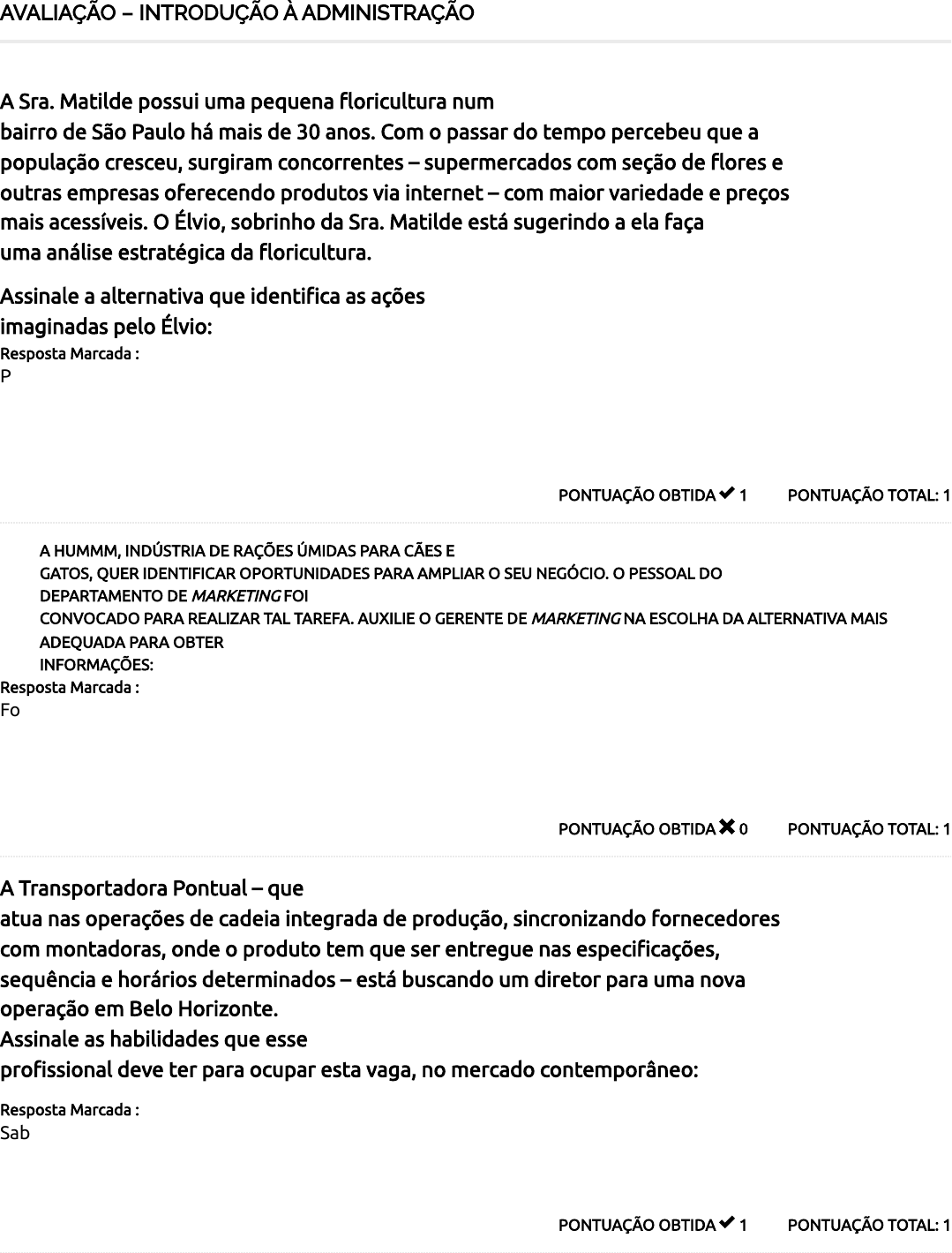 <p>AVALIAÇÃO – INTRODUÇÃO À ADMINISTRAÇÃO</p><p>PONTUAÇÃO TOTAL: 1PONTUAÇÃO OBTIDA 1</p><p>A Sra. Matilde possui uma pequena �oricultura num</p><p>bairro de São Paulo há mais de 30 anos. Com o passar do tempo percebeu que a</p><p>população cresceu, surgiram concorrentes – supermercados com seção de �ores e</p><p>outras empresas oferecendo produtos via internet – com maior variedade e preços</p><p>mais acessíveis. O Élvio, sobrinho da Sra. Matilde está sugerindo a ela faça</p><p>uma análise estratégica da �oricultura.</p><p>Assinale a alternativa que identi�ca as ações</p><p>imaginadas pelo Élvio:</p><p>Resposta Marcada :</p><p>Primeiramente, de�nir um objetivo</p><p>para ser atingido num momento futuro. Fazer uma análise ambiental, conversar</p><p>com os clientes sobre o que poderia ser melhorado, que novos produtos e</p><p>serviços poderia ser ofertados e como proceder para atrair mais clientes.</p><p>A HUMMM, INDÚSTRIA DE RAÇÕES ÚMIDAS PARA CÃES E</p><p>GATOS, QUER IDENTIFICAR OPORTUNIDADES PARA AMPLIAR O SEU NEGÓCIO. O PESSOAL DO</p><p>DEPARTAMENTO DE MARKETING FOI</p><p>CONVOCADO PARA REALIZAR TAL TAREFA. AUXILIE O GERENTE DE MARKETING NA ESCOLHA DA ALTERNATIVA MAIS</p><p>ADEQUADA PARA OBTER</p><p>INFORMAÇÕES:</p><p>PONTUAÇÃO TOTAL: 1PONTUAÇÃO OBTIDA 0</p><p>Resposta Marcada :</p><p>Forças</p><p>Tecnológicas através das pesquisas e progressos cientí�cos que proporcionam</p><p>maior conhecimento, gerando inovações e melhorias realizadas por universidades</p><p>na identi�cação de animais domésticos.</p><p>PONTUAÇÃO TOTAL: 1PONTUAÇÃO OBTIDA 1</p><p>A Transportadora Pontual – que</p><p>atua nas operações de cadeia integrada de produção, sincronizando fornecedores</p><p>com montadoras, onde o produto tem que ser entregue nas especi�cações,</p><p>sequência e horários determinados – está buscando um diretor para uma nova</p><p>operação em Belo Horizonte.</p><p>Assinale as habilidades que esse</p><p>pro�ssional deve ter para ocupar esta vaga, no mercado contemporâneo:</p><p>Resposta Marcada :</p><p>Saber monitorar as operações para atingir os</p><p>objetivos, transmitir informações relevantes, manter o espírito de equipe e</p><p>compartilhar resultados.</p><p>PONTUAÇÃO TOTAL: 1PONTUAÇÃO OBTIDA 1</p><p>O Sr. Rauen é proprietário da Ula Ula, uma embarcação �uvial de</p><p>passageiros adaptada para passeios turísticos em rios de médio para grande</p><p>porte que opera na região Centro-Oeste do Brasil. Ele está com di�culdade em</p><p>expandir o seu negócio, então pediu a seu �lho, que é bancário, para</p><p>auxiliá-lo na reorganização de sua atividade.</p><p>Das diferentes alternativas há</p><p>uma mais adequada ao Sr. Rauen no que se refere a visualizar o negócio no</p><p>futuro e tomar providências, indique-a:</p><p>Resposta Marcada :</p><p>Avaliar</p><p>e descrever o negócio de passeios turísticos �uviais, as tendências do mercado</p><p>turístico na região, as tendências do mercado de turismo de navegação em</p><p>diversos lugares do Brasil e em outros países, entre outras ações.</p><p>PONTUAÇÃO TOTAL: 1PONTUAÇÃO OBTIDA 1</p><p>Eliminar desperdícios e perdas</p><p>sofridas pelas indústrias e elevar os níveis de produtividade com a aplicação</p><p>de métodos e técnicas cientí�cas, desenvolvidas após estudos sobre</p><p>racionalização do trabalho do operário, observação dos tempos e movimentos em</p><p>suas atividades, análise de cada tarefa e decomposição de seus movimentos e</p><p>processos de trabalho.</p><p>Assinale de</p><p>qual escola ou abordagem de pensamento da administração são esses fundamentos:</p><p>Resposta Marcada :</p><p>Cientí�ca</p><p>e clássica</p><p>PONTUAÇÃO TOTAL: 1PONTUAÇÃO OBTIDA 1</p><p>Diante</p><p>de um momento de elevação dos preços do trigo e dos óleos vegetais no mercado</p><p>brasileiro, a Sra. Idalina, que possui uma pequena indústria de salgados para</p><p>festas cujo produto principal é o pastelzinho com diversos sabores, resolveu</p><p>alterar os seus produtos. Lançou o pastelzinho de farinha de milho, sorgo e</p><p>arroz assados, não mais fritos, com os mesmos sabores e outros mais. Assim, a</p><p>Sra. Idalina, além de eventualmente reduzir custos, passa a ter mais e novas</p><p>opções de fornecedores.</p><p>Além</p><p>da redução do custo, com o fato de ser assado, o pastelzinho passou a atender</p><p>novos públicos interessados na melhoria da qualidade de vida, abrindo</p><p>oportunidade para colocar o produto em diversos pontos de venda ao consumidor</p><p>�nal, ampliando o volume de produção.</p><p>Assinale</p><p>as opções de forças que atuam no mercado e as estratégias a Sra. Idalina implementou:</p><p>Resposta Marcada :</p><p>Clientes, produtos substitutos e</p><p>fornecedores.</p><p>PONTUAÇÃO TOTAL: 1PONTUAÇÃO OBTIDA 1</p><p>Após assistir</p><p>a uma palestra da PROQUAL, uma consultoria internacional voltada à qualidade e</p><p>produtividade, o casal Mário e Elisa �cou empolgado em aplicar conceitos de</p><p>pensamento estratégico em sua churrascaria com 30 funcionários permanentes e</p><p>pelo menos 40 eventuais, que trabalham nos �nais de semana e feriados para</p><p>atender mais de 15.000 clientes ao mês, em média. Situada num recanto ecológico</p><p>que recebe quase 300.000 turistas ao ano, esse volume crescente de visitantes</p><p>está fazendo surgir concorrentes, que passam a ameaçar a posição da</p><p>Churrascaria Recanto das Flores. O dilema do casal é como fazer com que seus</p><p>funcionários passem a pensar estrategicamente.</p><p>Assim, das</p><p>diversas alternativas que imaginaram, assinale a mais interessante:</p><p>Resposta Marcada :</p><p>Conversas permanentes com os colaboradores</p><p>estimulando-os a conversar com os clientes e identi�car pontos de melhoria,</p><p>deixá-los livres para dar ideias sem censura e chac