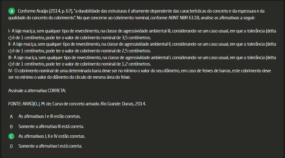 <p>4 Conforme Araújo (2014, p. 67), "a durabilidade das estruturas é altamente dependente das características do concreto e da espessura e da qualidade do concreto do No que concerne ao cobrimento nominal, conforme ABNT NBR 6118, analise as afirmativas a seguir: A laje sem qualquer tipo de revestimento, na classe de agressividade ambiental III, considerando-se um caso usual, em que a tolerância (delta c) é de 1 pode ter valor de cobrimento nominal de 3,5 II- A laje macica, sem qualquer tipo de revestimento, na classe de agressividade ambiental II, considerando-se um caso usual, em que a tolerância (delta c) é de 1 pode ter valor de cobrimento nominal de 2,5 III- A laje sem qualquer tipo de revestimento, na classe de agressividade ambiental I, considerando-se um caso usual, em que a tolerância (delta c) é de 1 pode ter valor de cobrimento nominal de 1,2 IV cobrimento nominal de uma determinada barra deve ser no mínimo valor do seu diâmetro, em caso de feixes de barras, este cobrimento deve ser no mínimo valor do diâmetro do círculo de mesma área do feixe. Assinale a alternativa CORRETA: FONTE: J. M. de; Curso de concreto armado. Rio Grande: Dunas, 2014. A As afirmativas e III estão corretas. B Somente a afirmativa III está correta. As afirmativas I, II e IV estão corretas. D Somente a afirmativa está correta.</p>