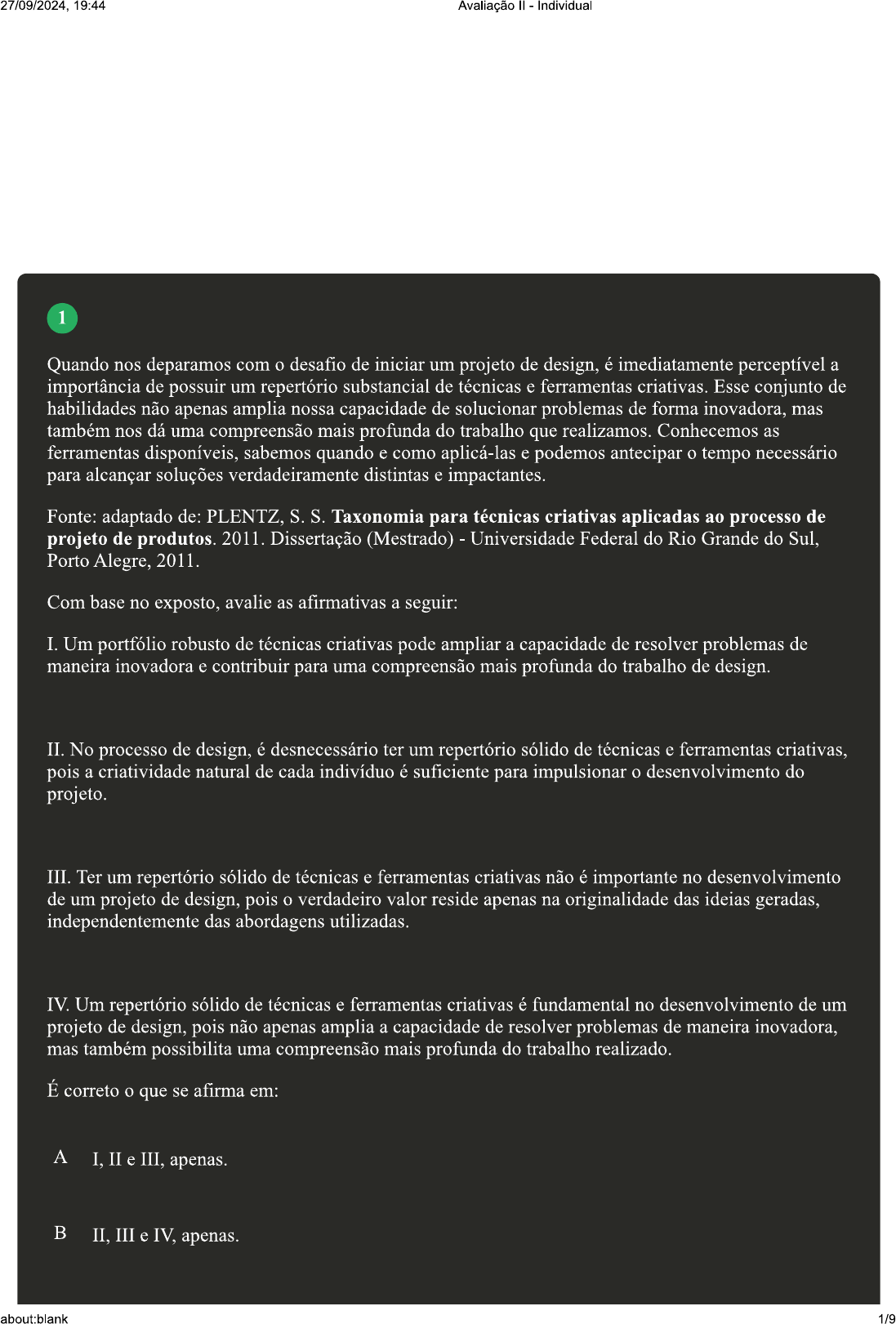 <p>27/09/2024, 19:44 Avaliação Individual 1 Quando nos deparamos com desafio de iniciar um projeto de design, é imediatamente perceptível a importância de possuir um repertório substancial de técnicas e ferramentas criativas. Esse conjunto de habilidades não apenas amplia nossa capacidade de solucionar problemas de forma inovadora, mas também nos dá uma compreensão mais profunda do trabalho que realizamos. Conhecemos as ferramentas disponíveis, sabemos quando e como aplicá-las e podemos antecipar tempo necessário para alcançar soluções verdadeiramente distintas e impactantes. Fonte: adaptado de: PLENTZ, S. S. Taxonomia para técnicas criativas aplicadas ao processo de projeto de produtos. 2011. Dissertação (Mestrado) Universidade Federal do Rio Grande do Sul, Porto Alegre, 2011. Com base no exposto, avalie as afirmativas a seguir: I. Um portfólio robusto de técnicas criativas pode ampliar a capacidade de resolver problemas de maneira inovadora e contribuir para uma compreensão mais profunda do trabalho de design. II. No processo de design, é desnecessário ter um repertório sólido de técnicas e ferramentas criativas, pois a criatividade natural de cada indivíduo é suficiente para impulsionar o desenvolvimento do projeto. III. Ter um repertório sólido de técnicas e ferramentas criativas não é importante no desenvolvimento de um projeto de design, pois verdadeiro valor reside apenas na originalidade das ideias geradas, independentemente das abordagens utilizadas. IV. Um repertório sólido de técnicas e ferramentas criativas é fundamental no desenvolvimento de um projeto de design, pois não apenas amplia a capacidade de resolver problemas de maneira inovadora, mas também possibilita uma compreensão mais profunda do trabalho realizado. É correto que se afirma em: A I, II e III, apenas. B II, III e IV, apenas. about:blank 1/9</p><p>27/09/2024, 19:44 Avaliação Individual C I IV, apenas. D III e IV, apenas. E II e III, apenas. 2 A prática de construção de protótipos remonta aos tempos ancestrais, marcando início da inteligência técnica humana exemplificada pelo Homo Habilis. Esse ancestral humano foi primeiro a desenvolver utensílios especializados, demonstrando uma reflexão ergonômica e a intenção de atender determinadas necessidades. Considerando contexto fornecido sobre a prática ancestral de construção de protótipos, analise as afirmativas a seguir: I. A prática de construção de protótipos teve início há, aproximadamente, dois milhões de anos com Homo Erectus. II. Os utensílios desenvolvidos pelo Homo Habilis incluíam apenas ferramentas de pedra lascada, sem evidências de outras formas de protótipos. III. A prática de construção de protótipos iniciou-se com Homo Habilis há, aproximadamente, dois milhões de anos, demonstrando uma inteligência técnica incipiente. IV. A descoberta no Egito, datada de 1000 a 600 a.C., é um exemplo único de prótese funcional, indicando uma preocupação precoce em atender necessidades anatômicas. É correto que se afirma em: A III, apenas. B IV. III e IV, apenas. D I, II e III, apenas. E I, apenas. about:blank 2/9</p><p>27/09/2024, 19:44 Avaliação Individual 3 No universo do design, a criatividade, segundo Baxter, é mais do que uma habilidade: é uma bússola, apontando para a inovação e progresso. Como um explorador em busca de novos territórios, você se vê diante do desafio de encontrar soluções únicas para problemas complexos. O arsenal de técnicas criativas serve como um mapa, orientando rumo ao sucesso e à excelência profissional. Fonte: adaptado de: BACK, N. et al. Projeto integrado de produtos: planejamento, concepção e modelagem. Barueri: Manole, 2008. Considerando a importância do portfólio de técnicas criativas para os profissionais de design, assinale a alternativa correta: O portfólio de técnicas criativas permite que os profissionais de design tenham infinitas possibilidades para materializar as próprias ideias, enfrentando desafios complexos com confiança. B Ter um portfólio de técnicas criativas é irrelevante para profissionais de design, pois a criatividade é um dom exclusivo de alguns poucos privilegiados. C A experimentação e a prática constante das técnicas criativas são dispensáveis para profissionais de design, pois domínio técnico é mais importante do que a criatividade. D Estudar e entender as técnicas criativas não contribuem para crescimento pessoal dos profissionais de design, pois a criatividade é uma habilidade inata. E Profissionais de design não precisam aprender e dominar técnicas criativas, pois a intuição e a imaginação são suficientes para gerar concepções inovadoras. Atenção: Esta questão foi cancelada, porém a pontuação foi considerada. 4 A técnica de criatividade RPG, ou Role-Playing Game, simula situações fictícias para estimular a resolução de problemas. Os participantes assumem papéis e interagem dentro de um enredo, explorando diferentes perspectivas. Pode ser usado na exploração de problemas e como ferramenta de promovendo colaboração e inovação. Com base no exposto, analise as afirmativas a seguir: I. Os quatro arquétipos presentes são: Explorador, Artista, Criativo e Valente II. Baseia-se em três arquétipos presentes nas tendências psicológicas das pessoa about:blank 3/9</p><p>27/09/2024, 19:44 Avaliação Individual III. Baseia-se em quatro arquétipos presentes nas tendências psicológicas das pessoas. IV. Tem objetivo de ajudar os designers a criar e desenvolver ideias a partir de um novo ponto de vista. É correto que se afirma em: A I, II e III, apenas. B III e IV, apenas. IV, apenas. D I IV, apenas. E I, II, III e IV. Atenção: Esta questão foi cancelada, porém a pontuação foi considerada. 5 Peter Drucker, renomado teórico da gestão, enfatiza a importância de adotar métodos eficazes para alcançar resultados superiores. Drucker destaca a necessidade de