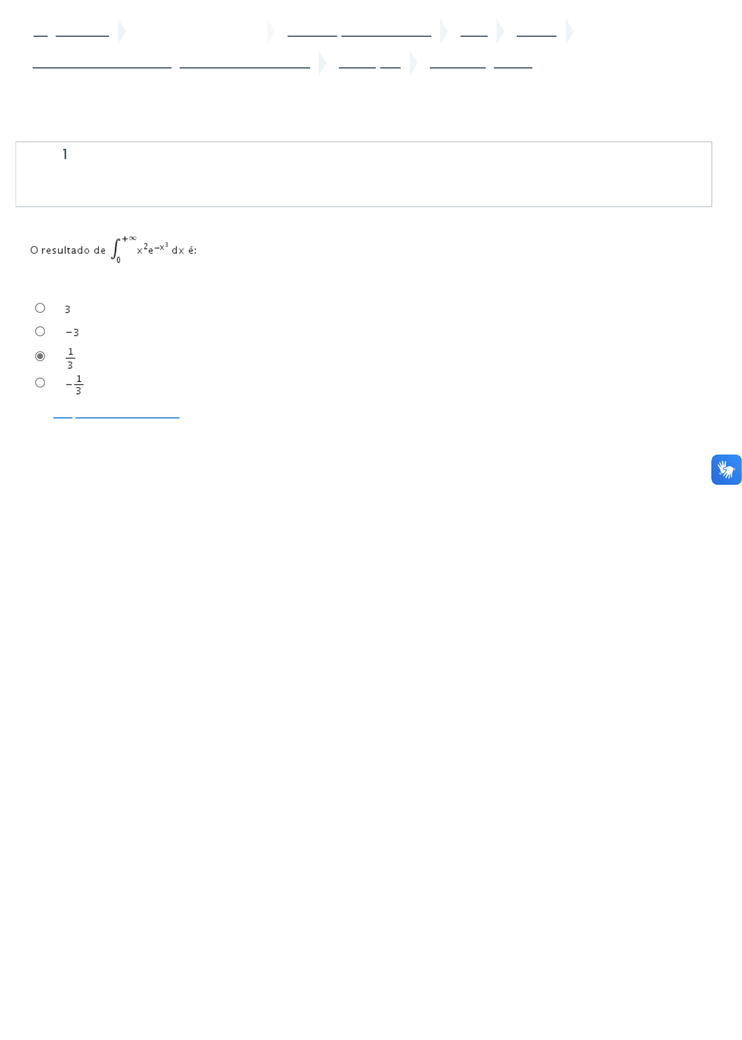 <p>...</p><p>Página inicial Disciplinas e Espaços GRADUAÇÃO A DISTÂNCIA 2024 2024-3</p><p>Cálculo Diferencial E Integral II - 2024_03_EAD_A Avaliações Prova Integradora</p><p>Questão 1</p><p>Ainda não respondida</p><p>Vale 1,00 ponto(s).</p><p>Escolha uma opção:</p><p>a.</p><p>b.</p><p>c.</p><p>d.</p><p>Limpar minha escolha</p><p>https://ava.candidomendes.edu.br/moodle/</p><p>https://ava.candidomendes.edu.br/moodle/course/index.php?categoryid=8</p><p>https://ava.candidomendes.edu.br/moodle/course/index.php?categoryid=175</p><p>https://ava.candidomendes.edu.br/moodle/course/index.php?categoryid=185</p><p>https://ava.candidomendes.edu.br/moodle/course/view.php?id=15024</p><p>https://ava.candidomendes.edu.br/moodle/course/view.php?id=15024§ion=4</p><p>https://ava.candidomendes.edu.br/moodle/mod/quiz/view.php?id=508663</p><p>https://ava.candidomendes.edu.br/moodle/mod/quiz/attempt.php?attempt=567911&cmid=508663</p><p>Questão 2</p><p>Ainda não respondida</p><p>Vale 1,00 ponto(s).</p><p>Questão 3</p><p>Ainda não respondida</p><p>Vale 1,00 ponto(s).</p><p>A área da região sombreada no gráfico acima é igual a:</p><p>Escolha uma opção:</p><p>a.</p><p>b.</p><p>c.</p><p>d.</p><p>e.</p><p>Limpar minha escolha</p><p>Escolha uma opção:</p><p>a.</p><p>b.</p><p>c.</p><p>d.</p><p>e.</p><p>Limpar minha escolha</p><p>https://ava.candidomendes.edu.br/moodle/mod/quiz/attempt.php?attempt=567911&cmid=508663</p><p>https://ava.candidomendes.edu.br/moodle/mod/quiz/attempt.php?attempt=567911&cmid=508663</p><p>Questão 4</p><p>Ainda não respondida</p><p>Vale 1,00 ponto(s).</p><p>Questão 5</p><p>Ainda não respondida</p><p>Vale 1,00 ponto(s).</p><p>Questão 6</p><p>Ainda não respondida</p><p>Vale 1,00 ponto(s).</p><p>Escolha uma opção:</p><p>a.</p><p>b.</p><p>c.</p><p>d.</p><p>e.</p><p>Limpar minha escolha</p><p>Escolha uma opção:</p><p>a.</p><p>b.</p><p>c.</p><p>d.</p><p>e.</p><p>Limpar minha escolha</p><p>Escolha uma opção:</p><p>a.</p><p>b.</p><p>c.</p><p>d.</p><p>e.</p><p>Limpar minha escolha</p><p>https://ava.candidomendes.edu.br/moodle/mod/quiz/attempt.php?attempt=567911&cmid=508663</p><p>https://ava.candidomendes.edu.br/moodle/mod/quiz/attempt.php?attempt=567911&cmid=508663</p><p>https://ava.candidomendes.edu.br/moodle/mod/quiz/attempt.php?attempt=567911&cmid=508663</p><p>Questão 7</p><p>Ainda não respondida</p><p>Vale 3,00 ponto(s).</p><p>Tamanho máximo para novos arquivos: 1Gb</p><p> </p><p>Segue resposta em anexo.</p><p> </p><p>Arquivos</p><p> </p><p>Questão 07 …</p><p>Questão 8</p><p>Ainda não respondida</p><p>Vale 3,00 ponto(s).</p><p>Determine o volume do sólido de revolução gerado pela rotação, em torno do eixo y, da região sombreada no</p><p>gráfico abaixo.</p><p>Tamanho máximo para novos arquivos: 1Gb</p><p> </p><p>Resposta em anexo.</p><p> </p><p>Arquivos</p><p> </p><p>Questão 08 …</p>