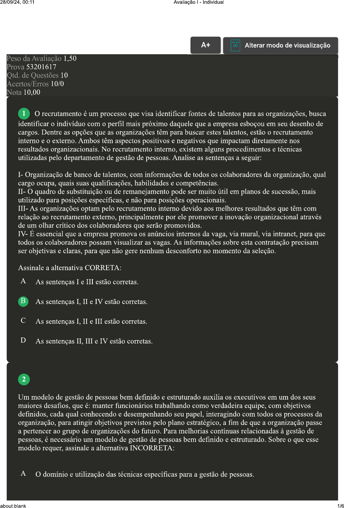 <p>28/09/24, 00:11 Avaliação Individual A+ Alterar modo de visualização Peso da Avaliação 1,50 Prova 53201617 Qtd. de Questões 10 Acertos/Erros 10/0 Nota 10,00 1 O recrutamento é um processo que visa identificar fontes de talentos para as organizações, busca identificar indivíduo com perfil mais próximo daquele que a empresa esboçou em seu desenho de cargos. Dentre as opções que as organizações têm para buscar estes talentos, estão recrutamento interno e externo. Ambos têm aspectos positivos e negativos que impactam diretamente nos resultados organizacionais. No recrutamento interno, existem alguns procedimentos e técnicas utilizadas pelo departamento de gestão de pessoas. Analise as sentenças a seguir: I- Organização de banco de talentos, com informações de todos os colaboradores da organização, qual cargo ocupa, quais suas qualificações, habilidades e competências. II- O quadro de substituição ou de remanejamento pode ser muito útil em planos de sucessão, mais utilizado para posições específicas, e não para posições operacionais. III- As organizações optam pelo recrutamento interno devido aos melhores resultados que têm com relação ao recrutamento externo, principalmente por ele promover a inovação organizacional através de um olhar crítico dos colaboradores que serão promovidos. IV- É essencial que a empresa promova os anúncios internos da vaga, via mural, via intranet, para que todos os colaboradores possam visualizar as vagas. As informações sobre esta contratação precisam ser objetivas e claras, para que não gere nenhum desconforto no momento da seleção. Assinale a alternativa CORRETA: A As sentenças I e III estão corretas. B As sentenças I, II e IV estão corretas. C As sentenças I, II e III estão corretas. D As sentenças II, III e IV estão corretas. 2 Um modelo de gestão de pessoas bem definido e estruturado auxilia os executivos em um dos seus maiores desafios, que é: manter funcionários trabalhando como verdadeira equipe, com objetivos definidos, cada qual conhecendo e desempenhando seu papel, interagindo com todos os processos da organização, para atingir objetivos previstos pelo plano estratégico, a fim de que a organização passe a pertencer ao grupo de organizações do futuro. Para melhorias contínuas relacionadas à gestão de pessoas, é necessário um modelo de gestão de pessoas bem definido e estruturado. Sobre que esse modelo requer, assinale a alternativa INCORRETA: A O domínio e utilização das técnicas específicas para a gestão de pessoas. about:blank 1/6</p><p>28/09/24, 00:11 Avaliação Individual B Que sejam conhecidas as oportunidades e as metodologias apropriadas. C Que sejam contratados colaboradores de acordo com sua proximidade com os gestores. D A definição dos objetivos estratégicos da gestão de pessoas. 3 Um modelo de gestão de pessoas bem definido e estruturado auxilia os executivos em um dos seus maiores desafios, que é manter funcionários trabalhando como verdadeira equipe, com objetivos definidos, cada qual conhecendo e desempenhando seu papel, interagindo com todos os processos da organização para atingir objetivos previstos pelo plano estratégico, a fim de que a organização passe a pertencer ao grupo de organizações do futuro. Sobre alguns dos principais desejos que sempre fizeram e continuam fazendo parte do ambiente organizacional, assinale a alternativa CORRETA: A Desejo de valorização e reconhecimento; de exercer um trabalho digno; de esperança de conquistar outras tarefas adicionais. B Desejo de exercer um trabalho digno; de um ambiente seguro, limpo, organizado; de estabilidade constante e estagnação. Desejo de justiça; de valorização e reconhecimento; de crescimento e desenvolvimento pessoal e profissional; de exercer um trabalho digno. D Desejo de evolução; de um ambiente seguro, limpo, organizado; esperança de conquistar outras tarefas adicionais. 4 Na área de Recursos Humanos, ocorrem diversos procedimentos. Quando a empresa precisa realizar a contratação de um funcionário, acontece recrutamento, que tem propósito de buscar e atrair candidatos para as oportunidades existentes e criar um banco de currículos para vagas futuras. O recrutamento pode ocorrer de forma interna, externa e mista. No recrutamento externo são utilizadas técnicas como: banco de currículos, indicações, anúncios, utilização de consultorias externas, políticas de boa vizinhança e viagens de recrutamento para outras localidades. Assinale a alternativa CORRETA que contempla a definição de banco de currículos: about:blank 2/6</p><p>28/09/24, 00:11 Avaliação - Individual A O banco de currículos são serviços voltados aos profissionais (consultoria de recolocação) e para as empresas (consultoria de recrutamento). O uso do banco de currículos é indicado quando se quer alcançar muitas pessoas, incluindo as que B não têm muita familiaridade com a Internet. Portanto, veicular anúncios de emprego é outro método efetivo de recrutar. O banco de currículos é armazenamento de informações e referências de possíveis candidatos para uma vaga. Normalmente, é feito de forma digital, que gera uma maior facilidade em acesso e controle de dados. O banco de currículos é a forma mais simples e difundida de recrutamento. Trata-se, na verdade, D de uma fonte híbrida: a fonte em si é interna (o funcionário que indica seu conhecido para a vaga), mas talento, ou seja, candidato vem de fora. 5 Com os desafios apresentados diariamente por um mundo globalizado, cada vez mais, as organizações adotam modelos estratégicos na gestão de pessoas que possam auxiliar os gestores a lidar com os desafios relacionados aos processos existentes nas organizações. Sobre a estruturação de um modelo de gestão de pessoas adequado para uma organização, assinale a alternativa CORRETA: A Definir claramente as atividades para cumprimento de leis trabalhistas e me