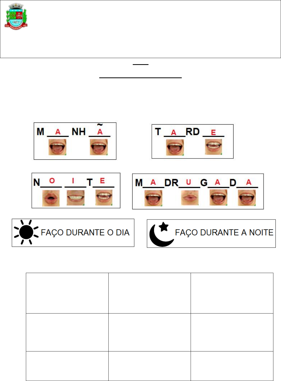 <p>KIT 8</p><p>1ª SEMANA DE ATIVIDADES</p><p>1º DIA</p><p>1- UM DIA TEM 24 HORAS E SE DIVIDE EM QUATRO PERÍODOS. COMPLETE AS</p><p>PALAVRAS COM AS VOGAIS OBSERVANDO A BOQUINHA CORRESPONDENTE E</p><p>DESCUBRA O NOME DESSES PERÍODOS:</p><p>2- EM QUE MOMENTO DO DIA VOCÊ REALIZA ESTAS ATIVIDADES? INDIQUE O</p><p>HORÁRIO COM OS DESENHOS DA LEGENDA:</p><p>FAÇO AS LIÇÕES DE</p><p>CASA</p><p>RESPOSTA PESSOAL</p><p>ALMOÇO</p><p>DIA</p><p>BRINCO</p><p>RESPOSTA PESSOAL</p><p>TOMO BANHO</p><p>RESPOSTA PESSOAL</p><p>ASSISTO TV</p><p>RESPOSTA PESSOAL</p><p>JANTO</p><p>RESPOSTA PESSOAL</p><p>AJUDO MINHA FAMÍLIA</p><p>RESPOSTA PESSOAL</p><p>LANCHO</p><p>RESPOSTA PESSOAL</p><p>DURMO</p><p>RESPOSTA PESSOAL</p><p>Prefeitura Municipal de Mangaratiba</p><p>Secretaria Municipal de Educação</p><p>Superintendência de Ensino</p><p>Diretoria de Ensino</p><p>Gabarito dos Kits Pedagógicos (8 ,9,10,11,12)</p><p>Ensino Fundamental – 1º ano</p><p>2º DIA</p><p>1- O DESENHO ABAIXO É UMA PLANTA BAIXA DE UMA CASA. SABENDO DISSO, COM A</p><p>AJUDA DE SEU RESPONSÁVEL, OBSERVE CADA CÔMODO E ESCREVA SEU</p><p>RESPECTIVO NOME NOS RETÂNGULOS:</p><p>2- OBSERVE O DESENHO ACIMA, FAÇA O QUE SE PEDE:</p><p> PINTE DE VERDE O LUGAR ONDE VOCÊ TOMA BANHO.</p><p> CIRCULE OS MÓVEIS DO CÔMODO ONDE VOCÊ DORME.</p><p> PINTE DE AMARELO O LOCAL ONDE SE PREPARA A COMIDA.</p><p> FAÇA UM (X) EM QUE LOCAL DA CASA, GERALMENTE REUNIMOS AS PESSOAS</p><p>PARA ASSISTIREM TELEVISÃO.</p><p>3- RESPONDA MARCANDO UM (X) NA RESPOSTA CORRETA:</p><p> QUANTOS CÔMODOS HÁ NESSA CASA? ( ) 1 ( ) 2 ( ) 3 ( ) 4 ( ) 5 (X) 6</p><p> QUANTOS QUARTOS HÁ NESSA CASA? ( ) 1 (X) 2 ( ) 3 ( ) 4 ( ) 5 ( ) 6</p><p> QUAL CÔMODO ESTÁ ENTRE A COZINHA E O QUARTO?</p><p>( ) LAVANDERIA ( ) SALA (X) BANHEIRO ( ) COZINHA ( ) QUARTO</p><p>3º DIA</p><p>*Atividade elaborada pela professora Karla Baptista da E.M. Águas Lindas</p><p>MARQUE UM X NA FIGURA QUE NÃO COMEÇA COM A BOQUINHA EM DESTAQUE:</p><p>4º DIA</p><p>ESSAS SÃO ALGUMAS BRINCADEIRAS FOLCLÓRICAS. OBSERVE AS CENAS DE CADA UMA</p><p>DELAS, LEIA AS FRASES COM A AJUDA DE SEU RESPONSÁVEL E LIGUE NA FIGURA</p><p>CORRESPONDENTE:</p><p>5º DIA</p><p>*Atividade elaborada pela profª Ana Lúcia da E.M.Profª Mª Rosa Magalhães</p><p>CAÇA AO TESOURO (RESPOSTA PESSOAL)</p><p> 2 OU MAIS PARTICIPANTES:</p><p> CAPITÃO – QUEM ESTÁ NA VEZ DE ESCONDER O TESOURO (OBJETO)</p><p> PIRATA – QUEM ESTÁ NA VEZ DE PROCURAR O TESOURO.</p><p> MARUJOS – DEMAIS PARTICIPANTES QUE PODERAM AUXILIAR NA PROCURA.</p><p>O CAPITÃO DEVERÁ ESCONDER UM OBJETO (A ESCOLHA)</p><p>SEM QUE O ALUNO VEJA O LOCAL. LOGO APÓS ESCONDER O</p><p>OBJETO OPIRATA DEVERÁ PROCURAR POR TODO O LOCAL;</p><p>O PARTICIPANTE (CAPITÃO) DEVE AJUDAR COM OS</p><p>COMANDOS ESQUERDA, DIREITA, FRENTE, ATRÁS, ATÉ QUE</p><p>O OBJETO SEJA ENCONTRADO. ASSIM QUE O TESOURO FOR</p><p>ENCONTRADO; COMECE UMA NOVA RODADA TROCANDO A</p><p>VEZ COM O OUTRO PARTICIPANTE.VAMOS LÁ!</p><p>2ª SEMANA DE ATIVIDADES</p><p>6º</p><p>DIA</p><p>-</p><p>Atividade elaborada pela profª Maria de Fátima da E.M. Pres. Castelo Branco</p><p>PINTE OS DESENHOS INICIADOS PELA VOGAL DA BOQUINHA DESTACADA.</p><p>7º DIA - *Atividade elaborada pela profª Adriana da E.M. Mª Augusta Lopes</p><p>1- ESTA FAMILIA ESTÁ INDO AO PARQUE PASSEAR. VAMOS COMPLETAR A IMAGEM?</p><p>DESENHE UMA ÁRVORE A DIREITA, UM CACHORRO A ESQUERDA, UM SOL ATRÁS E</p><p>FLORES NA FRENTE.</p><p>2- SUGESTÕES: VÍDEO MUSICAL “VEM QUE EU VOU TE ENSINAR”</p><p>LINK DO VÍDEO: https://www.youtube.com/watch?v=r64qYQ3UJVQ</p><p>DESENVOLVIMENTO: O DESAFIO DE HOJE É BRINCAR COM AS POSIÇÕES. A PARTIR DAS</p><p>IMAGENS ABAIXO, OS ALUNINHOS IRÃO IDENTIFICAR EM QUAIS POSIÇÕES ESTÃO OS</p><p>OBJETOS E AS PESSOAS. ANTES DE REALZAR A ATIVIDADE PEÇO QUE ASSISTAM AO</p><p>VÍDEO “VEM QUE EU VOU TE ENSINAR” PARA APROFUNDAREM A REFERÊNCIA DE</p><p>LATERALIDADE (ESQUERDA/ DIREITA, FRENTE/ ATRÁS);</p><p>NA BRINCADEIRA DE ÁREA EXTERNA DA ESCOLA, CADA ALUNO RESOLVEU FAZER UMA</p><p>POSIÇÃO DIFERENTE. OBSERVE:</p><p>VOCÊ CONSEGUE DESCOBRIR QUEM É QUEM?</p><p> O ALUNO WESLLEY ESTÁ BRINCANDO DE PIQUE PEGA E COLOCOU A MÃO DIREITA NO</p><p>OMBRO DO AMIGUINHO. CIRCULE O WESLLEY.</p><p> RAYSSA ESTÁ BRINCADO COM JOGO DAS FORMAS E ESTÁ SEGURANDO UM CÍRCULO</p><p>NA MÃO ESQUERDA. RISQUE O CÍRCULO.</p><p> MIGUEL ESTÁ JOGANDO BOLA COM A PERNA DIREITA. FAÇA UM QUADRADO AO REDOR</p><p>DE MIGUEL.</p><p>*Atividade elaborada pela profª Hérica da E.M. Adalberto Pereira Pinto</p><p>https://www.youtube.com/watch?v=r64qYQ3UJVQ</p><p>8º DIA</p><p>1- DESENHE A BRINCADEIRA E O JOGO DE QUE VOCÊ MAIS GOSTA: (RESPOSTAS</p><p>PESSOAIS)</p><p>2- ESCREVA O NOME DE DOIS BRINQUENDOS DE QUE VOCÊ MAIS GOSTA:</p><p>(RESPOSTAS PESSOAIS)</p><p>3- MARQUE AS BRINCADEIRAS QUE VOCÊ JÁ BRINCOU E SUBLINHE AS QUE VOCÊ</p><p>GOSTARIA DE BRINCAR: (RESPOSTAS PESSOAIS)</p><p>4- PRESTE ATENÇÃO NA LEITURA QUE SEU RESPONSÁVEL IRÁ FAZER. FIQUE LIGADO</p><p>NAS PISTAS, POIS VOCÊ DEVE DESCOBRIR QUE BRINCADEIRA É ESSA, EM</p><p>SEGUIDA, CIRCULE A IMAGEM CORRESPONDENTE:</p><p>BRINCADEIRA JOGO</p><p>( ) PEGA-PEGA</p><p>( ) CABO DE GUERRA</p><p>( ) MÃE DA RUA</p><p>( ) QUENTE OU FRIO</p><p>( ) PIQUE ALTO</p><p>( ) BRINCADEIRA DE RODA</p><p>( ) ESCONDE-ESCONDE</p><p>( ) BOCA DE FORNO</p><p>( ) PASSA ANEL</p><p>( ) MORTO OU VIVO</p><p>9º DIA - Atividade elaborada pela profª Devanira da E.M. Fazenda Ingaíba</p><p>1- CIRCULE SOMENTE AS FIGURAS QUE TENHAM A PRESENÇA DAS VOGAIS DAS</p><p>BOQUINHAS EM DESTAQUE.</p><p>ATIVIDADE: RECORTE E COLAGEM (O SOM DAS VOGAIS): ENCONTRE O PAR OU TRIO</p><p>DE BOQUINHAS COM AS VOGAIS QUE COMPLETAM O NOME DAS FIGURAS ABAIXO,</p><p>RECORTE AS IMAGENS DAS BOQUINHAS E DEPOIS COLE AO LADO DAS FIGURAS</p><p>CORRESPONDENTES. Atividade elaborada pela profª Camila Rodrigues da E.M. Oliveira Bello</p><p>10º DIA</p><p>PARA CONSTRUIR UMA CASA, PRIMEIRO FAZEMOS UM DESENHO DELA. ESSE DESENHO</p><p>RECEBE O NOME 
