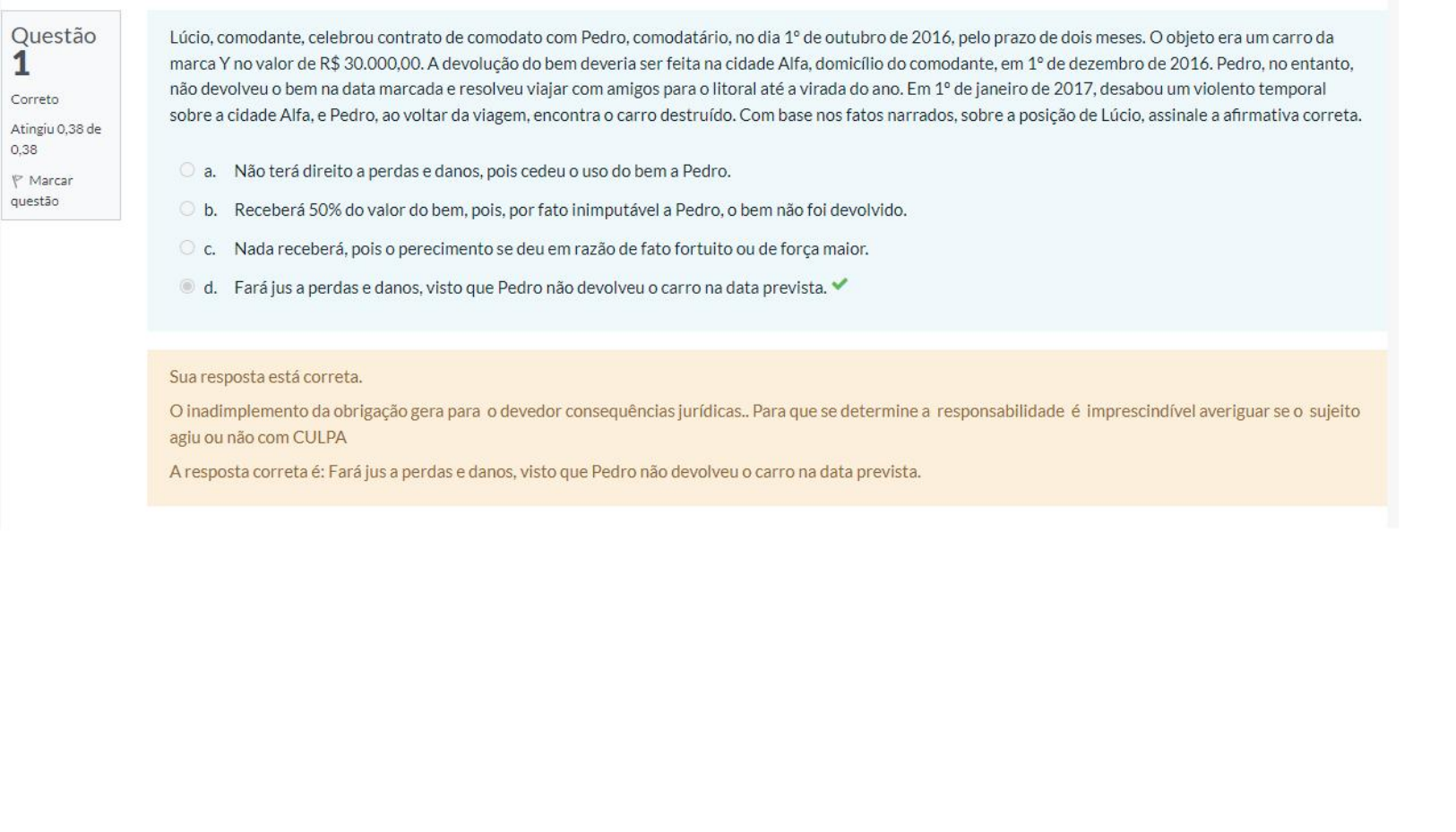 <p>Questão Lúcio, comodante, celebrou contrato de comodato com comodatário, no dia 1° de outubro de pelo prazo de dois meses. objeto era um carro da 1 marca Y no valor de R$ 30.000,00. A devolução do bem deveria ser feita na cidade Alfa, domicílio do comodante, em 1° de dezembro de 2016. Pedro, no não devolveu o bem na data marcada e resolveu viajar com amigos para o litoral até a virada do ano. Em 1° de janeiro de 2017, desabou um violento temporal Correto sobre a cidade Alfa, e ao voltar da viagem, encontra o carro destruído. Com base nos fatos narrados, sobre a posição de Lúcio, assinale a afirmativa correta. Atingiu 0,38 de 0,38 a. Não terá direito a perdas e danos, pois cedeu o uso do bem a Pedro. Marcar questão b. Receberá 50% do valor do bem, pois, por fato inimputável a Pedro, o bem não foi devolvido. C. Nada receberá, pois o perecimento se deu em razão de fato fortuito ou de força maior. d. Fará jus a perdas e danos, visto que Pedro não devolveu o carro na data prevista. Sua resposta está correta. inadimplemento da obrigação gera para o devedor consequências jurídicas.. Para que se determine a responsabilidade é imprescindível averiguar se o sujeito agiu ou não com CULPA A resposta correta é: Fará jus a perdas e danos, visto que Pedro não devolveu o carro na data prevista.</p><p>Questão Jorge, engenheiro e construtor, firma, em seu escritório, contrato de empreitada com Maria, dona da obra. Na avença, foi acordado que Jorge forneceria os 2 materiais da construção e concluiria a nos termos do projeto, no prazo de seis meses. Acordou-se, também, que o pagamento da remuneração seria efetivado em duas parcelas: a primeira, correspondente à metade do preço, a ser depositada no prazo de 30 (trinta) dias da assinatura do e a segunda, Correto correspondente à outra metade do preço, no ato de entrega da obra concluída. Maria, cinco dias após a assinatura da avença, toma conhecimento de que Atingiu 0,38 de sobreveio decisão em processo judicial que determinou a penhora sobre todo o patrimônio de Jorge, reconhecendo que este possui dívida substancial com um 0,38 credor que acaba de realizar ato de constrição sobre todos os seus bens (em virtude do valor elevado da dívida). Diante de tal situação, Maria pode Marcar questão a. desistir do contrato, sem qualquer ônus, pelo exercício do direito de arrependimento, garantido em razão da natureza de contrato de consumo. b. recusar o pagamento do preço até que a obra seja concluída ou, pelo menos, até o momento em que o empreiteiro garantia suficiente de que irá realizá-la. resolver o contrato por onerosidade excessiva, haja vista que o fato superveniente e imprevisível tornou o acordo desequilibrado, afetando o sinalagma contratual. d. exigir cumprimento imediato da prestação (atividade de construção), em virtude do vencimento antecipado da obrigação de fazer, a cargo do empreiteiro. Sua resposta está correta. A empreitada é um contrato bilateral, visto que gera obrigações recíprocas para as partes, sendo a realização e entrega da obra, para o empreiteiro, e o pagamento do preço, para o proprietário. A resposta correta é: recusar o pagamento do preço até que a obra seja concluída ou, pelo menos, até o momento em que empreiteiro prestar garantia suficiente de que irá realizá-la.</p><p>Questão Jacira mora em um apartamento alugado, sendo a locação garantida por fiança prestada por seu pai, José. Certa vez, Jacira conversava com sua Laura acerca 3 de suas dificuldades financeiras, e declarou que temia não ser capaz de pagar o próximo aluguel do imóvel. Compadecida da situação da Laura procurou o locador do imóvel e, na data de vencimento do aluguel, pagou, em nome próprio, o valor devido por Jacira, sem oposição desta. Nesse cenário, em relação ao Correto débito do aluguel daquele mês, assinale a afirmativa correta. Atingiu 0,38 de 0,38 a. Laura, tendo realizado mera liberalidade, não tem qualquer direito em face de Jacira. Marcar questão b. Laura, como terceira interessada, sub-rogou-se em todos os direitos que o locador tinha em face de Jacira, inclusive a garantia fidejussória. Laura, como terceira não interessada, tem apenas direito de regresso em face de Jacira. d. Laura, como devedora solidária, sub-rogou-se nos direitos que o locador tinha em face de Jacira, mas não quanto à garantia fidejussória. Sua resposta está correta. terceiro interessado é aquele que mesmo não sendo parte, vincula-se à obrigação, e pode seu patrimônio afetado caso a dívida, pela qual também se obrigou, não seja paga. A resposta correta é: Laura, como terceira não interessada, tem apenas direito de regresso em face de Jacira. Questão Lucas, interessado na aquisição de um carro seminovo, procurou Leonardo, que revende veículos usados. Ao final das tratativas, e para garantir que o negócio 4 seria fechado, Lucas pagou a Leonardo um percentual do valor do veículo, a título de sinal. Após a celebração do contrato, porém, Leonardo informou a Lucas que, infelizmente, o carro que haviam negociado já havia sido prometido informalmente para um outro comprador, velho amigo de Leonardo, motivo pelo qual Correto Leonardo não honraria a avença. Frustrado, diante do inadimplemento de Leonardo, Lucas procurou você, como advogado(a), para orientá-lo. Nesse caso, assinale Atingiu 0,38 de a opção que apresenta a orientação dada. 0,38 Marcar questão a. Leonardo terá de restituir a Lucas apenas metade do valor pago a título de sinal, pois informou, tão logo quanto possível, que não cumpriria o contrato. b. Leonardo terá de restituir a Lucas o valor pago a título de sinal, mais o seu equivalente, com atualização monetária, juros e honorários de advogado. C. Leonardo não terá de restituir a Lucas o valor pago a título de sinal, pois este é computado como início de pagamento, o qual se perde em caso de inadimplemento. d. Leona