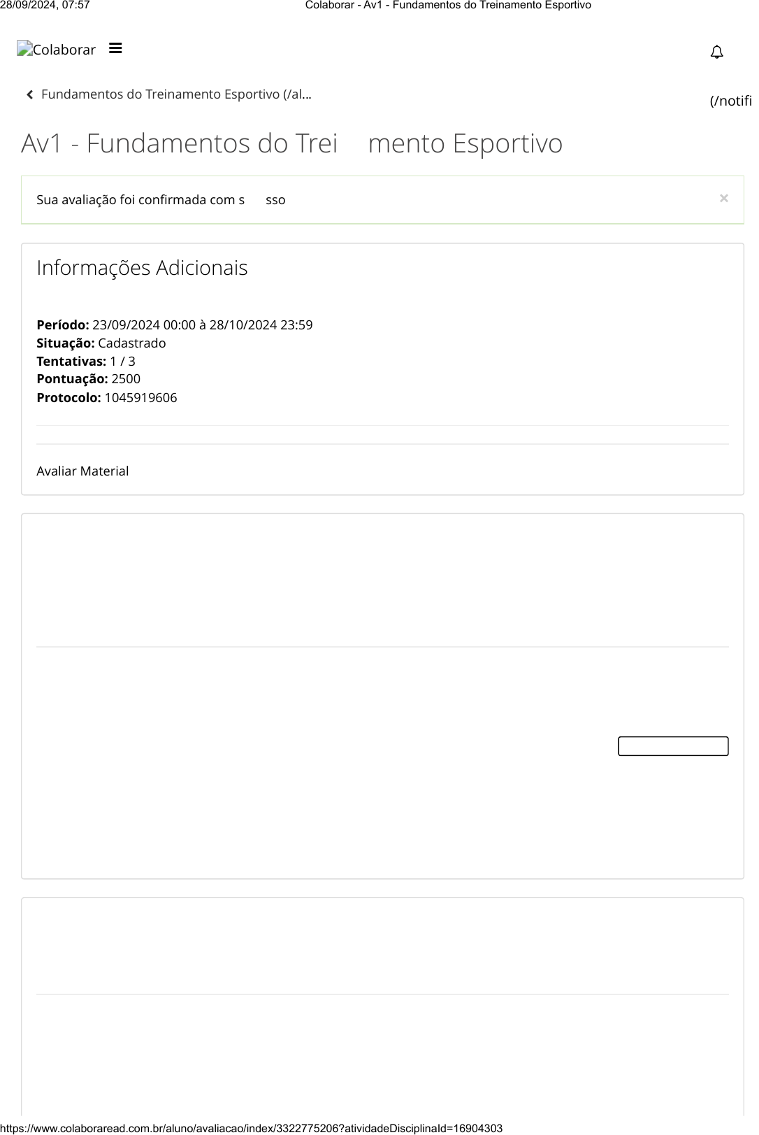 <p> Fundamentos do Treinamento Esportivo (/al…</p><p>Av1 - Fundamentos do Treinamento Esportivo</p><p>Sua avaliação foi confirmada com sucesso</p><p>Colaborar </p><p>(/notific</p><p>×</p><p>Informações Adicionais</p><p>Período: 23/09/2024 00:00 à 28/10/2024 23:59</p><p>Situação: Cadastrado</p><p>Tentativas: 1 / 3</p><p>Pontuação: 2500</p><p>Protocolo: 1045919606</p><p>Avaliar Material</p><p>1)</p><p>a)</p><p>b)</p><p>c)</p><p>d)</p><p>e)</p><p>2)</p><p>a)</p><p>b)</p><p>Apesar da preparação física ser a “pedra fundamental” para o treinamento esportivo, não somente dela se faz</p><p>uma preparação esportiva. Vários outros fatores deverão ser levados em consideração, juntamente aos aspectos</p><p>fisiológicos, para a organização do treinamento esportivo.</p><p>De acordo com a Teoria Geral da Preparação Esportiva, qual desses fatores é fundamental para iniciar o processo de</p><p>treinamento esportivo.</p><p>Alternativas:</p><p>Conhecimento sobre as necessidades de estrutura necessárias para criação de um centro de treinamento.</p><p>Conhecimento sobre as características gerais de cada modalidade, bem como seus sistemas</p><p>de competição, regulamente e locais de competição.</p><p>Alternativa assinalada</p><p>Conhecimento sobre o tamanho da equipe multidisciplinar que necessita para iniciar o processo.</p><p>Conhecimento apenas sobre técnicas e táticas específicas da modalidade.</p><p>Conhecimento apenas sobre aspectos físicos e adaptações necessárias para a modalidade.</p><p>A Educação Física, sempre buscou parâmetros e modelos para desenvolver ao máximo as adaptações dos atletas</p><p>com o objetivo de melhorar o desempenho.</p><p>Nesse sentido, dois modelos principais foram desenvolvidos ao longo dos anos que buscam:</p><p>Alternativas:</p><p>treinar as crianças e investir em infra-estrutura.</p><p>treinar as crianças e investir em tecnologia.</p><p>28/09/2024, 07:57 Colaborar - Av1 - Fundamentos do Treinamento Esportivo</p><p>https://www.colaboraread.com.br/aluno/avaliacao/index/3322775206?atividadeDisciplinaId=16904303 1/3</p><p>https://www.colaboraread.com.br/aluno/timeline/index/3322775206?ofertaDisciplinaId=2242541</p><p>https://www.colaboraread.com.br/aluno/timeline/index/3322775206?ofertaDisciplinaId=2242541</p><p>https://www.colaboraread.com.br/notificacao/index</p><p>https://www.colaboraread.com.br/notificacao/index</p><p>https://www.colaboraread.com.br/notificacao/index</p><p>javascript:void(0);</p><p>c)</p><p>d)</p><p>e)</p><p>3)</p><p>a)</p><p>b)</p><p>c)</p><p>d)</p><p>e)</p><p>4)</p><p>a)</p><p>b)</p><p>c)</p><p>d)</p><p>e)</p><p>5)</p><p>a)</p><p>b)</p><p>c)</p><p>d)</p><p>resultado imediato e formação a curto prazo.</p><p>resultado imediato e formação a longo prazo. Alternativa assinalada</p><p>selecionar os melhores e treinar os jovens.</p><p>Historicamente, o primeiro exemplo de modelo de preparação de atletas sem a preparação com o resultado</p><p>imediato foi a preparação dos atletas alemães para os Jogos Olímpicos de 1936.</p><p>Qual foi o principal objetivo alemão nesse momento da história?</p><p>Alternativas:</p><p>Mostrar ao mundo que a tecnologia de guerra também preparava atletas.</p><p>Mostrar a soberania da raça ariana e do sistema político ao mundo. Alternativa assinalada</p><p>Mostrar que o treinamento esportivo poderia ganhar a Segunda Guerra Mundial.</p><p>Mostrar ao povo alemão que todos passariam por treinamento militar para se preparar para a guerra.</p><p>Mostrar aos europeus que a Alemanha era a melhor nação esportiva.</p><p>Fisicamente, a relação matemática entre o deslocamento de um corpo em determinado tempo pode ser</p><p>considerada uma grandeza que mede o quão rápido um corpo se desloca. No treinamento esportivo é definido</p><p>como VELOCIDADE.</p><p>Metodologicamente, para o desenvolvimento dessa capacidade é necessário que as sessões de treinamento</p><p>tenham:</p><p>Alternativas:</p><p>Baixa intensidade, baixo volume e pausa incompleta.</p><p>Alta intensidade, alto volume e pausa completa.</p><p>Baixo intensidade, baixo volume e pausa completa.</p><p>Alta intensidade, baixo volume e pausa completa. Alternativa assinalada</p><p>Alta intensidade, alto volume e pausa incompleta.</p><p>Atualmente, cresce cada vez mais o número de pessoas nas academias que buscam a hipertrofia muscular</p><p>visando melhoras estéticas. No entanto, existem modalidades esportivas onde essa adaptação é determinante para</p><p>o desempenho esportivo.</p><p>Do ponto de vista atlético, os ganhos decorrentes da hipertrofia muscular são importantes para atletas que:</p><p>Alternativas:</p><p>necessitam gerar muita força, potência e resistência em modalidades cíclicas e acíclicas.</p><p>necessitam gerar muita força, potência e velocidade em modalidades cíclicas e acíclicas. Alternativa assinalada</p><p>necessitam gerar muita resistência, potência e velocidade em modalidades cíclicas e acíclicas.</p><p>necessitam gerar muita força, potência e flexibilidade em modalidades cíclicas e acíclicas.</p><p>28/09/2024, 07:57 Colaborar - Av1 - Fundamentos do Treinamento Esportivo</p><p>https://www.colaboraread.com.br/aluno/avaliacao/index/3322775206?atividadeDisciplinaId=16904303 2/3</p><p>e) necessitam gerar muita flexibilidade, potência e velocidade em modalidades cíclicas e acíclicas.</p><p>28/09/2024, 07:57 Colaborar - Av1 - Fundamentos do Treinamento Esportivo</p><p>https://www.colaboraread.com.br/aluno/avaliacao/index/3322775206?atividadeDisciplinaId=16904303 3/3</p>