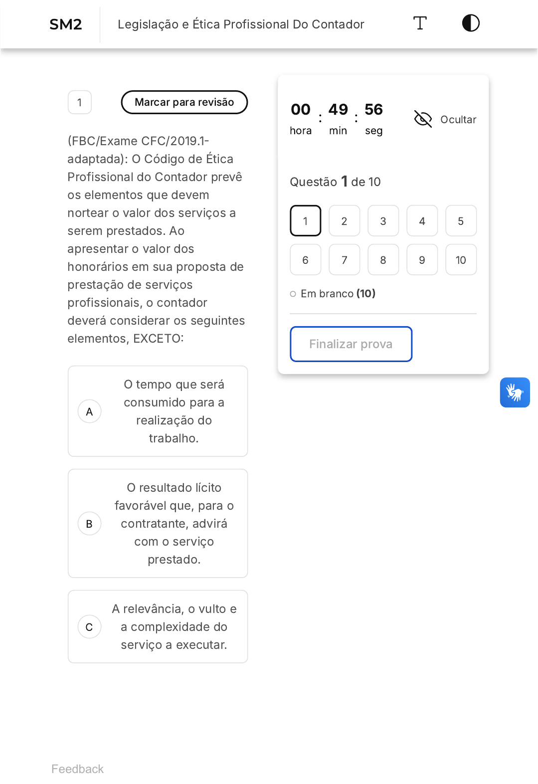 <p>A</p><p>B</p><p>C</p><p>1 Marcar para revisão</p><p>�FBC/Exame CFC/2019.1�</p><p>adaptada): O Código de Ética</p><p>Profissional do Contador prevê</p><p>os elementos que devem</p><p>nortear o valor dos serviços a</p><p>serem prestados. Ao</p><p>apresentar o valor dos</p><p>honorários em sua proposta de</p><p>prestação de serviços</p><p>profissionais, o contador</p><p>deverá considerar os seguintes</p><p>elementos, EXCETO�</p><p>O tempo que será</p><p>consumido para a</p><p>realização do</p><p>trabalho.</p><p>O resultado lícito</p><p>favorável que, para o</p><p>contratante, advirá</p><p>com o serviço</p><p>prestado.</p><p>A relevância, o vulto e</p><p>a complexidade do</p><p>serviço a executar.</p><p>00</p><p>hora</p><p>: 49</p><p>min</p><p>: 56</p><p>seg</p><p>Ocultar</p><p>Questão 1 de 10</p><p>Em branco �10�</p><p>Finalizar prova</p><p>1 2 3 4 5</p><p>6 7 8 9 10</p><p>Feedback</p><p>SM2 Legislação e Ética Profissional Do Contador</p><p>D</p><p>E</p><p>A</p><p>B</p><p>C</p><p>As afirmações</p><p>desproporcionais</p><p>feitas sobre os</p><p>serviços que oferece,</p><p>a fim de que possam</p><p>ser cobradas mais</p><p>horas.</p><p>Os custos e a</p><p>dificuldade do serviço</p><p>a executar.</p><p>2 Marcar para revisão</p><p>O contador deve, com relação</p><p>à classe, observar as seguintes</p><p>normas de conduta:</p><p>não prestar sua</p><p>cooperação moral,</p><p>intelectual e material.</p><p>zelar pelo prestígio da</p><p>classe e pela</p><p>dignidade</p><p>profissional.</p><p>formular juízos</p><p>depreciativos sobre a</p><p>classe contábil;</p><p>D</p><p>E</p><p>não informar aos</p><p>órgãos competentes</p><p>sobre irregularidades</p><p>comprovadamente</p><p>ocorridas na</p><p>administração de</p><p>entidade da classe</p><p>contábil.</p><p>se utilizar de posição</p><p>ocupada em</p><p>entidades de classe</p><p>para benefício próprio</p><p>ou para proveito</p><p>pessoal.</p><p>3 Marcar para revisão</p><p>O Código de Ética Profissional</p><p>do Contador ‒ NBC PG 01 é o</p><p>instrumento que norteia o</p><p>comportamento do contador no</p><p>exercício da profissão.</p><p>Tomando por base as normas</p><p>estabelecidas no documento</p><p>supracitado, analise as</p><p>afirmações abaixo e assinale a</p><p>CORRETA.</p><p>A</p><p>B</p><p>C</p><p>A Norma Brasileira de</p><p>Contabilidade NBC PG</p><p>01 se aplica ao</p><p>exercício da profissão</p><p>do contador, mas não</p><p>se aplica ao do</p><p>técnico em</p><p>contabilidade.</p><p>É vedado ao contador</p><p>indicar, em qualquer</p><p>modalidade ou veículo</p><p>de comunicação, os</p><p>títulos e</p><p>especializações por</p><p>ele obtidos.</p><p>É dever do contador</p><p>renunciar às funções</p><p>que exerce, logo que</p><p>se positive falta de</p><p>confiança por parte</p><p>do cliente ou</p><p>empregador, e vice-</p><p>versa, a quem deve</p><p>notificar por escrito,</p><p>respeitando os prazos</p><p>estabelecidos em</p><p>contrato.</p><p>D</p><p>E</p><p>É dever do contador</p><p>expressar argumentos</p><p>ou dar conhecimento</p><p>de sua convicção</p><p>pessoal sobre os</p><p>direitos de quaisquer</p><p>das partes</p><p>interessadas ou da</p><p>justiça da causa em</p><p>que estiver servindo.</p><p>O contador poderá</p><p>divulgar informação</p><p>confidencial obtida ou</p><p>recebida em</p><p>decorrência da</p><p>relação profissional</p><p>ou comercial após o</p><p>término dessa</p><p>relação, desde que</p><p>para resguardar</p><p>direito ou benefício de</p><p>terceiro.</p><p>4 Marcar para revisão</p><p>O Contabilista poderá requerer</p><p>desagravo público ao Conselho</p><p>Regional de Contabilidade</p><p>quando:</p><p>A</p><p>B</p><p>C</p><p>D</p><p>E</p><p>For atingido, pública e</p><p>injustamente, no</p><p>exercício de sua</p><p>profissão.</p><p>Houver falta cometida</p><p>em defesa de</p><p>prerrogativa</p><p>profissional.</p><p>Não for comunicado</p><p>da instauração do</p><p>processo até 30 dias</p><p>após esgotado o</p><p>prazo de defesa.</p><p>Tiver existido,</p><p>anteriormente, de sua</p><p>parte, prestação de</p><p>relevantes serviços à</p><p>classe contábil.</p><p>For comunicado da</p><p>instauração do</p><p>processo antes de</p><p>trinta dias após</p><p>esgotado o prazo de</p><p>defesa.</p><p>5 Marcar para revisão</p><p>De acordo com o Código de</p><p>Ética Profissional do Contador -</p><p>CEPC e as Normas Brasileiras</p><p>de Contabilidade, julgue os</p><p>procedimentos hipotéticos a</p><p>seguir e, em seguida, assinale</p><p>a opção CORRETA.</p><p>I. As demonstrações contábeis</p><p>da Sociedade Empresária</p><p>foram elaboradas de acordo</p><p>com o que foi definido entre o</p><p>profissional de contabilidade e</p><p>os gestores da sociedade.</p><p>Assim, em decorrência dessas</p><p>definições, as receitas foram</p><p>reconhecidas quando</p><p>recebidas e as despesas,</p><p>quando pagas. Para efeito da</p><p>elaboração do Balanço</p><p>Patrimonial de 31.12.2014, o</p><p>custo das mercadorias</p><p>vendidas e entregues,</p><p>provenientes das receitas não</p><p>recebidas, foram transferidas</p><p>da conta de estoque para</p><p>contas a receber.</p><p>II. Um Contador identificou e</p><p>apresentou em seu relatório de</p><p>auditoria, dirigido aos gestores</p><p>de uma Sociedade Empresária</p><p>objeto desta auditoria, diversos</p><p>equívocos cometidos por um</p><p>colega Contador na aplicação</p><p>das Normas Brasileiras de</p><p>Contabilidade editadas pelo</p><p>Conselho Federal de</p><p>Contabilidade, na elaboração</p><p>das demonstrações contábeis.</p><p>III. Um profissional de</p><p>contabilidade foi contratado</p><p>para dar parecer sobre o</p><p>procedimento contábil a ser</p><p>adotado no reconhecimento de</p><p>um determinado ativo.</p><p>Reconhecendo que o parecer</p><p>poderia ser útil para outros</p><p>profissionais, o Contador</p><p>resolveu publicá-lo em revist