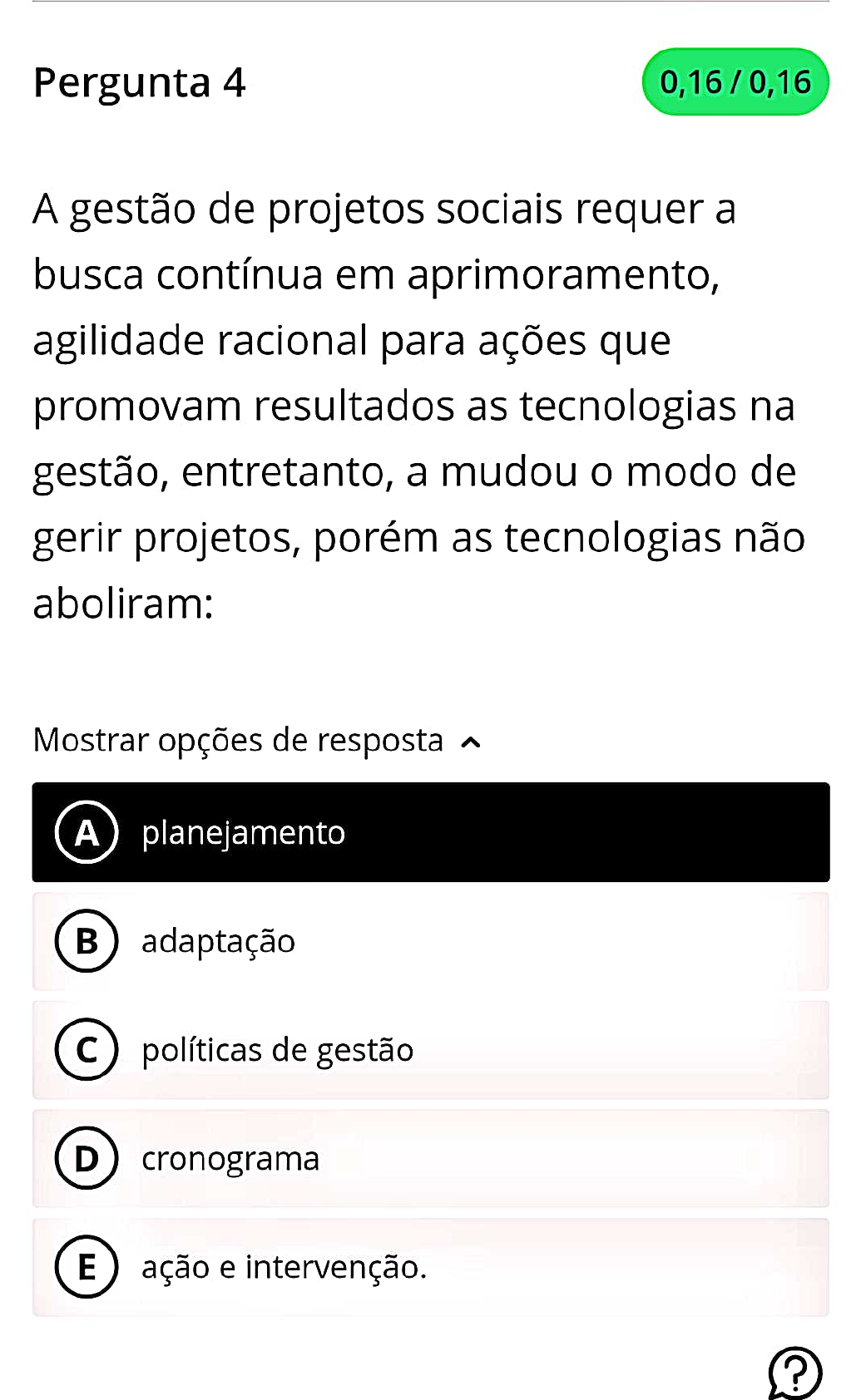 <p>Pergunta 4 0,16/0,16 A gestão de projetos sociais requer a busca contínua em aprimoramento, agilidade racional para ações que promovam resultados as tecnologias na gestão, entretanto, a mudou o modo de gerir projetos, porém as tecnologias não aboliram: Mostrar opções de resposta A planejamento B adaptação políticas de gestão D cronograma E ação e intervenção.</p><p>Pergunta 3 0,16/0,16 A palavra eficiênte é a capacidade de tornar algo efetivo de realizar com mínimo de esforço e recursos sem deixar de lado a competência . A partir dessa análise assinale que é eficiência: Mostrar opções de resposta ^ ação promovida para a implantação de A atividades diversas atividade realizada com pouco esforço, recurso mais com competência capacidade crítica e reflexiva na execução da tarefa D competências nas tarefas de cunho analítico habilidades de realização da atividade E solicitada</p><p>Pergunta 2 0,16/0,16 Habilidades e competências são desenvolvidas no processo formativo e ao longo da vida ação, adaptação e reflexão contribuem para: Mostrar opções de resposta A planejamento e execução B análises sociais. C operação a realizar D sistematização de dados. E pensamento crítico</p><p>Pergunta 1 0,16/0,16 De acordo com a Constituição do Brasil que é cidadania? Mostrar opções de resposta A direitos civis, políticos e sociais. ação social, responsabilidade social e B projeto. C política econômica e responsabilidade social programas sociais e ações de D responsabilidade social E direitos políticos e democratização</p><p>Pergunta 1 0,16/0,16 Habilidades e competências são desenvolvidas no processo formativo e ao longo da vida adaptação e reflexão contribuem para: Mostrar opções de resposta A pensamento crítico B análises sociais. sistematização de D planejamento e execução E operação a realizar Pergunta 2 t Comentários Googl... Pesquisar</p><p>Pergunta 2 0,16/0,16 A palavra eficiênte é a capacidade de tornar algo efetivo de realizar com o mínimo de esforço. e recursos sem deixar de lado a competência A partir dessa análise assinale o que é eficiência: Mostrar opções de resposta A ação promovida para a implantação de atividades diversas B competências nas tarefas de cunho analítico C habilidades de realização da atividade solicitada D atividade realizada com pouco esforço, recurso mais com competência E capacidade crítica e reflexiva na execução da tarefa Crédito total dado Pergunta 3 PARA QUE A QUESTÃO SEJA COMPUTADA, VOCÊ DEVE ASSINALAR UMA DAS ALTERNATIVAS A definição de projeto defendida pela Organização das Nações Unidas é: I Comentários - Googl... Pesquisar</p><p>Pergunta 4 0.17/0.17 Considerando a construção de currículos e projetos pedagógicos em comunidades específicas (como as por exemplo), é CORRETO afirmar que Mostrar opções de resposta A em cases de comunidades vale a pena usar curriculos elaborados em outras Cidades e Estados, para que os alunos não fiquem diferentes o respeito aos elementos que tornam uma comunidade única mas não deveiser maior do que adequação ao conteúdo tradicional das comunidades B urbanas. para que alunos construam impressões consolidadas sobre o seu no mundo posteriormente, entender como a sua comunidade dialoga com C comunidades, é construir um currículo que possa sem as interferências da comunidade. a comunidade não deve ser envolvida na construção do no caso de comunidades indigenas, já que línguas e dialetos podem ser entraves que D devem ser desconsiderados na escola. identificar os pontos de semelhança e de diferenciação entre a comunidade em que vive e as demais é essencial para um pensamento crítico, que reconheça a E multiplicidade de contextos e experiências que coexistem no espaço.</p><p>Pergunta 3 2 0,16 / 0,16 A desigualdade social e a estrutura escolar que em muitos casos é deficitária, somado a baixos salários dos professores em especial em alguns Estados formam parte das dificuldades educacionais que precisam ser ultrapassadas, a produção material, cultural e social deveria ser socializada constantemente, porém, muitas vezes são negadas pela baixa que está vinculada dentre outros elementos a deficiência da compreensão. Complete a lacuna com a palavra correspondente. Mostrar opções de resposta ^ A Razão crítica. B socialização de saberes. C Ação social. D Consciência cidadã. E Mobilidade social.</p><p>Pergunta 4 0,16/0,16 processo educacional qualitativo é essencial na formação de qualquer professor ao estimular nesses profissionais habilidades comunicativas e didáticas, promove o desenvolvimento de um profissional próximo à realidade social dos alunos. A frase indica que a: Mostrar opções de resposta A a linguagem é objeto não naturalizado na educação. B a questão social não está no ensino. C a comunidade escolar não estuda práticas comunicativas. D a linguagem interfere nas práticas docentes. E a comunicação é relativa na docência.</p><p>Pergunta 1 0,16/0,16 Em uma sociedade letrada, a linguagem torna-se cada vez mais necessária e importante para a transmissão e consolidação do conhecimento de culturas e de pensamentos, uma vez que é na linguagem e pela linguagem que homem se constitui como sujeito. A frase indica que a educação é prática comprometida ética e: Mostrar opções de resposta A Eficiente. B Sistematizada. C Relativa. D Democrática. E ?</p><p>Pergunta 4 0,16/0,16 Os desafios da linguagem e da comunicação são significativos os professores observam essas dificuldades que permeia todo processo de formação. Essa análise é relevante porque pela mediação da linguagem e da comunicação se acessa: Mostrar opções de resposta ^ A Mecanismos sociais restritos. B Ferramentas de atualização técnica. Informações e democratiza a educação. D Ações de promoção e incentivo. E Estratégias educacionais amplas. ?</p><p>Pergunta 4 As