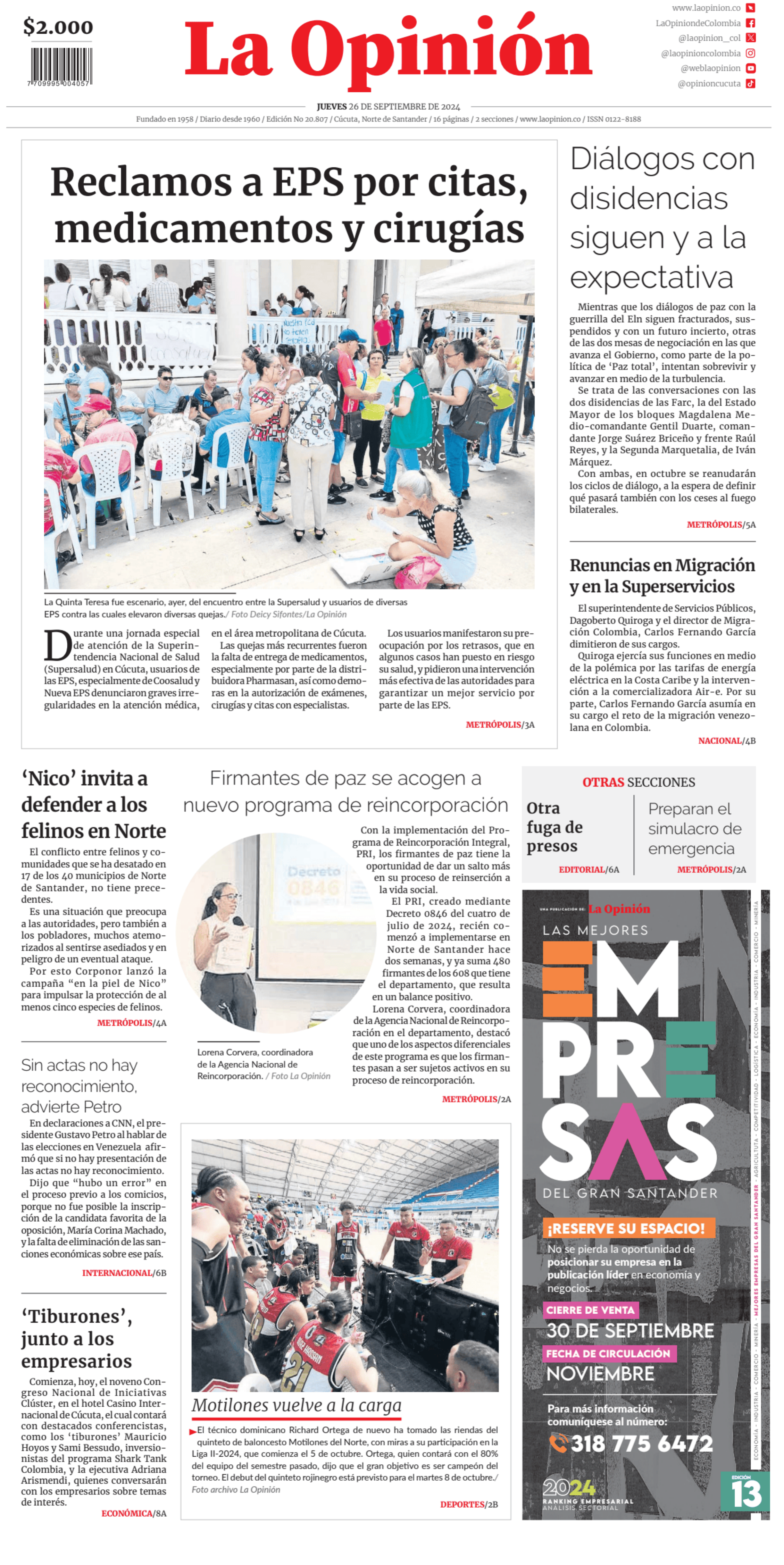<p>Fundado en 1958 Diario desde 1960 No 20.807 Norte de Santander 16 páginas secciones / / ISSN 0122-8188 Diálogos con Reclamos a EPS por citas, disidencias medicamentos y cirugías siguen y a la expectativa Mientras que los diálogos de paz con la guerrilla del Eln siguen fracturados, sus- pendidos y con un futuro incierto, otras de las dos mesas de negociación en las que avanza el Gobierno, como parte de la po- lítica de 'Paz intentan sobrevivir y avanzar en medio de la turbulencia. Se trata de las conversaciones con las dos disidencias de las Farc, la del Estado Mayor de los bloques Magdalena Me- dio-comandante Gentil Duarte, coman- dante Jorge Suárez Briceño y frente Raúl Reyes, y la Segunda Marquetalia, de Iván Con ambas, en octubre se reanudarán los ciclos de diálogo, a la espera de definir qué pasará también con los ceses al fuego bilaterales. Renuncias en Migración y en la Superservicios La Quinta Teresa fue escenario, ayer, del encuentro entre la Supersalud y usuarios de diversas EPS contra las cuales elevaron diversas quejas./ Foto Deicy Opinión El superintendente de Servicios Dagoberto Quiroga y el director de Migra- D urante una jornada especial en el área metropolitana de Cúcuta. Los usuarios manifestaron su pre- ción Colombia, Carlos Fernando García de atención de la Superin- Las quejas más recurrentes fueron ocupación por los retrasos, que en dimitieron de sus cargos. tendencia Nacional de Salud la falta de entrega de medicamentos, algunos casos han puesto en riesgo Quiroga ejercía sus funciones en medio (Supersalud) en Cúcuta, usuarios de especialmente por parte de la distri- su salud, y pidieron una intervención de la polémica por las tarifas de energía las EPS, especialmente de Coosalud buidora Pharmasan, ícomo demo- más efectiva de las autoridades para eléctrica en la Costa Caribe y la interven- Nueva EPS denunciaron graves irre- ras en la autorización de garantizar un mejor servicio por ción a la comercializadora Air-e. Por su gularidades en la atención médica, cirugías y citas con especialistas. parte de las EPS. parte, Carlos Fernando García asumía en su cargo el reto de la migración venezo- lana en NACIONAL/4B 'Nico' invita a Firmantes de paz se acogen a OTRAS SECCIONES defender a los nuevo programa de reincorporación Otra Preparan el felinos en Norte Con la implementación del Pro- fuga de simulacro de grama de Reincorporación Integral, El conflicto entre felinos y co- PRI, los firmantes de paz tiene la presos emergencia munidades que se ha desatado en Decreto oportunidad de dar un salto más 17 de los 40 municipios de Norte EDITORIAL/6A en su proceso de reinserción a de Santander, no tiene prece- 0846 la vida social. dentes. El PRI, creado mediante Es una situación que preocupa Decreto 0846 del cuatro de La Opinión a las autoridades, pero también a julio de 2024, recién co- los pobladores, muchos atemo- LAS MEJORES menzó a implementarse en rizados al sentirse asediados y en Norte de Santander hace peligro de un eventual ataque. dos semanas, y ya suma 480 Por esto Corponor lanzó la firmantes de los 608 que tiene campaña "en la piel de Nico" el departamento, que resulta para impulsar la protección de al en un balance positivo. menos cinco especies de felinos. Lorena Corvera, coordinadora de la Agencia Nacional de Reincorpo- ración en el departamento, que uno de los aspectos diferenciales Lorena Corvera, coordinadora Sin actas no hay de este programa es que los firman- de la Agencia Nacional de tes pasan a ser sujetos activos en su / Foto La reconocimiento, proceso de reincorporación. PR advierte Petro En declaraciones a CNN, el pre- sidente Gustavo Petro al hablar de las elecciones en Venezuela afir- mó que si no hay presentación de las actas no hay reconocimiento. SAS Dijo que "hubo un error" en el proceso previo a los comicios, DEL GRAN SANTANDER porque no fue posible la inscrip- ción de la candidata favorita de la oposición, María Corina Machado, SU ESPACIO! y falta de eliminación de las san- ciones económicas sobre ese país. No se pierda la oportunidad de posicionar su empresa en la INTERNACIONAL/6B publicación líder en economía y 'Tiburones', CIERRE DE VENTA junto a los 30 DE SEPTIEMBRE empresarios FECHA DE CIRCULACIÓN Comienza, hoy, el noveno Con- NOVIEMBRE greso Nacional de Iniciativas Clúster, en el hotel Casino Inter- nacional de Cúcuta, el cual contará Motilones vuelve a la carga Para más información con destacados conferencistas, al número: como los 'tiburones' Mauricio El técnico dominicano Richard Ortega de nuevo ha tomado las riendas del Hoyos y Sami Bessudo, inversio- quinteto de baloncesto Motilones del Norte, con miras a su participación en la nistas del programa Shark Tank Liga que comienza el 5 de octubre. Ortega, quien contará con el 80% 318 775 6472 Colombia, y la ejecutiva Adriana del equipo del semestre pasado, dijo que el gran objetivo es ser campeón del Arismendi, quienes conversarán torneo. El debut del quinteto rojinegro está previsto para el martes 8 de octubre./ con los empresarios sobre temas Foto archivo La 2024 de interés. DEPORTES/2B RANKING ECONÓMICA/SA ANALISIS TORIAL</p><p>2A METRÓPOLIS La Opinión JUEVES 26 DE SEPTIEMBRE DE 2024 Iniciativa del Gobierno Nacional en respaldo al Acuerdo de Paz En Norte de Santander se activa plan de reincorporación integral Redaccion José Salcedo mariajose .com.co ace dos semanas comenzó en H Norte de Santander la imple- mentación del Programa Inte- gral de Reincorporación, una iniciativa del Gobierno Nacional creada pormedio del Decreto 0846 del 4 de julio de 2024 con el que se busca dar impulso defini- tivo al tránsito de los firmantes de paz hacia una ciudadanía plenay autónoma. A la fecha, el balance es muy positivo, aseguró Lorena Corvera, coordinadora regional de la Agencia de Reincorpora- ción Nacional, toda vez que 480 de los 608 firmantes de paz han refrendado el acta para continuar en el proceso. El PR