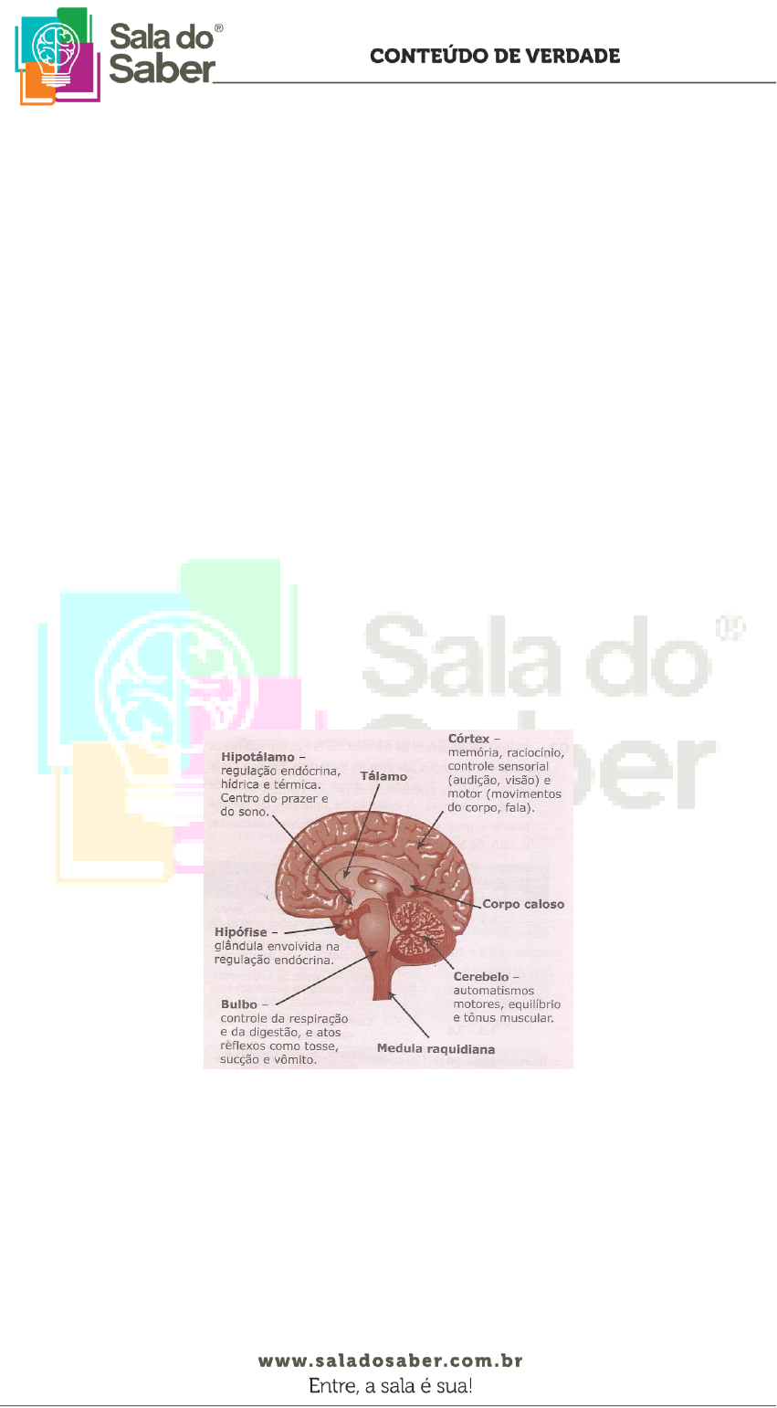 <p>VIDEOAULA – DIVISÃO, ORGANIZAÇÃO E FUNÇÕES</p><p>01. A análise de certos alimentos revelou contaminação por pesticidas organofosforados. Tais</p><p>substâncias são tóxicas, principalmente, por alterarem a fisiologia normal do sistema nervoso,</p><p>bloqueando a degradação do mediador químico do sistema nervoso autônomo</p><p>parassimpático. O mediador mencionado e uma de suas ações são, respectivamente,</p><p>a) acetilcolina: dilatação das pupilas.</p><p>b) acetilcolina: diminuição da frequência cardíaca.</p><p>c) epinefrina: inibição da percepção sensorial.</p><p>d) noradrenalina: relaxamento da musculatura lisa.</p><p>e) adrenalina: controle central dos movimentos.</p><p>02. Entre as afirmativas a seguir, a única incorreta é:</p><p>a) O centro respiratório está situado na ponte.</p><p>b) Os sistemas simpático e parassimpático exercem ações antagônicas.</p><p>c) Uma lesão no cerebelo pode interferir no controle do equilíbrio.</p><p>d) Participam de um arco reflexo: receptor, via aferente, centro, via eferente e efetuador.</p><p>e) A substância cinzenta da medula é formada, principalmente, de corpos celulares.</p><p>03. Algumas regiões do SNC estão indicadas, bem como algumas de suas funções.</p><p>Com auxílio da figura, assinale a alternativa incorreta.</p><p>a) O cerebelo age somente sobre o sistema nervoso autônomo.</p><p>b) O hipotálamo controla a função de várias glândulas por meio da hipófise.</p><p>c) Lesões no córtex podem afetar tanto a interpretação de informações sensoriais como também</p><p>algumas das respostas voluntárias.</p><p>d) Centros nervosos do bulbo podem afetar o ritmo ventilatório e as trocas gasosas.</p><p>e) Algumas funções do sistema nervoso simpático e parassimpático podem ser afetadas por</p><p>lesão na medula raquidiana.</p><p>04. Com base nos conhecimentos sobre o sistema nervoso humano, assinale o que for correto.</p><p>01) O lobo frontal coordena movimentos como andar de bicicleta, além de coordenar</p><p>pensamentos e raciocínio.</p><p>02) A medula espinhal elabora respostas simples a determinados estímulos, tais como retirar a</p><p>mão após um choque elétrico.</p><p>04) Ao ingerir algum alimento, o sistema nervoso somático entra em ação estimulando o</p><p>estômago a produzir o suco digestivo.</p><p>08) Situações de estresse, como em um estado de perigo, são associadas ao sistema nervoso</p><p>central e à adrenalina.</p><p>16) O sistema nervoso periférico autônomo simpático é diretamente responsável pela palidez</p><p>facial e pelas mãos geladas, características nos episódios de sustos.</p><p>05. “Logo após a morte da cantora britânica Amy Winehouse, em 23 de julho passado, teorias</p><p>sobre as causas do óbito começaram a aparecer. Além da tese óbvia de uma overdose de drogas,</p><p>havia a possibilidade, levantada pela família, de a cantora ter morrido por abstinência de álcool”.</p><p>Sobre o alcoolismo, é correto afirmar que:</p><p>01) durante a abstinência do álcool a pressão sanguínea pode aumentar, a pessoa pode ter</p><p>taquicardia, tremores, ficar ansiosa, suar frio.</p><p>02) o grau máximo da abstinência do álcool é chamado de Delirium tremens, caracterizado por</p><p>crises convulsivas.</p><p>04) o sistema nervoso parassimpático é o responsável pela taquicardia, pela ansiedade e pelo</p><p>aumento da pressão sanguínea.</p><p>08) o álcool altera a atividade de neurotransmissores, estimulando o indivíduo a procurar doses</p><p>cada vez maiores para atingir o efeito prazeroso.</p><p>16) a ingestão de álcool altera as atividades autônomas controladas pelo sistema nervoso</p><p>periférico somático.</p>