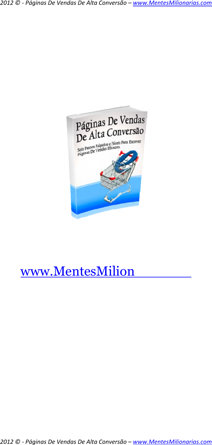 <p>2012 © ‐ Páginas De Vendas De Alta Conversão – www.MentesMilionarias.com</p><p>2012 © ‐ Páginas De Vendas De Alta Conversão – www.MentesMilionarias.com</p><p>Páginas De Vendas De Alta</p><p>Conversão</p><p>“Seis Passos Rápidos e Fáceis Para</p><p>Escrever Páginas De Vendas Eficazes“</p><p>Trazido Até Si Por</p><p>www.MentesMilionarias.com</p><p>2012 © ‐ Páginas De Vendas De Alta Conversão – www.MentesMilionarias.com</p><p>2012 © ‐ Páginas De Vendas De Alta Conversão – www.MentesMilionarias.com</p><p>Páginas De Vendas De Alta Conversão</p><p>Termos e Condições</p><p>Aviso Legal</p><p>O escritor esforçou‐se para ser o tão exacto e completo quanto possível</p><p>na criação deste relatório, em todo o caso ele não garante em qualquer</p><p>altura o conteúdo descrito devido às mudanças rápidas que existem na</p><p>internet.</p><p>Apesar de se ter feito todas as tentativas de se verificar toda a</p><p>informação nesta publicação, o editor não assume qualquer</p><p>responsabilidade por erros, omissões ou interpretações erradas deste</p><p>livro. Quaisquer referencias a pessoas específicas, organizações não são</p><p>intencionais.</p><p>Nos livros de conselhos práticos, tal como na vida, não existem garantias</p><p>para um rendimento. Os leitores são avisados de fazer o seu próprio</p><p>julgamento sobre as suas circunstâncias e agir de acordo com isso.</p><p>Este livro não tem a intenção de ser usado como conselheiro legal, de</p><p>negócios ou financeiro. Todos os leitores são aconselhados a procurar</p><p>serviços de profissionais competentes nos campos legais, de negócios e</p><p>finanças.</p><p>2012 © ‐ Páginas De Vendas De Alta Conversão – www.MentesMilionarias.com</p><p>2012 © ‐ Páginas De Vendas De Alta Conversão – www.MentesMilionarias.com</p><p>Aconselho‐o a imprimir este livro para ser mais fácil de ler.</p><p>2012 © ‐ Páginas De Vendas De Alta Conversão – www.MentesMilionarias.com</p><p>2012 © ‐ Páginas De Vendas De Alta Conversão – www.MentesMilionarias.com</p><p>Introdução</p><p>Admitamos, se você não sabe escrever uma página de vendas, você não</p><p>é capaz de vender os seus produtos.</p><p>É um facto.</p><p>É por isso que estamos aqui para o levar através do nosso modelo</p><p>comprovado pedaço por pedaço, passo a passo, para que você o possa</p><p>reproduzir adaptando ao conteúdo que vai no seu coração.</p><p>Onde é que você começa numa página de vendas?</p><p>Como é que você cria um título atractivo?</p><p>Como é que você se conecta com os seus leitores de tal forma que eles</p><p>não conseguem tirar os olhos do seu site até terem comprado o seu</p><p>produto?</p><p>Estamos prestes a responder a todas estas perguntas e muitas mais. A</p><p>coisa boa é que você não precisa ir em todos os cursos extensivos com</p><p>direitos de autor, você não precisa passar anos a praticar, e não há</p><p>absolutamente nenhuma necessidade de você ser um especialista ou</p><p>escritor experiente.</p><p>Contanto que você possa escrever em português, este modelo funciona</p><p>sempre.</p><p>Agora vamos começar a trabalhar!</p><p>Para o seu sucesso,</p><p>Rui Ludovino</p><p>2012 © ‐ Páginas De Vendas De Alta Conversão – www.MentesMilionarias.com</p><p>2012 © ‐ Páginas De Vendas De Alta Conversão – www.MentesMilionarias.com</p><p>Visão Geral das Páginas De Vendas</p><p>Parte 1</p><p>● Introduzir a escrita para vendas num formato fácil de seguir e repetir.</p><p>● Mostrar‐lhe maneiras simples mas eficazes de fazer títulos que levam</p><p>as pessoas a ficarem coladas ao resto da sua página de vendas.</p><p>● Expandir o tulo com imaginação, e ainda captar a atenção através de</p><p>um subtítulo poderoso.</p><p>● Manter as coisas interessantes à medida que avançamos, ainda que</p><p>com a única intenção de vender o seu produto, o poder de cativar os</p><p>seus leitores com efeitos simples é mais fácil do que parece.</p><p>● Mostrar o que fazer em cada caso, se você ficar sem ideias ou</p><p>inspiração, e como manter essas ideias e a sua escrita a fluir.</p><p>● Demonstrar o quão rápido você pode criar uma página de vendas em</p><p>cerca de algumas horas para a cópia longa.</p><p>● Explicar como deixar os seus pensamentos e as palavras fluírem com a</p><p>intenção de esclarecer o essencial e voltar mais tarde para fazê‐lo soar</p><p>de água na boca para os seus leitores.</p><p>● Fazer valer a sua autoridade sobre o assunto, e oferecer a prova para</p><p>fins de demonstração e construção de confiança, sem ter que mostrar</p><p>extratos bancários de milhões de dólares na sua conta.</p><p>● Diferenciar entre caracterís cas e bene cios sólidos ao escrever as</p><p>suas Páginas De Vendas, e a importância que isto tem a atrair clientes.</p><p>2012 © ‐ Páginas De Vendas De Alta Conversão – www.MentesMilionarias.com</p><p>2012 © ‐ Páginas De Vendas De Alta Conversão – www.MentesMilionarias.com</p><p>vou aquiPacotes de Páginas De Vendas</p><p>Parte 1</p><p>Bem‐vindo à seção de escrita de Páginas De Vendas.</p><p>Algo que pode ser bastante assustador se você nunca o fez antes, dada</p><p>a sua importância.</p><p>Se errar esta parte ninguém vai comprar o seu material, o que</p><p>simplesmente significa que não há dinheiro para si.</p><p>É exatamente por este motivo que decidimos montar uma espécie de</p><p>explicação passo‐a‐passo, de cima para baixo, do início para o fim, que</p><p>lhe permite adaptar‐se nos seus próprios termos, à mudança dos</p><p>tempos e às circunstâncias.</p><p>Como você já deve ter notado, não importa onde você vai na internet,</p><p>não importa o que você está a comprar, existem todo o tipo de cópias e</p><p>técnicas de vendas.</p><p>Nós vamos focar‐nos aqui na “cópia longa”.</p><p>Eu digo longa, o compri