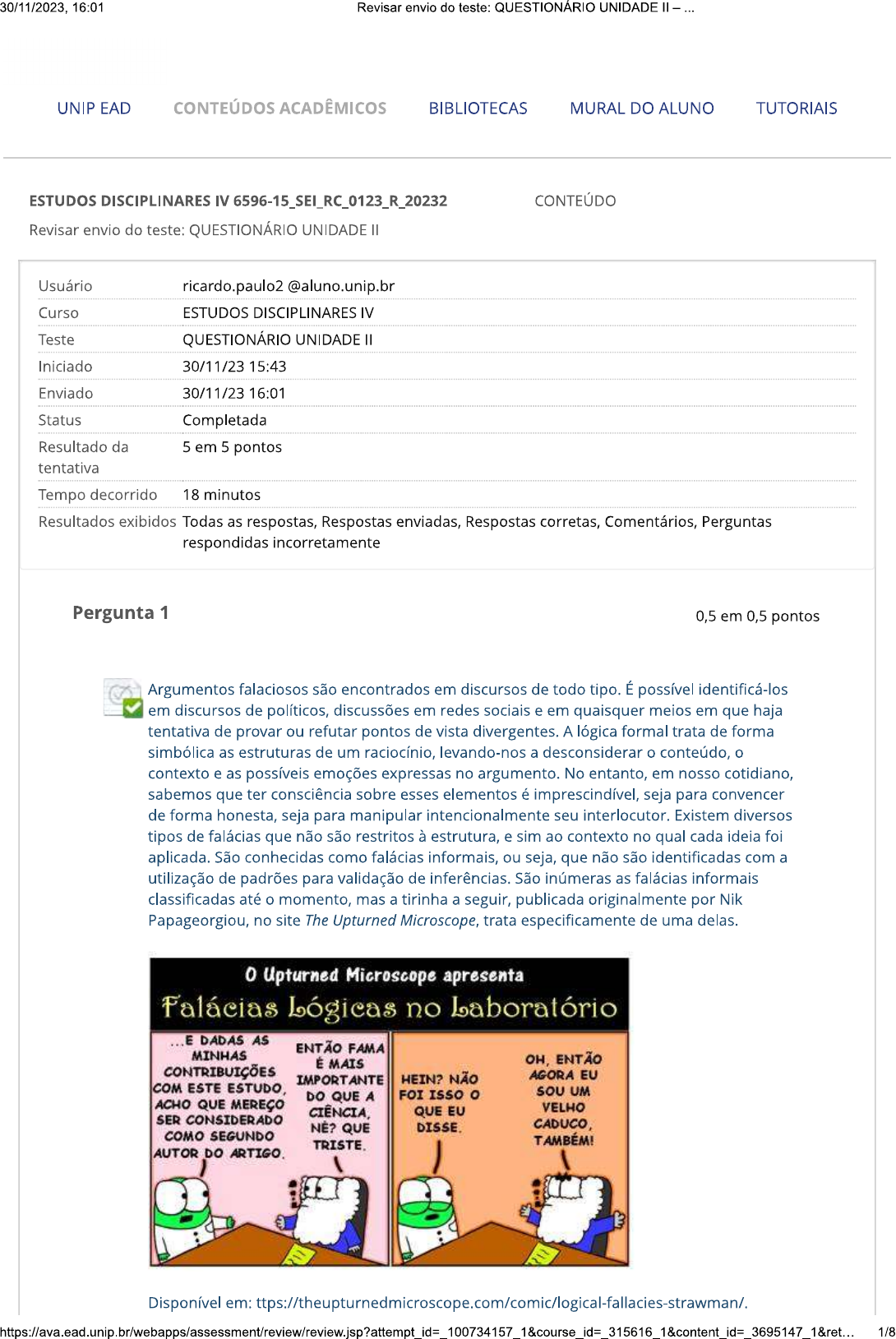 <p>30/11/2023, 16:01 Revisar envio do teste: QUESTIONÁRIO UNIDADE UNIP EAD CONTEÚDOS ACADÊMICOS BIBLIOTECAS MURAL DO ALUNO TUTORIAIS ESTUDOS DISCIPLINARES IV 6596-15_SEI_RC_0123_R_20232 CONTEÚDO Revisar envio do teste: QUESTIONÁRIO UNIDADE Usuário icardo.paulo2@aluno.unip.br Curso ESTUDOS DISCIPLINARES IV Teste QUESTIONÁRIO UNIDADE Iniciado 30/11/23 15:43 Enviado 30/11/23 16:01 Status Completada Resultado da 5 em 5 pontos tentativa Tempo decorrido 18 minutos Resultados exibidos Todas as respostas, Respostas enviadas, Respostas corretas, Comentários, Perguntas respondidas incorretamente Pergunta 1 0,5 em 0,5 pontos Argumentos falaciosos são encontrados em discursos de todo tipo. É possível identificá-los em discursos de políticos, discussões em redes sociais e em quaisquer meios em que haja tentativa de provar ou refutar pontos de vista divergentes. A lógica formal trata de forma simbólica as estruturas de um raciocínio, levando-nos a desconsiderar o conteúdo, o contexto e as possíveis emoções expressas no argumento. No entanto, em nosso cotidiano, sabemos que ter consciência sobre esses elementos é imprescindível, seja para convencer de forma honesta, seja para manipular intencionalmente seu interlocutor. Existem diversos tipos de falácias que não são restritos à estrutura, e sim ao contexto no qual cada ideia foi aplicada. São conhecidas como falácias informais, ou seja, que não são identificadas com a utilização de padrões para validação de inferências. São inúmeras as falácias informais classificadas até o momento, mas a tirinha a seguir, publicada originalmente por Nik Papageorgiou, no site The Upturned Microscope, trata especificamente de uma delas. Upturned Microscope apresenta Falácias Lógicas no Laboratório E DADAS AS ENTÃO FAMA MINHAS É MAIS OH, ENTÃO CONTRIBUIÇÕES IMPORTANTE HEIN? NÃO AGORA EU COM ESTE DO QUE A FOI ISSO o SOU UM ACHO QUE MEREÇO QUE EU VELHO SER CONSIDERADO QUE DISSE. CADUCO, COMO SEGUNDO TAMBÉM! AUTOR DO Disponível em: 1/8</p><p>30/11/2023, 16:01 Revisar envio do teste: QUESTIONÁRIO UNIDADE Acesso em: 22 nov. 2021 (adaptado). É evidente que a falácia retratada se trata do(a): Resposta Selecionada: d. Espantalho. Respostas: Petição de princípio. a. b. Generalização apressada. Causa questionável. C. d. Espantalho. e. Apelo à autoridade irrelevante. Comentário da Resposta: D resposta: Comentário: O argumento acima, exposto em um uma tirinha, retrata a falácia do espantalho. Um dos integrantes do diálogo, ao invés de rebater a colocação de seu interlocutor com argumentos, opta por distorcer o que foi dito, de forma a tornar a refutação mais fácil. Pergunta 2 0,5 em 0,5 pontos A College, sediada em Nova lorque, publicou uma série de quadrinhos nos quais o personagem "Dr. Fallacy", uma coruja, aparece representando diversas falácias lógicas. Leia o quadrinho a seguir, que retrata uma das falácias estudadas por nós. FoodMart Você soube dos adolescentes que do centro do cidade? Eu soubel Adolescentes são irresponsáveis Disponível Acesso em: 22 nov. 2021 (adaptado). É evidente que a falácia retratada se trata do(a): Resposta Selecionada: Generalização apressada. a. Respostas: Generalização apressada. a. b. Causa questionável. 2/8</p><p>30/11/2023, 16:01 Revisar envio do teste: QUESTIONÁRIO UNIDADE C. Petição de princípio. d. Apelo à autoridade irrelevante. Apelo à popularidade. e. Comentário da Resposta: A resposta: Comentário: argumento acima é uma generalização apressada. A partir da observação do caso de apenas alguns adolescentes, o interlocutor conclui que esse caso é representativo de todos eles. Pergunta 3 0,5 em 0,5 pontos Leia o diálogo abaixo, onde uma falácia lógica é cometida. - Seu argumento é um erro de raciocínio porque é uma falácia. Mas por que meu argumento é falacioso? Ora, porque é um erro de raciocínio! Sobre o argumento acima, é correto afirmar que se trata de um (a): Resposta Selecionada: a. Petição de princípio. Respostas: Petição de princípio. a. b. Generalização apressada. Amostra limitada. C. d. Apelo à popularidade. e. Argumento Ad Hominem. Comentário Resposta: A da resposta: Comentário: argumento acima, exposto em um diálogo, é uma petição de princípio. Um dos integrantes do diálogo, ao justificar sua conclusão, simplesmente repetiu o que já havia afirmado inicialmente. Por isso, a petição de princípio também é chamada de raciocínio circular. A pessoa que a proferiu, ao invés de apresentar novas informações que justifiquem seu posicionamento, simplesmente retoma o que já havia afirmado, mas com palavras um pouco diferentes. Pergunta 4 0,5 em 0,5 pontos Leia o argumento a seguir. galo sempre canta antes de o sol nascer. Portanto, o sol nasce justamente por causa do canto do galo. Sobre esse argumento, é correto afirmar que se trata de um(a): 3/8</p><p>30/11/2023, 16:01 Revisar envio do teste: QUESTIONÁRIO UNIDADE Resposta Selecionada: b. Causa questionável. Respostas: Generalização apressada. a. b. Causa questionável. Petição de princípio. C. d. Apelo à autoridade irrelevante. Apelo à popularidade. e. Comentário da Resposta: B resposta: Comentário: O argumento acima é uma falácia da causa questionável. A partir da observação da sequência de dois eventos, foi concluído, erroneamente, que um ocasionou o outro. Pergunta 5 0,5 em 0,5 pontos (CEBRASPE/2016 - adaptada) Leia o diálogo a seguir, entre dois interlocutores que discordam a respeito de um tema. - Eu considero que castigos são uma forma eficaz de educar crianças. seu argumento já é, de saída, inválido! Você, que o defende, não tem conhecimento de causa para opinar sobre a melhor maneira de educar uma criança. Como considerar o ponto de vista de uma pessoa que nunca teve filhos? Reitero: o argumento em discussão não é válido! A segunda fala foi proferida por uma pessoa que, claramente, é contrária à ideia de qu
