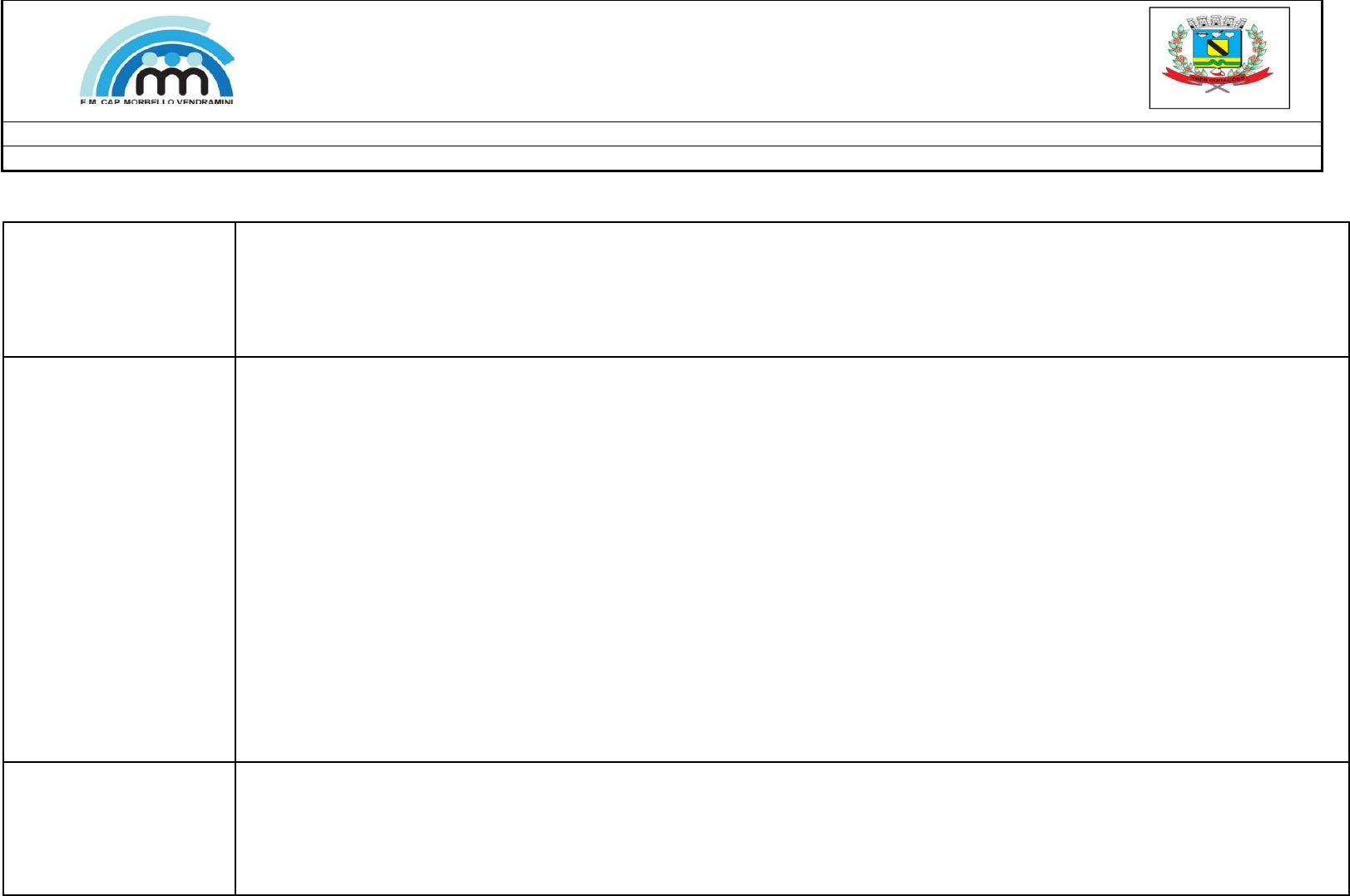<p>PREFEITURA MUNICIPAL DE TRÊS CORAÇÕES “TERRA DE REI PELÉ”</p><p>ESCOLA MUNICIPAL CAPITÃO MORBELLO VENDRAMINI PLANEJAMENTO SEMANAL PERÍODO: 18 A 23/03/2024</p><p>PROFESSORA: Cáriem, Cida, Daniele, Sandra e Silvani 3º ano A - B - C - D - E - F MÊS: MARÇO</p><p>Professora responsável: Silvani Santos</p><p>COMPONENTES CURRICULARES /ÁREA DE CONHECIMENTO:</p><p>PRÁTICAS DE LINGUAGENS / HABILIDADES</p><p>LÍNGUA PORTUGUESA / LINGUAGENS</p><p>Oralidade (EF15LP10) Escutar, com atenção, falas de professores e colegas, formulando perguntas pertinentes ao tema e solicitando esclarecimentos sempre que necessário.</p><p>Oralidade (EF15LP09) Expressar-se em situações de intercâmbio oral com clareza, preocupando-se em ser compreendido pelo interlocutor e usando a palavra com tom de voz audível, boa articulação e ritmo adequado.</p><p>Leitura/escuta (compartilhada e autônoma) (EF35LP02) Selecionar livros da biblioteca e/ou do cantinho de leitura da sala de aula e/ou disponíveis em meios digitais para leitura individual, justificando a escolha e compartilhando com os colegas sua opinião, após a leitura. ( C,g,qu e gu)</p><p>Análise linguística/ semiótica (ortografização) (EF35LP13) Memorizar a grafia de palavras de uso frequente nas quais as relações fonema-grafema são irregulares e com h inicial que não representa fonema.</p><p>Análise linguística/ semiótica (ortografização) (EF03LP05) Identificar o número de sílabas de palavras, classificando- as em monossílabas, dissílabas, trissílabas e polissílabas.</p><p>ARTE / LINGUAGENS</p><p>(EF15AR27MGP3) Conhecer a história da Arte e os diversos artistas locais, se expressando através linguagens artísticas (Artes Visuais, Música, Dança e Teatro), resgatando as tradições culturais de cada município.</p><p>MATEMÁTICA</p><p>Álgebra (EF03MA10) Identificar regularidades em sequências ordenadas de números naturais, resultantes da realização de adições ou subtrações sucessivas, por um mesmo número, descrever uma regra de formação da sequência e determinar elementos faltantes ou seguintes.</p><p>Números (EF03MA01) Ler, escrever e comparar números naturais de até a ordem de unidade de milhar, estabelecendo relações entre os registros numéricos e em língua materna.</p><p>NúmerosEF03MA02) Identificar características do sistema de numeração decimal, utilizando a composição e a decomposição de número natural de até quatro ordens. ( 3 ordens)</p><p>Grandezas e medidas (EF03MA24A) Resolver problemas que envolvam a comparação e a equivalência de valores monetários do sistema brasileiro em situações de compra, venda e troca.</p><p>CIÊNCIAS / Ciências da Natureza</p><p>Matéria e energia (EF03CI03X) Discutir hábitos necessários para a manutenção da saúde auditiva e visual considerando as condições do ambiente em termos de som e luz no cotidiano das pessoas.</p><p>HISTÓRIA / Ciências da humanas</p><p>As pessoas e os grupos que compõem a cidade e o município (EF03HI01) Identificar os grupos populacionais que formam a cidade, o município e a região, as relações estabelecidas entre eles e os eventos que marcam a formação da cidade, como fenômenos migratórios (vida rural/ vida urbana), desmatamentos, estabelecimento de grandes empresas, etc.</p><p>GEOGRAFIA /</p><p>Ciências da humanas</p><p>O sujeito e seu lugar no mundo (EF03GE01) Identificar e comparar aspectos culturais dos grupos sociais de seus lugares de vivência, seja na cidade, seja no campo.</p><p>ENSINO RELIGIOSO /</p><p>CIÊNCIAS HUMANAS</p><p>Identidades e Alteridades (EF03ER07MG) Identificar diferentes tipos de espaço e de território em sua localidade.</p><p>ATIVIDADES SEMANAIS</p><p>H</p><p>2ª FEIRA – 18/03</p><p>3ª FEIRA- 19/03</p><p>4ª FEIRA- 20/03</p><p>5ª FEIRA – 21/03</p><p>6ª FEIRA- 22/03</p><p>SÁBADO</p><p>Quarta-feira</p><p>1º H.</p><p>Língua Portuguesa: Livro: Livro Da escola para o mundo Pág 8,9. Da escola para o mundo Leitura : O diamante e o vaga-lume Pág 10 Interpretação do texto 11.</p><p>3- Língua Portuguesa:</p><p>Livro: Da escola para o mundo</p><p>- Leitura e interpretação oral do texto: A ilha do tesouro. Pág 10 e 11</p><p>5- Língua Portuguesa Livro: Da escola para o mundo págs:12 Atividade xerocada: Classificação de palavras de acordo com o número de sílabas.</p><p>Palavras com c e qu.</p><p>4.História /geografia Construção de maquete (orientação do trabalho para casa) dividir em representações.</p><p>Página:16 em sala página 17 em casa ( prazo de 15 dias para entrega) Apresentação em sala.</p><p>6 -Língua Portuguesa:</p><p>Livro: Da escola para o mundo págs:13 e 14</p><p>Produção de escrita - narrativa de aventura</p><p>Língua Portuguesa Leitura e interpretação</p><p>2º H</p><p>Correção.</p><p>4- Língua Portuguesa: Atividade xerocada: Divisão silábica Produção de frases com as palavras trabalhadas na divisão sílabica.</p><p>1 Ciências</p><p>Livro: A conquista</p><p>páginas 6 e 7</p><p>3 Ciências</p><p>Livro: A conquista páginas 14 e 15.</p><p>5.História /geografia As inter-relações dos grupos populacionais. Livro: Entre Laços Páginas 18, 19</p><p>6-História /geografia</p><p>O crescimento econômico e tecnológico.</p><p>Livro: Entre Laços Páginas 20, 21</p><p>Ciências Leitura e interpretação</p><p>3º H</p><p>2- Língua Portuguesa: Plural e singular, correção.</p><p>3- Matemática:</p><p>Resolver</p><p>Adições sucessivas</p><p>2 Ciências</p><p>Livro: A conquista</p><p>páginas 8, 9, 10, 11.</p><p>5 -Matemática:</p><p>Livro: Da escola para o mundo</p><p>Pág 10 -11.</p><p>Ler, escrever e comparar números naturais.</p><p>Aula de arte. Livro: Da escola para o mundo Págs: 10 - 11 -</p><p>12- 13.</p><p>Exploração oral:</p><p>- Artistas locais (artes visuais, música, dança e teatro).</p><p>Ciências</p><p>Recorte e colagem Imagens da natureza. ( revistas)</p><p>4º H</p><p>1- Matemática: Livro: Da escola