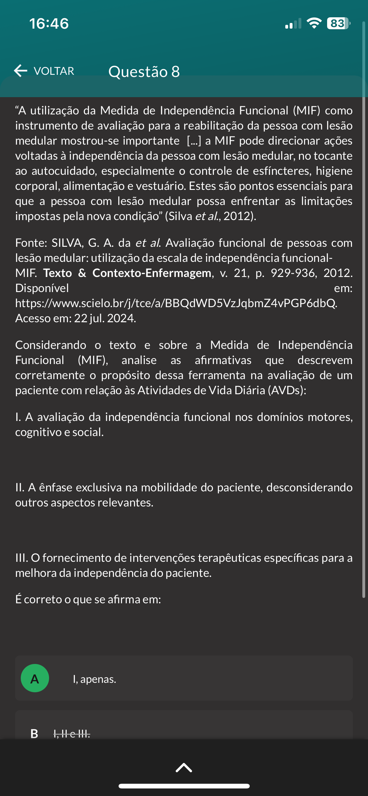<p>16:46 83 VOLTAR Questão 8 "A utilização da Medida de Independência Funcional (MIF) como instrumento de avaliação para a reabilitação da pessoa com lesão medular mostrou-se importante [...] a MIF pode direcionar ações voltadas à independência da pessoa com lesão medular, no tocante ao autocuidado, especialmente controle de esfíncteres, higiene corporal, alimentação e vestuário. Estes são pontos essenciais para que a pessoa com lesão medular possa enfrentar as limitações impostas pela nova condição" (Silva et al., 2012). Fonte: SILVA, G. A. da et al. Avaliação funcional de pessoas com lesão medular: utilização da escala de independência funcional- MIF. Texto & Contexto-Enfermagem, V. 21, p. 929-936, 2012. Disponível em: https://www.scielo.br/j/tce/a/BBQdWD5VzJqbmZ4vPGP6dbQ Acesso em: 22 jul. 2024. Considerando texto e sobre a Medida de Independência Funcional (MIF), analise as afirmativas que descrevem corretamente propósito dessa ferramenta na avaliação de um paciente com relação às Atividades de Vida Diária (AVDs): I. A avaliação da independência funcional nos domínios motores, cognitivo e social. II. A ênfase exclusiva na mobilidade do paciente, desconsiderando outros aspectos relevantes. III. O fornecimento de intervenções terapêuticas específicas para a melhora da independência do paciente. É correto que se afirma em: A I, apenas. B</p>