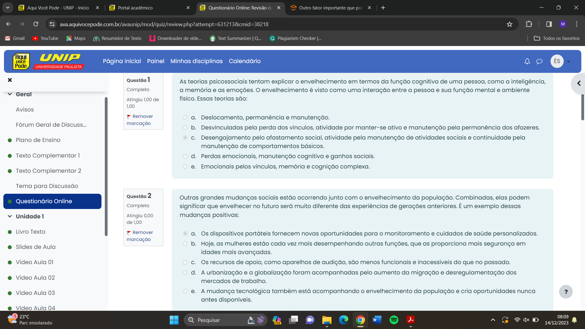 <p>Aqui Você Pode - UNIP - Início Portal acadêmico Questionário Online: Revisão da x Outro fator importante que po + - X M Gmail YouTube Maps Resumidor de Texto Downloader de víde... Text Summarizer Plagiarism Checker |... Todos os favoritos Aqui UNIP voce Página inicial Painel Minhas disciplinas Calendário ÉS Pode UNIVERSIDADE PAULISTA Questão 1 As teorias psicossociais tentam explicar envelhecimento em termos da função cognitiva de uma pessoa, como a inteligência, Completo a memória e as emoções. envelhecimento é visto como uma interação entre a pessoa e sua função mental e ambiente Geral Atingiu 1,00 de físico. Essas teorias são: 1,00 Avisos Remover a. Deslocamento, permanência e manutenção. Fórum Geral de Discuss... marcação b. Desvinculadas pela perda dos vínculos, atividade por manter-se ativo e manutenção pela permanência dos afazeres. Plano de Ensino C. Desengajamento pelo afastamento social, atividade pela manutenção de atividades sociais e continuidade pela manutenção de comportamentos básicos. Texto Complementar 1 d. Perdas emocionais, manutenção cognitiva e ganhos sociais. e. Emocionais pelos vínculos, memória e cognição complexa. Texto Complementar 2 Tema para Discussão Questão 2 Outras grandes mudanças sociais estão ocorrendo junto com o envelhecimento da população. Combinadas, elas podem Questionário Online Completo significar que envelhecer no futuro será muito diferente das experiências de gerações anteriores. É um exemplo dessas Unidade 1 Atingiu 0,00 mudanças positivas: de 1,00 Livro Texto Remover a. Os dispositivos portáteis fornecem novas oportunidades para o monitoramento e cuidados de saúde personalizados. marcação Slides de Aulo b. Hoje, as mulheres estão cada vez mais desempenhando outras funções, que as proporciona mais segurança em idades mais avançadas. Vídeo Aula 01 C. Os recursos de apoio, como aparelhos de audição, são menos funcionais e inacessíveis do que no passado. d. A urbanização e a globalização foram acompanhadas pelo aumento da migração e desregulamentação dos Vídeo Aula 02 mercados de trabalho. Vídeo Aula 03 e. A mudança tecnológica também está acompanhando envelhecimento da população e cria oportunidades nunca ? antes disponíveis. Vídeo Aula 04 23°C 08:09 Parc ensolarado Q Pesquisar 14/12/2023</p>