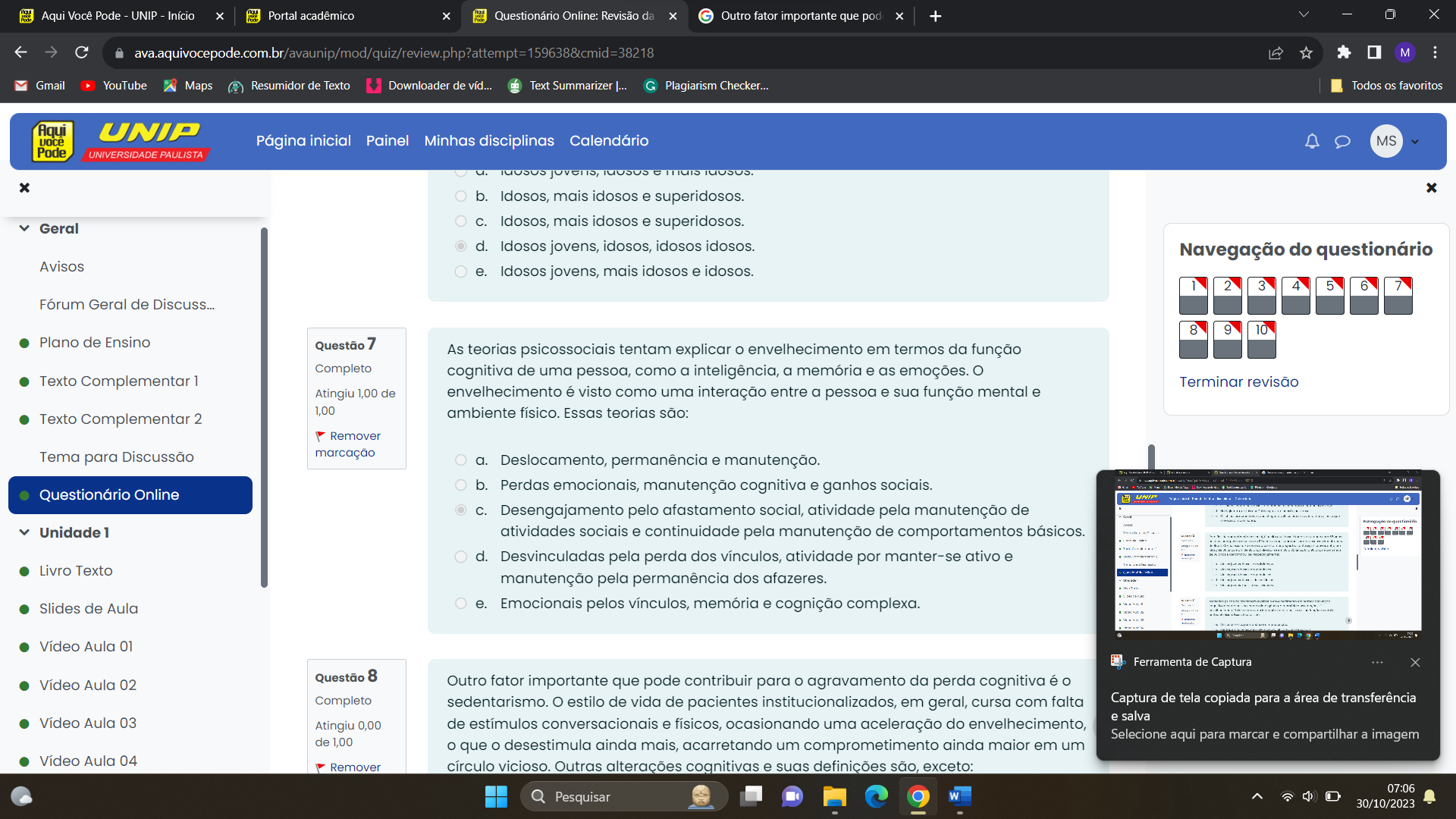 <p>Aqui Você Pode - UNIP Início Portal acadêmico Questionário Online: Revisão da Outro fator importante que pod x + X M Gmail YouTube Maps Resumidor de Texto Downloader de Text Summarizer Plagiarism Checker... Todos os favoritos Aqui UNIP Página inicial Painel Minhas disciplinas Calendário MS Pode UNIVERSIDADE PAULISTA b. Idosos, mais idosos e superidosos. Geral C. Idosos, mais idosos e superidosos. d. Idosos jovens, idosos, idosos idosos. Navegação do questionário Avisos e. Idosos jovens, mais idosos e idosos. 1 2 3 4 5 6 7 Fórum Geral de Discuss... 8 9 10 Plano de Ensino Questão 7 As teorias psicossociais tentam explicar o envelhecimento em termos da função Completo cognitiva de uma pessoa, como a inteligência, a memória e as emoções. Texto Complementar 1 Terminar revisão Atingiu 1,00 de envelhecimento é visto como uma interação entre a pessoa e sua função mental e 1,00 ambiente físico. Essas teorias são: Texto Complementar 2 Remover Tema para Discussão marcação a. Deslocamento, permanência e manutenção. b. Perdas emocionais, manutenção cognitiva e ganhos sociais. Questionário Online C. Desengajamento pelo afastamento social, atividade pela manutenção de Unidade 1 atividades sociais e continuidade pela manutenção de comportamentos básicos. d. Desvinculadas pela perda dos vínculos, atividade por manter-se ativo e Livro Texto manutenção pela permanência dos afazeres. Slides de Aula e. Emocionais pelos vínculos, memória e cognição complexa. Vídeo Aula 01 Ferramenta de Captura Questão 8 Vídeo Aula 02 Outro fator importante que pode contribuir para o agravamento da perda cognitiva é o Completo sedentarismo. estilo de vida de pacientes institucionalizados, em geral, cursa com falta Captura de tela copiada para a área de transferência e salva Vídeo Aula 03 Atingiu 0,00 de estímulos conversacionais e físicos, ocasionando uma aceleração do envelhecimento, Selecione aqui para marcar e compartilhar a imagem de 1,00 o que o desestimula mais, acarretando um comprometimento ainda maior em um Vídeo Aula 04 Remover círculo vicioso. Outras alterações cognitivas e suas definições são, exceto: 07:06 Q Pesquisar 30/10/2023</p>