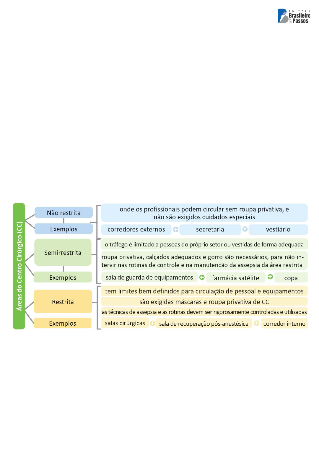 <p>www.romulopassos.com.br</p><p>MENTORIA FGV</p><p>1</p><p>PROFESSOR IVO SALES</p><p>Enfermagem Cirúrgica</p><p>1. (Prefeitura de Manaus-AM/FGV/2022) O local de transferência de maca para o centro cirúrgico</p><p>é considerado uma área</p><p>a) crítica.</p><p>b) semicrítica.</p><p>c) restrita.</p><p>d) irrestrita.</p><p>e) limitada.</p><p>Simulado FGV/Enare</p><p>Enfermagem Cirúrgica</p><p>e Clínica Médica</p><p>Quarta-feira, às 20h</p><p>www.romulopassos.com.br</p><p>MENTORIA FGV</p><p>2</p><p>2. (SES-MT/FGV/2024) Assinale a opção que indica um equipamento fixo que compõe a sala de</p><p>cirurgia.</p><p>a) Bisturi elétrico.</p><p>b) Foco central.</p><p>c) Mesa cirúrgica.</p><p>d) Aparelho de anestesia.</p><p>Mesa cirúrgica (DELEVEDOVE, 2022)</p><p>3. (FUNSAÚDE/FGV/2021) Na montagem de uma mesa cirúrgica básica com quatro quadrantes, o</p><p>primeiro e o segundo quadrante devem conter, respectivamente, instrumentos e materiais para</p><p>a) diérese e exérese.</p><p>b) hemostasia e síntese.</p><p>c) exérese e preensão.</p><p>d) síntese e exérese.</p><p>e) diérese e hemostasia.</p><p>4. (FUNSAÚDE/FGV/2021) Assinale a opção que indica o instrumento cirúrgico usado para</p><p>hemostasia.</p><p>a) Pinça Allis.</p><p>b) Cabo de bisturi.</p><p>c) Pinça dente de rato.</p><p>d) Tesoura de Mayo .</p><p>e) Pinça Kelly reta.</p><p>www.romulopassos.com.br</p><p>MENTORIA FGV</p><p>3</p><p>5. (Câmara Municipal de Aracajú/SE/FGV/2021) Após uma consulta, o paciente foi informado</p><p>pelo médico que, diante da evolução da doença e do resultado dos exames, seria necessário</p><p>realizar uma cirurgia para a correção do problema.</p><p>Nesse momento, iniciou-se o período:</p><p>a) perioperatório.</p><p>b) Intraoperatório.</p><p>c) transoperatório.</p><p>d) pré-operatório imediato.</p><p>e) pré-operatório mediato.</p><p>6. (PM-AM/FGV/2022) de enfermagem perioperatória, avalie se a(o) enfermeira(o) que atua na</p><p>área cirúrgica deve:</p><p>I. calcular os efeitos do ganho ou perda excessiva de líquidos como parte do monitoramento</p><p>fisiológico na fase intraoperatória;</p><p>II. avaliar o nível de dor do paciente e administrar as medidas para aliviá-la na fase pós-operatória;</p><p>III. avaliar o risco de complicações pós-operatórias, na fase pré-operatória.</p><p>Está correto o que se afirma em:</p><p>a) I e II, apenas.</p><p>b) I e III, apenas.</p><p>c) II e III, apenas.</p><p>d) II, apenas.</p><p>e) I, II e III.</p><p>www.romulopassos.com.br</p><p>MENTORIA FGV</p><p>4</p><p>7. (SESAB/AOCP/2020) Analise as assertivas e assinale a alternativa que aponta as corretas</p><p>referente às medidas de prevenção de infecção cirúrgica.</p><p>I. É necessário administrar rotineiramente profilaxia antimicrobiana com vancomicina, no máximo,</p><p>60 minutos antes da incisão cirúrgica.</p><p>II. É necessário, para cirurgia eletiva de pequeno e médio porte, utilizar antisséptico Clorexidina 2%</p><p>no banho (corpo total) imediatamente antes do encaminhamento ao centro cirúrgico</p><p>III. A tricotomia pré-operatória não deve ser feita de rotina. Se os pelos tiverem que ser removidos,</p><p>deve-se fazê-lo imediatamente antes da cirurgia, utilizando tricotomizadores elétricos e fora da</p><p>sala de cirurgia.</p><p>IV. É necessário enfatizar a importância da higiene oral. Nos casos em que houver previsão de</p><p>entubação orotraqueal, fazer higiene oral com clorexidina 0,12%.</p><p>a) Apenas II, III e IV.</p><p>b) Apenas I e III.</p><p>c) Apenas III e IV.</p><p>d) Apenas I e II.</p><p>e) I, II, III e IV.</p><p>Tempos cirúrgicos</p><p>www.romulopassos.com.br</p><p>MENTORIA FGV</p><p>5</p><p>Bisturi elétrico: é utilizado para</p><p>complementar e/ou substituir o uso</p><p>dos bisturis convencionais durante</p><p>os procedimentos cirúrgicos, com o</p><p>objetivo de realizar coagulação</p><p>(oclusão dos vasos sanguíneos),</p><p>dissecção (secção ou corte dos</p><p>tecidos) e fulguração (coagulação</p><p>superficial) dos tecidos de maneira</p><p>hemostática, rápida e segura.</p><p>Pinça de preensão Allis: é uma pinça de apreensão traumática, cuja porção preensora tem hastes</p><p>que não se tocam, com exceção das extremidades, curvadas uma em direção à outra. Seus</p><p>múltiplos dentículos nas pontas têm poder de preensão por denteamento fino nas superfícies de</p><p>contato (SOUZA; COUTINHO, 2014).</p><p>Pinça de Kelly: semelhante à pinça de Crile, reta ou curva, apresenta ranhuras transversais em 2/3</p><p>da garra, com 14 a 16 cm de comprimento. Tem pontas menores, é utilizada para pinçar vasos e</p><p>fios grossos e empregada em cirurgias infantis, na face, no pescoço ou no abdome (SOUZA;</p><p>COUTINHO, 2014).</p><p>www.romulopassos.com.br</p><p>MENTORIA FGV</p><p>6</p><p>Pinça anatômica: é uma pinça preensora, em cujas pontas há marcações estriadas. Também é</p><p>chamada de pinça de dissecção. Está disponível em vários tamanhos (10 a 30 cm de</p><p>comprimento) e é utilizada para dissecar e manipular tecidos delicados, como: vasos, nervos e</p><p>parede visceral (SOUZA; COUTINHO, 2014).</p><p>Pinça com dente de rato: semelhante à pinça de dissecção, essa pinça apresenta dentes em sua</p><p>extremidade. É utilizada na preensão de tecidos mais grosseiros, como plano muscular e</p><p>aponeurose (MARQUES, 2005; SOUZA; COUTINHO, 2014).</p><p>Pinça Foerster: pinças retas ou curvas, com 18 a 25 cm de comprimento, longas, usadas como</p><p>transportadoras de gazes para curativos em profundidade e para preensão de vísceras ocas</p><p>(MARQUES, 2005; SOUZA; COUTINHO, 2014).</p><p>www.romulopassos.com.br</p><p>MENTORIA FGV</p><p>7</p><p>8. (Prefeitura de Costa Marques-RO/IBADE/2022) O instrumentador, geralmente um Técnico de</p><p>Enfermagem especialmente treinado ou um técnico em instrumentação cirúrgica, depois da</p><p>escovação e paramentação 