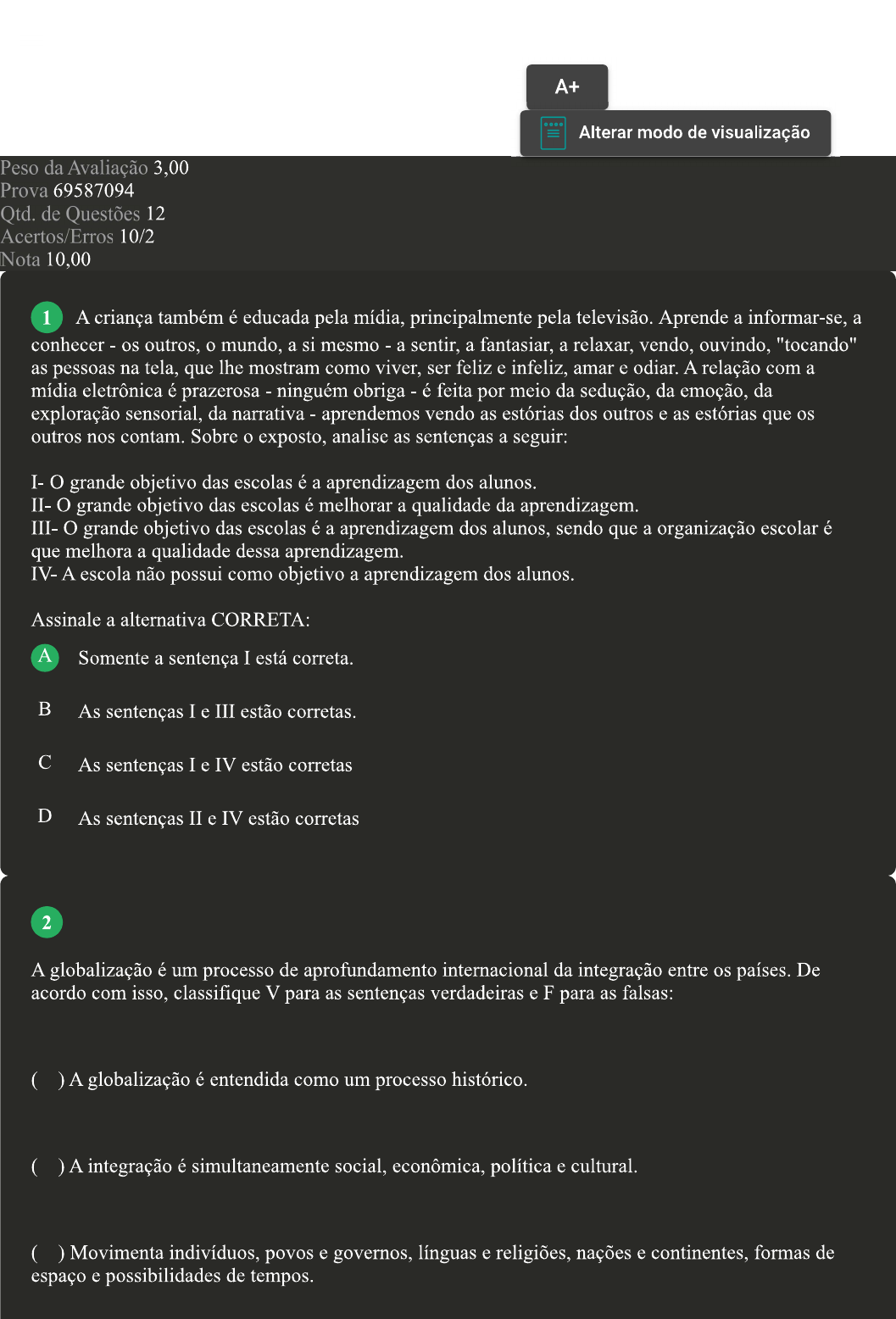 <p>A+ Alterar modo de visualização Peso da Avaliação 3,00 Prova 69587094 Qtd. de Questões 12 Acertos/Erros 10/2 Nota 10,00 1 A criança também é educada pela mídia, principalmente pela televisão. Aprende a informar-se, a conhecer os outros, mundo, a si mesmo a sentir, a fantasiar, a relaxar, vendo, ouvindo, "tocando" as pessoas na tela, que lhe mostram como viver, ser feliz e infeliz, amar e odiar. A relação com a mídia eletrônica é prazerosa - ninguém obriga - é feita por meio da sedução, da emoção, da exploração sensorial, da narrativa aprendemos vendo as estórias dos outros e as estórias que os outros nos contam. Sobre exposto, analise as sentenças a seguir: I- O grande objetivo das escolas é a aprendizagem dos alunos. O grande objetivo das escolas é melhorar a qualidade da aprendizagem. O grande objetivo das escolas é a aprendizagem dos alunos, sendo que a organização escolar é que melhora a qualidade dessa aprendizagem. IV- A escola não possui como objetivo a aprendizagem dos alunos. Assinale a alternativa CORRETA: A Somente a sentença I está correta. B As sentenças I e III estão corretas. C As sentenças I e IV estão corretas D As sentenças II e IV estão corretas 2 A globalização é um processo de aprofundamento internacional da integração entre os países. De acordo com isso, classifique V para as sentenças verdadeiras e F para as falsas: ( ) A globalização é entendida como um processo histórico. ( ) A integração é simultaneamente social, econômica, política e cultural. ( ) Movimenta indivíduos, povos e governos, línguas e religiões, nações e continentes, formas de espaço e possibilidades de tempos.</p><p>Assinale a alternativa que apresenta a sequência CORRETA: A B C D 3 TICs e mídias eletrônicas são tecnologias emergentes na sociedade contemporânea, embora sejam duas realidades próximas, elas têm suas diferenças conceituais. É importante conhecer tais diferenças, pois é perceptível um movimento de rápidas transformações dos artefatos tecnológicos que envolvem a comunicação, a produção científica, a produção industrial, processo educativo e entretenimento. Com base no conceito de TICs e mídias eletrônicas, analise as seguintes afirmativas: I- As TICs são um grupo de meios de comunicação ou artefatos cujo objetivo principal é a transmissão de informação entre diferentes sistemas ou grupos, a exemplo da televisão, computador e internet. II- As TICs referem-se aos artefatos ou aparelhos que envolvem entretenimento. comunicação e aprendizado, em especial, destacando-se pela facilidade de transporte, como no caso dos celulares. III- As mídias eletrônicas referem-se às tecnologias da informação que se destacam pelo uso de telas digitais e de acesso ao contexto virtual. IV- O conceito de mídias eletrônicas está vinculado às tecnologias de comunicação eletrônica que unem aparelhos, aplicativos e redes de informação. Assinale a alternativa CORRETA: A As afirmativas I, II e III estão corretas. B As afirmativas I e III estão corretas. C As afirmativas I, II e IV estão corretas. D Somente a afirmativa IV está correta. Revisar Conteúdo do Livro 4 As discussões e as ações acerca da educação inclusiva no Brasil surgiram a partir do final da década de 1980 e início da década de 1990, com objetivo de unir ensino especial com regular. No entanto, sua difusão deu-se somente com a Conferência Mundial sobre Necessidades Educativas Especiais, em Salamanca, no ano de 1994, que propôs a garantia da inclusão, por meio do acesso de pessoas com necessidades educativas especiais, no ambiente escolar comum, atendendo à diversidade, seja ela racial, cultural ou de Sobre as políticas públicas no contexto da educação inclusiva no Brasil, classifique V para as sentenças verdadeiras e F para as falsas: ( Tratar a criança a partir dos princípios da inclusão não é um dever da escola, sim, do Estado</p><p>e das comunidades locais. ( ) Estabelecem mudanças para garantir a qualidade na educação respaldada nos Direitos Humanos, que defendem uma educação para todos. ( ) Visam à garantia de que toda criança tenha direito e acesso a uma educação individualizada, que atende a suas reais necessidades. ( ) Preocupam-se com desenvolvimento das crianças e jovens em idade escolar, respeitando os limites e as habilidades individuais dos educandos. Assinale a alternativa que apresenta a sequência CORRETA: A B F-F-V-V F-V-V-V D 5 A diversidade cultural traz uma série de conhecimentos agregados às diferentes tradições, costumes e compreensão de mundo de cada civilização. No entanto, traz também a desigualdade social, a intolerância com diferente e preconceito. Sobre preconceito, classifique V para as sentenças verdadeiras e F para as falsas: ( ) Preconceito é quando julgamos alguém pela aparência antes de conhecê-lo. ( O preconceito está arraigado num conjunto de opiniões preestabelecidas sobre outro, sem considerar suas qualidades. ( ) O preconceito é demonstrado muitas vezes pelo olhar, por exemplo, ao expressar a repulsa por alguém. ( ) Preconceito pode ser quando você percebe um idoso em pé e oferece seu lugar para ele sentar-se. Assinale a alternativa que apresenta a sequência CORRETA: A B C D V-F-V-V 6 O Projeto Político Pedagógico (PPP), dentro do ambiente escolar, deve se apresentar como um documento dinâmico e flexível às transformações nas tomadas de decisões. Contudo, exige grande reflexão de toda equipe educativa no enfrentamento das dificuldades e na construção da educação que se almeja. Sobre PPP, classifique V para as sentenças verdadeiras e F para as falsas: ( É um documento que expressa os objetivos, diretrizes e ações do processo educativo a ser desenvolvido na escola. ( É um documento que traz a síntese das demandas sociais e legais do sistema de ensino. É um documento que revela a cultura, os propósitos e as expectativas da co