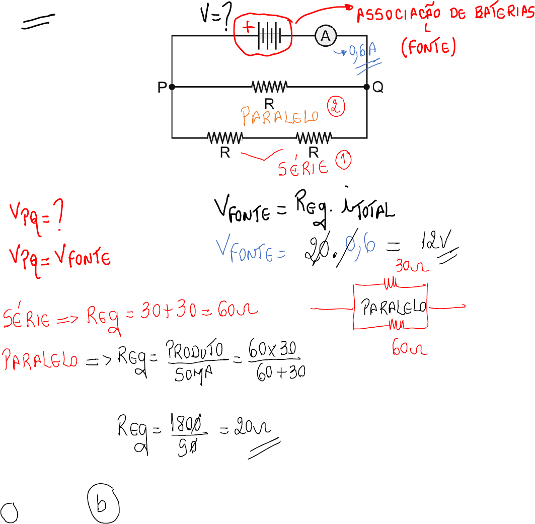 <p>EXTRA</p><p>No circuito esquematizado a seguir, a resistência de cada resistor é 𝑅 = 30Ω e a corrente elétrica indicada pelo amperímetro A é</p><p>de 0,60 A.</p><p>A diferença de potencial entre os pontos P e Q é:</p><p>a) 9,0 V</p><p>b) 12 V</p><p>c) 18 V</p><p>d) 36 V</p><p>e) 54 V</p>