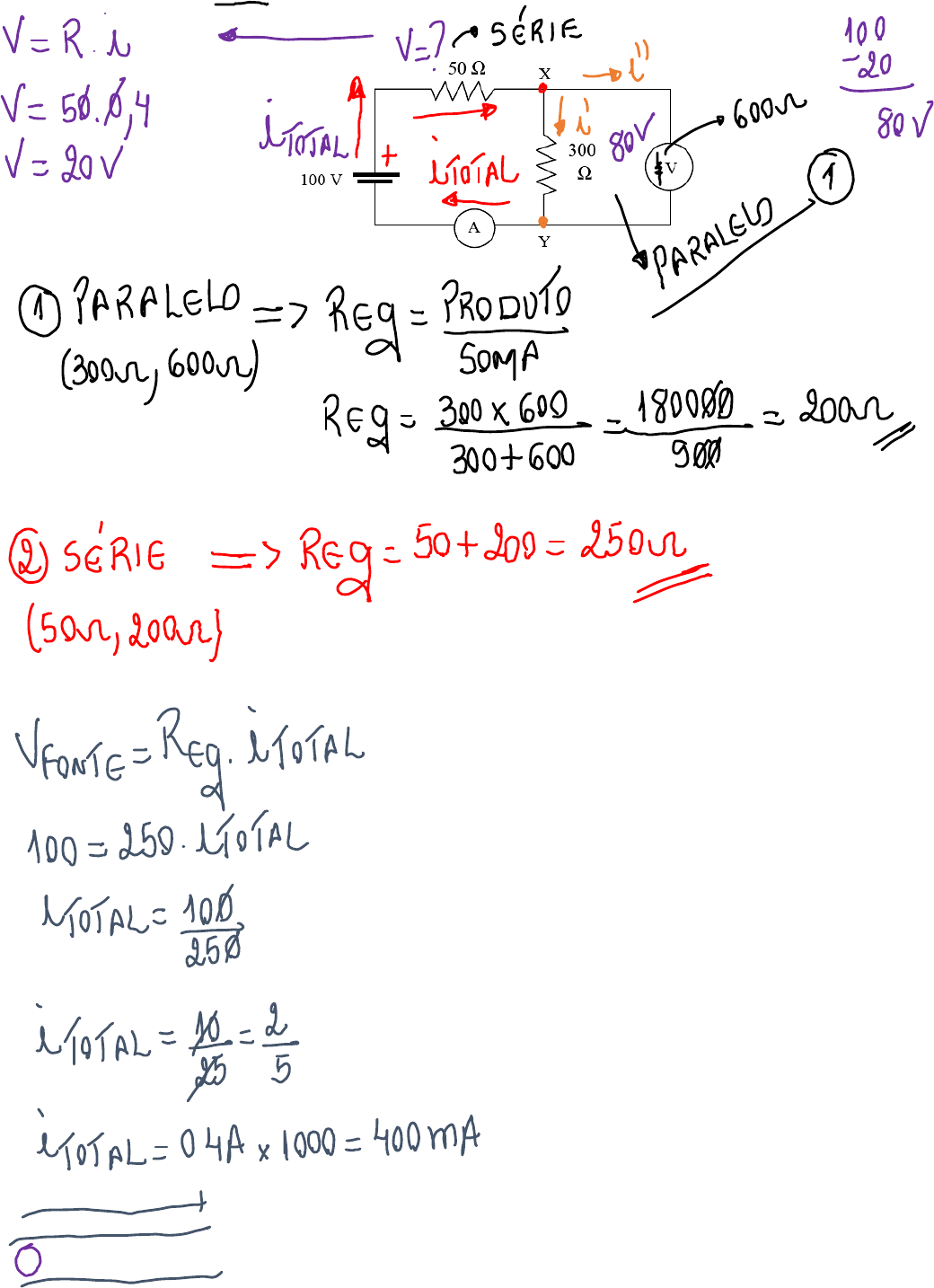 <p>EXTRA</p><p>No circuito abaixo, temos uma bateria e um amperímetro ideais, mas o voltímetro, conectado aos vértices X e Y do circuito, tem</p><p>uma resistência interna de 600 . As leituras do amperímetro e do voltímetro são, respectivamente,</p><p>a) i = 500 mA , V = 60 V.</p><p>b) i = 300 mA , V = 120 V.</p><p>c) i = 400 mA , V = 80 V.</p><p>d) i = 600 mA , V = 70 V.</p><p>e) i = 400 mA , V = 70 V.</p><p>Gab: C</p>