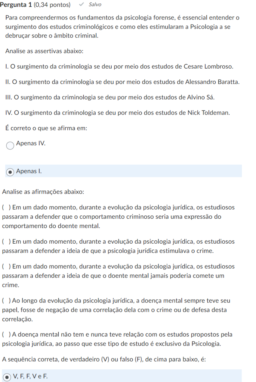 <p>Pergunta 1 (0,34 pontos) Salvo Para compreendermos os fundamentos da psicologia forense, é essencial entender o surgimento dos estudos criminológicos e como eles estimularam a Psicologia a se debruçar sobre o âmbito criminal. Analise as assertivas abaixo: I. surgimento da criminologia se deu por meio dos estudos de Cesare Lombroso. II. surgimento da criminologia se deu por meio dos estudos de Alessandro Baratta. III. surgimento da criminologia se deu por meio dos estudos de Alvino IV. surgimento da criminologia se deu por meio dos estudos de Nick Toldeman. É correto o que se afirma em: Apenas IV. Apenas I. Analise as afirmações abaixo: ( ) Em um dado momento, durante a evolução da psicologia jurídica, os estudiosos passaram a defender que o comportamento criminoso seria uma expressão do comportamento do doente mental. ( ) Em um dado momento, durante a evolução da psicologia jurídica, os estudiosos passaram a defender a ideia de que a psicologia jurídica estimulava o crime. ( ) Em um dado momento, durante a evolução da psicologia jurídica, os estudiosos passaram a defender a ideia de que o doente mental jamais poderia comete um crime. ( ) Ao longo da evolução da psicologia jurídica, a doença mental sempre teve seu papel, fosse de negação de uma correlação dela com o crime ou de defesa desta correlação. ( ) A doença mental não tem e nunca teve relação com os estudos propostos pela psicologia jurídica, ao passo que esse tipo de estudo é exclusivo da Psicologia. A sequência correta, de verdadeiro (V) ou falso (F), de cima para baixo, é: V, F, F, V e F.</p><p>A psicologia enquanto ciência deve ser considerada a partir do conjunto de diferentes linhas teóricas, que podem ter enfoque em diferentes conhecimentos, concebidos da própria psicologia ou de outras ciências. Considerando o trecho acima, avalie as asserções a seguir e a relação proposta entre elas. I. A psicodinâmica analisa a mente humana a partir dos conhecimentos das ciências biológicas; PORQUE II. a psicodinâmica estuda o conjunto de fatores de natureza mental e emocional que interagem entre si. A respeito dessas asserções, assinale a opção correta: As asserções e II são proposições falsas. As asserções e II são proposições verdadeiras, e a II é uma justificativa correta da I. A asserção é uma proposição falsa, e a é uma proposição verdadeira. Com base no trecho acima, analise as afirmativas que seguem com base na fase pré- científica: ( ) Os considerados "loucos" eram condenados e retirados das ruas e colocados em prisões como presos comuns. ( ) Os considerados "loucos" eram condenados e retirados das ruas e colocados nas Santas Casas de Misericórdia. ( ) A concepção de loucura depende das normas e dos costumes da sociedade vigente. ( ) Conceituar uma pessoa como "louca" era completamente proibida na fase pré- científica. ( ) A concepção de loucura surgiu antes da fase científica da psicologia. A sequência correta, de verdadeiro (V) ou falso (F), de cima para baixo, é: F, V, V, F, V.</p><p>A investigação de fatores biológicos não é a única forma de abordar a psicologia. Teóricos como Sigmund Freud se debruçaram sob outras formas, as quais merecem destaque nos estudos acerca do panorama geral da psicologia enquanto ciência. Com base no trecho acima, analise as afirmativas a seguir: I. A psicodinâmica leva em consideração a interação entre fatores de ordem emocional e mental. II. método freudiano de psicoterapia está ancorado na exploração do inconsciente. III. A psicanálise encontra terreno onde a consciência não impera no sujeito. IV. A psicodinâmica tem como maior expressão a abordagem cognitivo comportamental. É correto o que se afirma em: I, II e III. II III. II, III e IV. ( ) Exemplo da atuação interdisciplinar da psicologia forense e do serviço social é o trabalho destes campos de estudo em processos de adoção. ( ) Exemplo da atuação interdisciplinar da psicologia forense e do serviço social é o trabalho destes campos de estudo em processos de destituição do poder familiar. ( ) A atuação interdisciplinar da psicologia forense e do serviço social ocorre apenas nos casos criminais, pois os demais não demandam esses campos de conhecimento. ( ) A atuação interdisciplinar da psicologia forense e do serviço social se limita ao aconselhamento dos assessores dos magistrados. ( ) Exemplo da atuação interdisciplinar da psicologia forense e do serviço social é o trabalho destes campos de estudo em processos de alienação parental. A sequência correta, de Verdadeiro (V) ou Falso (F), de cima para baixo, é: V, V, F. F e F. F. V, F e V. V, F, F e V. F, F e V.</p><p>Pergunta 7 (0,34 pontos) Salvo Visando refletir sobre todas as possibilidades que emergem da união entre o Direito e a Psicologia, é importante saber que parte dos teóricos defendem a existência da psicologia jurídica em três dimensões, sendo elas: psicologia no real, psicologia em tese mítica e psicologia fática. psicologia da análise, psicologia da aplicação e psicologia da ponderação. psicologia no campo forense, psicologia na seara jurídica e psicologia judicante. a psicologia do direito, a psicologia no direito e a psicologia para o direito. psicologia da análise. psicologia da aplicação e psicologia da ilusão. A psicologia possui íntima relação com o Direito Penal, na medida em que é definitiva para, por exemplo, a definição de da punibilidade e da imposição de medidas restritivas que não são consideradas penas. As pessoas com patologias psíquicas: podem ser consideradas inimputáveis, não podendo existir a imposição de penas. serão penalizadas com as denominadas medidas de segurança. nunca poderão ser presas, desde que apresentem um laudo que atestem a patologia. são tratadas da mesma forma que o denominado "homem são totalmente desconsideradas para fins de penalização, não respondendo a processos.
