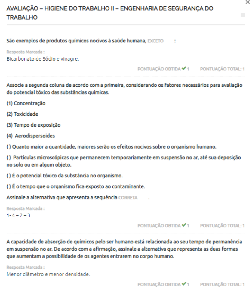 <p>AVALIAÇÃO - HIGIENE DO TRABALHO II - ENGENHARIA DE SEGURANÇA DO TRABALHO São exemplos de produtos químicos nocivos à saúde humana, EXCETO : Resposta Marcada : Bicarbonato de Sódio e vinagre PONTUAÇÃO OBTIDA 1 PONTUAÇÃO TOTAL: 1 Associe a segunda coluna de acordo com a primeira, considerando os fatores necessários para avaliação do potencial tóxico das substâncias químicas. (1) Concentração (2) Toxicidade (3) Tempo de exposição (4) Aerodispersoides () Quanto maior a quantidade, maiores serão os efeitos nocivos sobre o organismo humano. () Partículas microscópicas que permanecem temporariamente em suspensão no ar, até sua deposição no solo ou em algum objeto. () É o potencial tóxico da substância no organismo. () É o tempo que o organismo fica exposto ao contaminante. Assinale a alternativa que apresenta a sequência CORRETA Resposta Marcada : 1-4-2-3 PONTUAÇÃO OBTIDA 1 PONTUAÇÃO TOTAL: 1 A capacidade de absorção de químicos pelo ser humano está relacionada ao seu tempo de permanência em suspensão no ar. De acordo com a afirmação, assinale a alternativa que representa as duas formas que aumentam a possibilidade de os agentes entrarem no corpo Resposta Marcada : Menor diâmetro e menor densidade. PONTUAÇÃO OBTIDA PONTUAÇÃO TOTAL: 1</p><p>Analise as afirmações abaixo sobre os limites de tolerância da ACGIH, e assinale V para as Verdadeira e F para as Falsas. o recebimento de insalubridade garante a segurança ao trabalhador, que pode continua exposto a agentes nocivos à saúde. () Os trabalhadores expostos aos agentes ambientais devem ser monitorados por avaliação clínica, abrangendo anamnese ocupacional e exame físico mental e exames complementares, realizados de acordo com os termos específicos da NR-7 - Programa de Controle Médico de Saúde Ocupacional (PCMSO). () As estratégias de amostragem correspondem ao processo de se obter uma amostra do em um período de tempo específico para fins de determinação da concentração do agente químico. () Sempre é possível substituir determinado produto químico nocivo por outro menos poluente e, dessa forma, é descartável o uso de EPIs adequados, não cabendo ao profissional de SST propor medidas de controle, com a finalidade de reduzir a exposição aos agentes nocivos. Assinale a sequência CORRETA : Resposta Marcada : F-V-V-F PONTUAÇÃO OBTIDA 1 PONTUAÇÃO TOTAL: 1 A resposta a um agente tóxico depende de fatores do hospedeiro e consequentemente da dose, o caminho da exposição à doença subclínica ou efeito adverso à saúde sugere que existem fatores modificadores importante. De acordo com a afirmativa acima, assinale a alternativa INCORRETA : Resposta Marcada : Estado mental PONTUAÇÃO OBTIDA 1 PONTUAÇÃO TOTAL: 1 Na avaliação da exposição à saúde ocupacional, os dois tipos de monitoramento, ambiental e biológico, têm seu lugar. Sobre o monitoramento ambiental, assinale a alternativa CORRETA : Resposta Marcada Amostragem integrada: com base na coleta (e de amostras ao longo de um período de tempo para obter a exposição média no período de amostragem operação, turno inteiro. PONTUAÇÃO OBTIDA 1 PONTUAÇÃO TOTAL: 1 Na escolha do ventilador mais adequado ao projeto, devem ser considerados alguns fatores. Com base na afirmação anterior assinale a alternativa CORRETA : Resposta Marcada Tipo de poluente, localização, eficiência. PONTUAÇÃO OBTIDA 1 PONTUAÇÃO TOTAL: 1</p><p>Leia o texto abaixo: um dos princípios básicos da sustentabilidade das edificações de forma geral. Além de proporcionar o controle térmico do ambiente, ela possibilita a troca constante de ar, gerando espaços com mais conforto, salubridade e qualidade. Outra vantagem dessa estratégia é diminuir a necessidade de ventilações mecânicas ou o uso de De acordo com o que foi lido, podemos dizer que o texto faz referência ao sistema de Resposta Marcada Ventilação natural. PONTUAÇÃO OBTIDA 1 PONTUAÇÃO TOTAL: 1 Analise as afirmações abaixo em relação ao tempo de exposição, considerando que existem três tipos de LTs também denominados TLVs (threshold limit values). Tempo de valor limiar-média ponderada de tempo (TLV-TWA) ou média ponderada no tempo: é a concentração máxima do agente químico que deve ser respeitada nas jornadas de trabalho (9 horas diárias e 40 horas semanais), e geralmente se modifica em função de inúmeras variáveis dos ciclos produtivos e emocionais. II- Valor limiar-limite de exposição a curto prazo (TLV-STEL) ou limites de exposição para curto prazo: o limite de exposição média ponderada de 15 minutos; não deve ser ultrapassado em momento algum da jornada e é suplementar ao TLV-TWA. III- Valor limiar-teto (TLV-C): é a concentração máxima que não deve ser excedida em qualquer momento da exposição no trabalho. A maioria dos LEOs é atualizada periodicamente, por isso deve-se procurar sempre as referências mais recentes em sua consulta. De acordo com a leitura das afirmações, podemos considerar que: Resposta Marcada e III estão corretas. PONTUAÇÃO OBTIDA PONTUAÇÃO TOTAL 1 Texto 1- "[...] através dos recintos é incrementada com o uso de grandes aberturas nos lados de pressão e sucção dos ventos (esfriamento). A taxa na qual o an flui através de um cômodo, retirando o calor consigo, é uma função da área das entradas e saídas de ar, da velocidade do vento e da direção do vento em relação às aberturas. A quantidade de calor removido por determinada taxa de fluxo de ar depende da diferença de temperatura entre o interior e o exterior da Texto 2- "[...] conforme o ar circula dentro do ambiente, surgem zonas de alta pressão, no lado que recebe os ventos, e zonas de sucção, no lado que o vento sai. Sendo que para que a ventilação cruzada seja eficaz, é importante que as entradas e saídas de ar estejam localizadas em lados opostos do ambiente." Sobre os textos acima, é CORRETO afirmar que: Respo