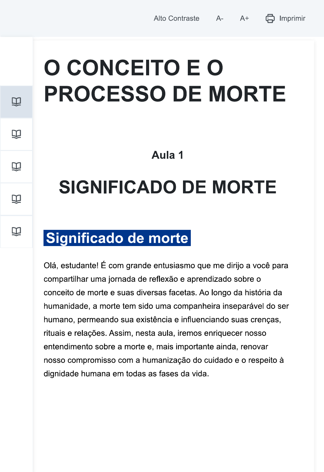 <p>Alto Contraste A- A+ Imprimir CONCEITO E PROCESSO DE MORTE Aula 1 SIGNIFICADO DE MORTE Significado de morte Olá, estudante! É com grande entusiasmo que me dirijo a você para compartilhar uma jornada de reflexão e aprendizado sobre o conceito de morte e suas diversas facetas. Ao longo da história da humanidade, a morte tem sido uma companheira inseparável do ser humano, permeando sua existência e influenciando suas crenças, rituais e relações. Assim, nesta aula, iremos enriquecer nosso entendimento sobre a morte e, mais importante ainda, renovar nosso compromisso com a humanização do cuidado e o respeito à dignidade humana em todas as fases da vida.</p><p>Ponto de Partida A presente disciplina pretende abordar uma discussão teórica que lhe possibilite uma compreensão sobre o conceito e o processo de morte. Nesta aula, você estudará o processo de morte, bem como o papel dos profissionais de saúde frente às condições do paciente. Além disso, conhecerá o conceito de morte proposto por Morin (1979) a partir da concepção bioantropológica. Conhecerá ainda o cotidiano de trabalho dos profissionais de saúde e seus posicionamentos frente à vida, ao adoecer e à morte. processo do adoecimento traz estigmas sociais, sofrimento e uma fantasia sempre marcante que norteia o risco de vida ou, em alguns casos mais graves, desvela a realidade da morte, nossa condição de transitoriedade. Para tanto, vamos nos embasar na seguinte situação problema que nos norteará no entendimento dos conceitos que serão apresentados aqui. No ambiente hospitalar, a morte é uma realidade inescapável. Profissionais de saúde enfrentam diariamente o desafio de lidar com a finitude da vida e a complexidade das emoções que permeiam esse processo. Vamos, então, analisar a experiência de uma equipe</p><p>Vamos nos referir ao Hospital Metropolitano São Lucas, uma instituição renomada que atende uma ampla variedade de pacientes em diferentes estágios de doenças graves. A equipe de saúde é composta por médicos, enfermeiros, psicólogos, assistentes sociais, fisioterapeutas, técnicos e pessoal de apoio. A equipe de saúde do Hospital São Lucas está enfrentando dificuldades significativas ao lidar com a morte de pacientes, isso porque a cultura institucional e os tabus sociais em torno da morte contribuem para a falta de comunicação eficaz com pacientes e familiares, bem como para a necessidade de desenvolver estratégias para lidar com o luto e a perda de forma saudável. Maria, uma enfermeira dedicada que trabalha na ala de cuidados intensivos do hospital, enfrenta diariamente a angústia de testemunhar a deterioração da saúde de pacientes críticos e as inevitáveis perdas. Recentemente, ela foi confrontada com a morte de um paciente jovem que deixou para trás uma esposa grávida e uma família em luto. Maria sente-se despreparada para lidar com a intensidade das emoções que surgem em situações como essa. A partir desse contexto, reflita: Quais são os principais desafios enfrentados pela equipe de saúde ao lidar com a morte no ambiente hospitalar? Como as crenças culturais e os tabus sociais podem influenciar a comunicação sobre a morte entre profissionais de saúde, pacientes e familiares? Quais estratégias podem ser implementadas para ajudar os profissionais de saúde a lidar com o luto e a perda de forma saudável e eficaz? E aí, vamos juntos conhecer essa realidade?</p><p>O conceito de morte O homem, ao longo da história, não pode se dissociar da ideia de morte, uma vez que ela faz parte de sua realidade, de sua condição enquanto ser vivo. Partindo dessa perspectiva, Edgar Morin, em 1948, realizou um estudo amplo sobre o assunto. Entre os diversos livros que escreveu, pode-se destacar O homem e a morte (1948- 1950), seu segundo livro publicado, no qual propõe uma ampla discussão sobre a concepção de morte para os indivíduos, suas reações e os ritos simbólicos envolvidos. Os rituais relacionados à morte estão presentes em praticamente todas as culturas. O autor, por meio de suas pesquisas, aponta para dois tipos de olhares biológico e antropológico - que se pode ter sobre o homem e como ele encara a morte. Segundo Souza (2003), o livro de Morin traz conceitos próprios, como o estudo de caráter antropobiológico, o duplo morte-renascimento, além da questão sobre os ritos funerários. Para a autora, Morin afirma que as sepulturas são como dados fundamentais da morte humana. Morin (1979), na introdução da segunda edição de O enigma do homem, afirmou que, em O homem e a morte, procurou estabelecer o ponto de união e ruptura entre o homem enquanto espécie (biologia) e a ciência do homem (antropologia). Além disso, criticou algumas afirmações que fez antes da revolução genética, concluindo que o homem não pode ser considerado uma entidade fechada, alheia à natureza. Morin (1979) define a antropocosmologia como a forma de estudar o que significa o homem no mundo. Nesse intercâmbio entre as ciências biológicas e humanas, o homem não pode ser considerado uma matéria viva, mas sistemas vivos, ou seja, o homem, enquanto espécie, é pensado aqui como uma organização específica da matéria físico-química.</p><p>sobrevivem tentam se adaptar à perda de alguém (Morin, 1977 apud Souza, 2003). Pensando na morte como um processo ao qual os sobreviventes têm de se adaptar, vale a pena destacar a definição de luto de Freud (1996), semelhante à concepção de Morin. Para o psicanalista, o luto é um processo de trabalho interno, inconsciente, em que o indivíduo, após a perda de um objeto investido de afeto (pessoa da família, por exemplo), retira as "catexias libidinais" desse objeto perdido para o ego (eu), temporariamente, enquanto o processo do luto acontece. Ele afirma que esse trabalho do luto é a via normal da perda para o sujeito. Na vertente antropológica dos estudos de Morin (1948 apud Souza, 2003) sobre o ser huma