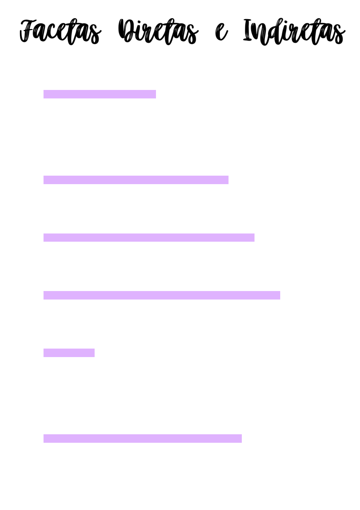 <p>* Indicadas quando se deseja alterar cor e/ou forma dos dentes sem envolver</p><p>demais as faces dos dentes.</p><p>CLASSIFICAÇÃO DAS FACETAS</p><p>● Diretas - Em resina composta</p><p>● Indiretas - Lentes</p><p>Como selecionar ?</p><p>- Avaliar: grau de escurecimento, custo, habilidade profissional, grau de</p><p>exigência e durabilidade</p><p>CLASSIFICAÇÃO QUANTO À EXTENSÃO DA FACETA</p><p>● Parcial</p><p>● Total</p><p>● Total com recobrimento incisal</p><p>CLASSIFICAÇÃO QUANTO A PROFUNDIDADE DO PREPARO</p><p>● Sem desgaste dental</p><p>● Desgaste em esmalte</p><p>● Desgaste em esmalte e dentina</p><p>CLASSIFICAÇÃO QUANTO A COR DO DENTE A SER RESTAURADO.</p><p>● Sem alteração</p><p>● Moderada alteração</p><p>● Acentuada alteração</p><p>DIAGNÓSTICO</p><p>➢ Expectativa do paciente quanto ao resultado e longevidade</p><p>➢ Hábitos nocivos</p><p>➢ Higiene e saúde periodontal</p><p>➢ Oclusão</p><p>➢ Condição do dente</p><p>➢ Morfologia gengival</p><p>FATORES QUANTO A INDICAÇÃO E CONTRAINDICAÇÃO</p><p>➢ Quantidade e condição estrutural do remanescente</p><p>➢ Grau de escurecimento</p><p>➢ Relação entre a extensão afetada e distâncias biológicas</p><p>➢ Oclusão</p><p>➢ Grau de higienização do paciente</p><p>INDICAÇÕES</p><p>➢ Alteração de cor</p><p>➢ Pequena giroversão ou alteração de posicionamento</p><p>➢ Tratados endodonticamente e com alteração de cor</p><p>➢ Fratura simples</p><p>➢ Vitais com moderada alteração de cor</p><p>➢ Amplas lesões de cárie envolvendo a face vestibular</p><p>➢ Amplas Lesões cervicais</p><p>➢ Conoides</p><p>➢ Hipoplásicos</p><p>➢ Alteração de cor e/ou morfologia superficial por fluorose</p><p>➢ Necessitam de transformação de forma</p><p>➢ Defeitos localizados ou descoloração intrínseca</p><p>➢ Fechar diastemas</p><p>LIMITAÇÃO E / OU CONTRAINDICAÇÕES</p><p>➢ Dentes muito escuros</p><p>➢ Hábitos parafuncionais</p><p>➢ Fumantes e com ingestão frequente de corantes</p><p>➢ Grande giroversão ou apinhamento</p><p>VANTAGENS DA TÉCNICA DIRETA DE RESINA COMPOSTA</p><p>➢ Pouco ou nenhum desgaste dental</p><p>➢ Ótimo resultado estético</p><p>➢ Menos tempo de execução comparado a técnica indireta</p><p>➢ Não precisa de provisório</p><p>➢ Não precisa de moldagem</p><p>➢ Mais barato</p><p>➢ Fácil de reparar</p><p>FACETAS DIRETAS x INDIRETAS</p><p>● Diretas</p><p>➔ Conserva a estrutura dental</p><p>➔ Resultado imediato</p><p>➔ Única sessão</p><p>➔ Fácil de reparação, cor e forma</p><p>➔ Mais barata</p><p>➔ Técnica simples mas precisa de treinamento</p><p>● Indiretas</p><p>➔ Maior resistência à fratura</p><p>➔ Maior estabilidade de cor</p><p>➔ Maior resistência ao desgaste</p><p>➔ Maior resistência ao manchamento</p><p>ASPECTOS A SEREM AVALIADOS</p><p>● Biológicos</p><p>➔ Preservação da vitalidade pulpar.</p><p>➔ Boa adaptação.</p><p>➔ Selamento das restaurações.</p><p>➔ Compatibilidade periodontal.</p><p>● Morfológicos</p><p>➔ Tamanho e forma das restaurações.</p><p>➔ Oclusão.</p><p>➔ Equilíbrio estético com os demais dentes.</p><p>● Estéticos</p><p>➔ Cor.</p><p>➔ Opacidade.</p><p>➔ Textura superficial.</p><p>➔ Integração com gengiva, lábios, sorriso e face.</p><p>FATORES QUE INFLUENCIAM O PREPARO</p><p>➢ Grau de escurecimento</p><p>➢ Presença de diastemas</p><p>➢ Existência de apinhamento</p><p>➢ Altura da linha do sorriso</p><p>➢ Inclinação do dente no arco</p><p>➢ Necessidade de alongamento do dente</p><p>TÉCNICAS RESTAURADORAS</p><p>BROCAS</p><p>● Esférica 1011/1012</p><p>● Tronco cônica diamantada 4138/anelada</p><p>● Acabamento série dourada, prata e multilaminadas.</p><p>TÉCNICA</p><p>1. Seleção da cor da resina.</p><p>2. Proteção dos dentes vizinhos com matriz.</p><p>3. Colocação do fio retrator.</p><p>4. Marcação na borda cervical com um lápis, delimitando a área a ser</p><p>desgastada.</p><p>5. Com uma broca esférica faz o desgaste desta marcação (canaleta cervical)</p><p>da metade da face mesial até metade da face distal. (a canaleta é do</p><p>tamanho do diâmetro da broca).</p><p>6. Selecionar técnica:</p><p>➔ Técnica da canaleta = Broca anelada faz as canaletas na horizontal.</p><p>➔ Técnica da silhueta = Broca troncocônica faz as canaletas verticais</p><p>nas marcações dos lóbulos.</p><p>7. União das canaletas com a broca troncocônica (independente da técnica);.</p><p>8. Restaurar respeitando o ângulo do dente.</p><p>Técnica da canaleta</p><p>Técnica da silhueta</p><p>ACABAMENTO E POLIMENTO</p><p>● Acabamento inicial (matriz nesse passo)</p><p>- Lâmina 12 de bisturi.</p><p>- Tiras de aço abrasivas.</p><p>- Brocas diamantadas de granulação F (fina) e FF (ultrafina).</p><p>- Brocas multilaminadas</p><p>● Acabamento intermediário</p><p>- Discos soflex (- abrasivo para o + e da cor + escura para a + clara)</p><p>seguindo o ângulo do dente.</p><p>● Acabamento final</p><p>- Pontas de silicone abrasivas</p><p>- Discos jiffy</p><p>- Pasta de polimento com discos de feltro</p><p>CLASSIFICAÇÃO QUANTO A CONDIÇÃO DO DENTE</p><p>● Dentes vitais</p><p>● Dentes não vitais</p><p>CLASSIFICAÇÃO QUANTO À TÉCNICA</p><p>● Clareamento caseiro com moldeira individual</p><p>➢ Moldeira confeccionada pelo dentista, e o paciente realiza a aplicação do</p><p>agente clareador em casa.</p><p>➢ Peróxido de carbamida a 10% a 17%. (+usado)</p><p>➢ Mais usada em dentes vitais, mas pode ser indicada para dentes não vitais.</p><p>● Clareamento em consultório</p><p>➢ Peróxido de hidrogênio a 35%. (+usado)</p><p>➢ Mais tempo clínico.</p><p>➢ Mais cara.</p><p>➢ Indicada para um pequeno grupo de dentes ou quando o paciente deseja</p><p>reduzir o tempo de tratamento e não tem disciplina para utilizar as moldeiras</p><p>com o gel.</p><p>➢ Dentes vit