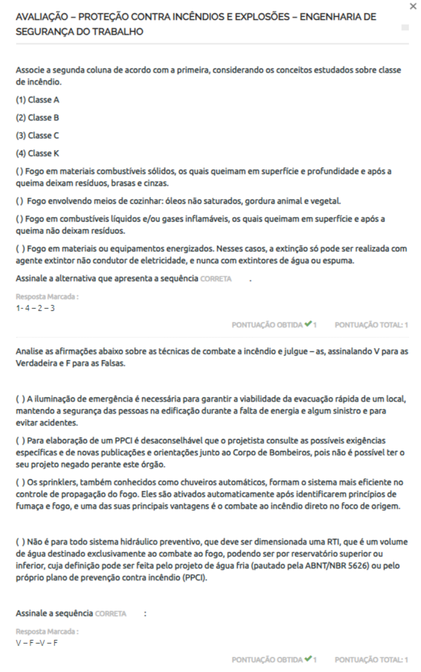 <p>AVALIAÇÃO PROTEÇÃO CONTRA INCÊNDIOS E EXPLOSÕES ENGENHARIA DE SEGURANÇA DO TRABALHO Associe a segunda coluna de acordo com a primeira, considerando os conceitos estudados sobre classe de incêndio. (1) Classe A (2) Classe B (3) Classe C (4) Classe K () Fogo em materiais combustíveis sólidos, os quais queimam em superfície e profundidade e após a queima deixam brasas e () Fogo envolvendo meios de cozinhar: óleos não saturados, gordura animal e vegetal. () Fogo em combustíveis líquidos e/ou gases inflamáveis, os quais queimam em superfície e após a queima não deixam ( ) Fogo em materiais ou equipamentos energizados. Nesses casos, a extinção só pode ser realizada com agente extintor não condutor de eletricidade, e nunca com extintores de água ou espuma. Assinale a alternativa que apresenta a sequência CORRETA Resposta Marcada 1-4-2-3 PONTUAÇÃO OBTIDA 1 PONTUAÇÃO TOTAL: 1 Analise as afirmações abaixo sobre as técnicas de combate a incêndio e julgue as, assinalando para as Verdadeira e F para as ( ) A iluminação de emergência é necessária para garantir a viabilidade da evacuação rápida de um local, mantendo a segurança das pessoas na edificação durante a falta de energia e algum sinistro e para evitar acidentes. ( ) Para elaboração de um PPCI é desaconselhável que o projetista consulte as possíveis exigências específicas e de novas publicações e orientações junto ao Corpo de Bombeiros, pois não é possível ter o seu projeto negado perante este órgão. ( ) Os sprinklers, também conhecidos como chuveiros automáticos, formam o sistema mais eficiente no controle de propagação do fogo. Eles são ativados automaticamente após identificarem princípios de fumaça e fogo, e uma das suas principais vantagens é o combate ao incêndio direto no foco de origem. ( ) Não é para todo sistema hidráulico preventivo, que deve ser dimensionada uma RTI, que é um volume de água destinado exclusivamente ao combate ao fogo, podendo ser por reservatório superior ou inferior, cuja definição pode ser feita pelo projeto de água fria (pautado pela ABNT/NBR 5626) ou pelo próprio plano de prevenção contra incêndio (PPCI). Assinale a sequência CORRETA : V-F-V-F PONTUAÇÃO OBTIDA PONTUAÇÃO TOTAL: 1</p><p>É possível dizer que os três elementos essenciais para formação do fogo são: o calor, combustível e o oxigênio, sendo essa junção chamada de: Resposta Marcada Triângulo do fogo. PONTUAÇÃO OBTIDA 1 PONTUAÇÃO TOTAL: 1 São requisitos funcionais que devem ser previstos no projeto de segurança contra incêndios, EXCETO: Resposta Marcada NOTAS OBTIDAS PONTUAÇÃO TOTAL: 1 É um conjunto de projetos e ações que visam a proteger os ocupantes de espaços físicos contra possíveis sinistros gerados pelo fogo e com objetivo de adequar as instalações para seu correto uso; instalar equipamentos de segurança coletiva para tornar o ambiente o mais seguro possível; e facilitar a evacuação em caso de emergências. Este texto refere-se ao conceito de: Resposta Marcada Plano de Prevenção Contra PONTUAÇÃO OBTIDA 1 PONTUAÇÃO TOTAL: 1 Analise o texto a seguir: "[...] tem que ser instalado de forma para que todos os usuários cientes da sua localização; protegido contra intempéries e danos físicos em potencial; em lugar onde haja menor possibilidade de que o fogo bloqueie seu acesso; não ser instalado em escadas; de forma que sua remoção não seja impedida por suporte, base ou etc." Com base no material estudado, é possível dizer que esta indicação refere-se ao posicionamento de: Resposta Marcada PONTUAÇÃO OBTIDA 1 PONTUAÇÃO TOTAL: 1 Analise as atribuições do engenheiro de segurança do trabalho no combate a incêndio, consideradas abaixo: Especificar, controlar e fiscalizar sistemas de proteção coletiva e equipamentos de segurança, inclusive os de proteção individual e os de proteção contra incêndio, assegurando-se de sua qualidade e eficiência. II- Colaborar na fixação de requisitos de aptidão para o exercício de funções, apontando os riscos decorrentes desses exercícios. III- Informar aos trabalhadores e à comunidade, diretamente ou por meio de seus representantes, as condições que possam trazer danos a sua integridade e as medidas que eliminam ou atenuam estes riscos e que deverão ser tomadas. De acordo com a leitura das atribuições, podemos considerar que: Resposta Marcada e III estão corretas. PONTUAÇÃO OBTIDA 1 PONTUAÇÃO TOTAL: 1</p><p>Texto 1- interromper o vazamento é uma ação muito eficaz, mas nem sempre é possível ou fácil de ser executada, dependendo da origem do mesmo. o controle do vazamento poderá ser dado com o fechamento de válvulas, que deverá ser acompanhado pela interrupção segura das etapas anteriores do processo. Em outras situações onde há dificuldades na paralisação do processo, o fluxo deverá ser Texto As aberturas, saídas e vias de passagem devem ser claramente assinaladas por meio de placas ou sinais luminosos, indicando a direção da saída. Nenhuma saída de emergência deverá ser fechada à chave ou presa durante a jornada de trabalho. As saídas de emergência podem ser equipadas com dispositivos de travamento que permitam fácil abertura do interior do estabelecimento. Sobre os textos acima, é CORRETO afirmar que: Resposta Marcada : texto 1 e o texto 2 são verdadeiros, porém não estabelecem relações entre eles. PONTUAÇÃO OBTIDA 1 PONTUAÇÃO TOTAL: 1 Leia o texto abaixo: "[...]tem como objetivo estabelecer os requisitos mínimos para a gestão de segurança e saúde no trabalho contra os fatores de risco de acidentes provenientes das atividades de extração, produção, armazenamento, transferência, manuseio e manipulação de inflamáveis e líquidos combustíveis. De acordo com o que foi lido, podemos dizer que o texto faz referência: Resposta Marcada : Norma Regulamentadora 20. PONTUAÇÃO OBTIDA 1 PONTUAÇÃO TOTAL: 1 No qu