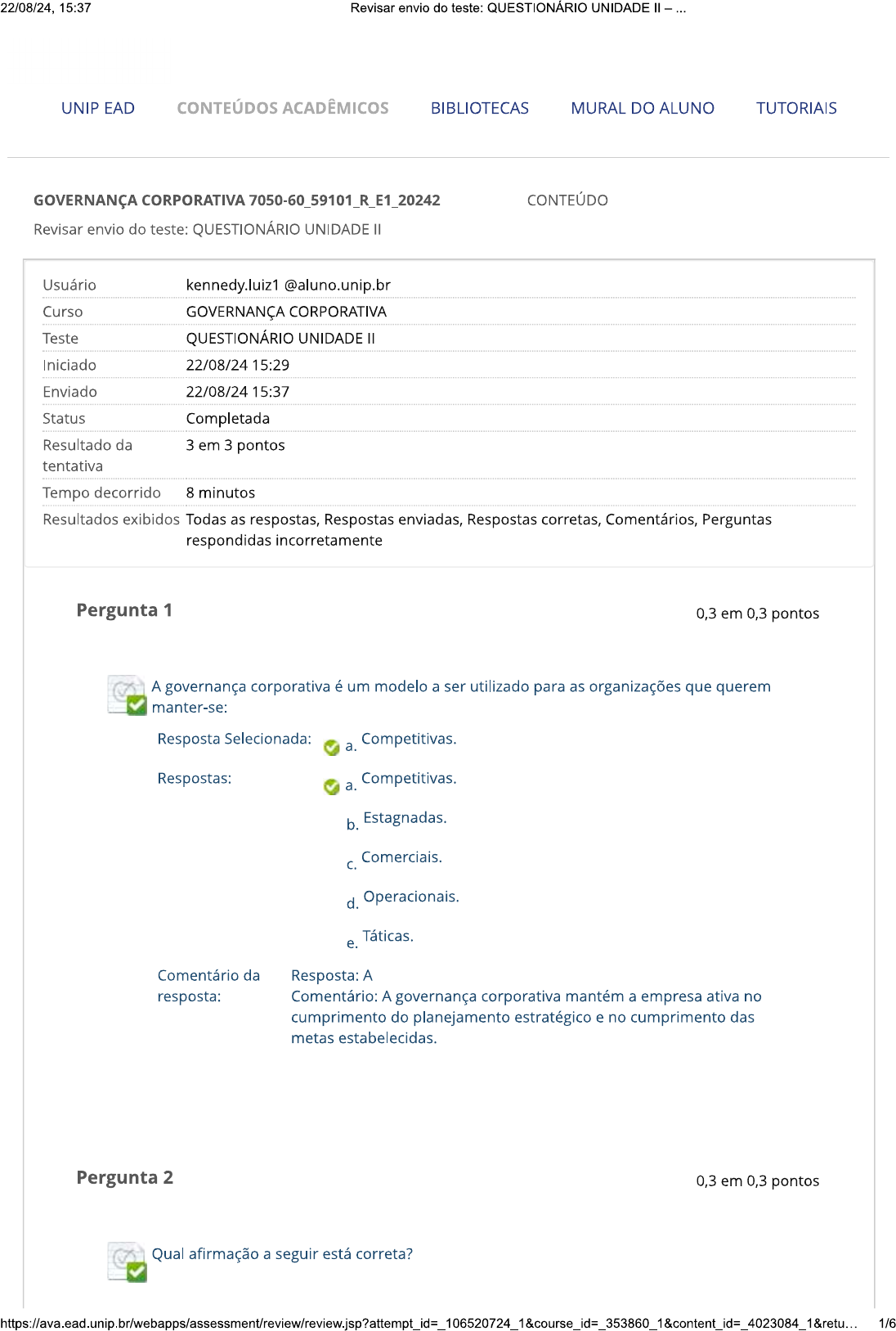 <p>22/08/24, 15:37 Revisar envio do teste: QUESTIONÁRIO UNIDADE - UNIP EAD CONTEÚDOS ACADÊMICOS BIBLIOTECAS MURAL DO ALUNO TUTORIAIS GOVERNANÇA CORPORATIVA 7050-60_59101_R_E1_20242 CONTEÚDO Revisar envio do teste: QUESTIONÁRIO UNIDADE II Usuário kennedy.luiz1 @aluno.unip.br Curso GOVERNANÇA CORPORATIVA Teste QUESTIONÁRIO UNIDADE Iniciado 22/08/24 15:29 Enviado 22/08/24 15:37 Status Completada Resultado da 3 em 3 pontos tentativa Tempo decorrido 8 minutos Resultados exibidos Todas as respostas, Respostas enviadas, Respostas corretas, Comentários, Perguntas respondidas incorretamente Pergunta 1 0,3 em 0,3 pontos A governança corporativa é um modelo a ser utilizado para as organizações que querem manter-se: Resposta Selecionada: a. Competitivas. Respostas: a. Competitivas. b. Estagnadas. C. Comerciais. d. Operacionais. e. Táticas. Comentário da Resposta: A resposta: Comentário: A governança corporativa mantém a empresa ativa no cumprimento do planejamento estratégico e no cumprimento das metas estabelecidas. Pergunta 2 0,3 em 0,3 pontos Qual afirmação a seguir está correta? 1/6</p><p>22/08/24, 15:37 Revisar envio do teste: QUESTIONÁRIO UNIDADE Resposta b. Selecionada: Para Robert Monks, os processos de governança nas organizações estão centrados em dois valores fundamentais: senso de justiça (fairness) e conformidade legal (compliance). Respostas: a. As ações de governança corporativa devem atender somente aos interesses dos acionistas. b. Para Robert Monks, os processos de governança nas organizações estão centrados em dois valores fundamentais: senso de justiça (fairness) e conformidade legal (compliance). C. A transparência das informações financeiras deve ser compartilhada somente com os acionistas majoritários. d. A criação de vários órgãos é importante para obter informações e manipular desvios e práticas ilegais. Nenhuma das alternativas anteriores. e. Comentário Resposta: B da resposta: Comentário: Robert Monks foi um ativista pioneiro que mudou o curso da governança nos Estados Unidos na segunda metade da década de 1980. Ele focou atenção nos direitos dos acionistas e os mobilizou para o exercício de um papel ativo nas corporações. Sua motivação: os conflitos de agência e o aperfeiçoamento dos processos de governança nas organizações. Ele centrou-se em dois valores fundamentais: fairness (senso de justiça); compliance (conformidade legal, especialmente relacionada aos direitos dos minoritários passivos). Pergunta 3 0,3 em 0,3 pontos Os princípios da OCDE, definidos em 1998, originaram-se dos elos entre os objetivos de desenvolvimento dos mercados, das corporações e das nações, que se fortalecem por melhores práticas de governança corporativa, que são: Resposta C. Selecionada: Mobilização de mercados e capitais, crescimento das corporações e desenvolvimento das nações. Respostas: a. Autoritarismo, Estado mínimo e crescimento das corporações. b. Globalização, autoritarismo e desenvolvimento das nações. C. Mobilização de mercados e capitais, crescimento das corporações e desenvolvimento das nações. 2/6</p><p>22/08/24, 15:37 Revisar envio do teste: QUESTIONÁRIO UNIDADE d. Estado mínimo, mobilização de mercados e capitais, e globalização. Autoritarismo, globalização e Estado mínimo. e. Comentário da Resposta: C resposta: Comentário: As melhores práticas de governança corporativa, segundo os princípios da OCDE, são: mobilização de mercados e capitais, crescimento das corporações e desenvolvimento das nações. Pergunta 4 0,3 em 0,3 pontos Qual valor, segundo a Lei Sarbanes-Oxley, que possui um código de ética para seus principais executivos, contendo formas de encaminhamento de questões relacionadas a conflitos de interesse, divulgação de informações e cumprimento das leis e regulamentos? Escolha a alternativa que for correta e mais completa. Resposta Selecionada: d. Compliance - conformidade legal. Respostas: Disclosure - mais transparência. a. b. Fairness - senso de justiça. C. Accountability - prestação responsável de contas. d. Compliance - conformidade legal. Nenhuma das alternativas. e. Comentário Resposta: D da resposta: Comentário: A Lei Sarbanes-Oxley adota o valor de compliance - conformidade legal, que preconiza a adoção pelas corporações de um código de ética para seus principais executivos, que deverá conter formas de encaminhamento de questões relacionadas a conflitos de interesse, divulgação de informações e cumprimento das leis e regulamentos. Pergunta 5 0,3 em 0,3 pontos Qual valor, segundo a Lei Sarbanes-Oxley, que cita a importância das informações privilegiadas, que deverá seguir as exigências da lei, nos casos de mudanças em suas participações acionárias? Escolha a alternativa que for correta e mais completa. Resposta Selecionada: a. Disclosure - mais transparência. Respostas: Disclosure - mais transparência. a. b. Fairness - senso de justiça. 3/6</p><p>22/08/24, 15:37 Revisar envio do teste: QUESTIONÁRIO UNIDADE C. Accountability prestação responsável de contas. d. Compliance - conformidade legal. Nenhuma das alternativas. e. Comentário Resposta: A da resposta: Comentário: São os detentores de informações privilegiadas e deverão seguir as exigências da lei nos casos de mudanças em suas participações acionárias. Quaisquer informações complementares aos relatórios exigidos pela lei relativa às condições financeiras e operacionais da companhia deverão ser divulgadas com rapidez. Pergunta 6 0,3 em 0,3 pontos Aponte a seguir qual o principal componente do sistema de governança que é o elo entre propriedade e gestão. Resposta Selecionada: d. Conselho da administração. Respostas: Proprietário - sócio. a. b. Auditoria independente. Cliente. C. d. Conselho da administração. e. Fornecedores. Comentário da Resposta: D resposta: Comentário: principal componente do sistema de governança que é o 