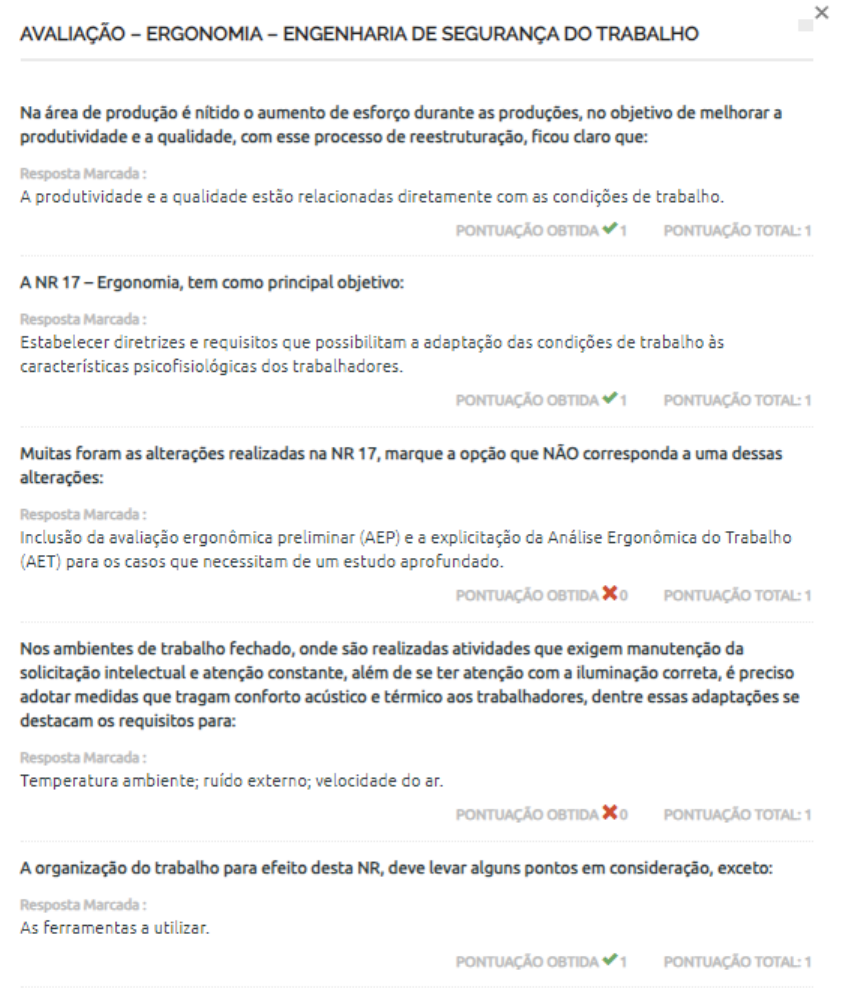 <p>AVALIAÇÃO - ERGONOMIA - ENGENHARIA DE SEGURANÇA DO TRABALHO Na área de produção é o aumento de esforço durante as produções, no objetivo de melhorar a produtividade e a qualidade, com esse processo de reestruturação, ficou claro que: Resposta Marcada : A produtividade e a qualidade estão relacionadas diretamente com as condições de trabalho. PONTUAÇÃO OBTIDA 1 PONTUAÇÃO TOTAL: 1 A NR 17 - Ergonomia, tem como principal objetivo: Resposta Marcada : Estabelecer diretrizes e requisitos que possibilitam a adaptação das condições de trabalho às características dos PONTUAÇÃO OBTIDA 1 PONTUAÇÃO TOTAL: 1 Muitas foram as alterações realizadas na NR 17, marque a opção que NÃO corresponda a uma dessas alterações: Resposta Marcada : Inclusão da avaliação ergonômica preliminar (AEP) e a explicitação da Análise Ergonômica do Trabalho (AET) para os casos que necessitam de um estudo aprofundado. PONTUAÇÃO OBTIDA 0 PONTUAÇÃO 1 Nos ambientes de trabalho fechado, onde são realizadas atividades que exigem manutenção da solicitação intelectual e atenção constante, além de se ter atenção com a iluminação correta, é preciso adotar medidas que tragam conforto acústico e térmico aos trabalhadores, dentre essas adaptações se destacam os requisitos para: Resposta Marcada : Temperatura ambiente; ruído externo; velocidade do ar. PONTUAÇÃO OBTIDA x 0 PONTUAÇÃO TOTAL: 1 A organização do trabalho para efeito desta NR, deve levar alguns pontos em consideração, exceto: Resposta : As ferramentas a utilizar. PONTUAÇÃO OBTIDA 1 PONTUAÇÃO TOTAL: 1</p><p>Assinale a primeira coluna de acordo com a segunda: (1) Ergonomia física (2) Ergonomia Operacional (3) Ergonomia Cognitiva. () Relacionada diretamente aos processos mentais. () Relacionada diretamente à postura no ambiente de trabalho. () Relacionada diretamente a otimização de sistemas sócios técnicos. Marque a correta: Resposta Marcada : 3-1-2 PONTUAÇÃO OBTIDA 1 PONTUAÇÃO TOTAL: 1 Referente aos serviços que exigem o trabalho em pé, assinale a alternativa correta: Resposta Marcada Deve ter espaço suficiente para os pés na base do plano de trabalho, para permitir que o trabalhador se aproxime o máximo possível do ponto de operação e possa posicionar completamente a região plantar. PONTUAÇÃO OBTIDA 1 PONTUAÇÃO TOTAL: 1 Sobre os trabalhos em que se é necessário permanecer na mesma posição por longo tempo, a nova NR 17 determina como medida de prevenção: Resposta Marcada : projeto e a organização do trabalho devem preocupar-se em introduzir variações nas tarefas e atividades, de modo a eliminar as posturas prolongadas. PONTUAÇÃO OBTIDA x PONTUAÇÃO TOTAL: 1 É comum que o trabalhador esteja em diferentes posturas ao longo do seu dia de trabalho, mas, o ideal e o melhor para saúde da pessoa que trabalha sentado é: Resposta Marcada Evitar posições inadequadas, realizar pausas, levantar periodicamente ao longo do dia. PONTUAÇÃO OBTIDA 1 PONTUAÇÃO TOTAL: 1 Existem quatro métodos usados pela biomecânica ocupacional para abordar o movimento humano durante a realização do trabalho. Marque a alternativa que não corresponda a um desses métodos: Resposta Marcada : Termografia PONTUAÇÃO OBTIDA 1 PONTUAÇÃO TOTAL: 1</p>
