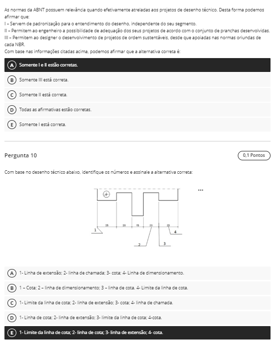 <p>As normas da ABNT possuem relevância quando efetivamente atreladas aos projetos de desenho Desta forma podemos afirmar que: I - Servem de padronização para entendimento do independente do seu segmento. II - Permitem ao engenheiro a possibilidade de adequação dos seus projetos de acordo com conjunto de pranchas III - Permitem ao designer desenvolvimento de projetos de ordem desde que apoiadas nas normas oriundas de cada NBR. Com base nas informações citadas podemos afirmar que a alternativa correta é A Somente I e II estão B Somente III está C Somente II está D Todas as afirmativas estão E Somente I está correta Pergunta 10 0,1 Pontos Com base no desenho técnico abaixo, identifique os numeros e assinale a alternativa correta: + 25 20 20 25 1 4 2 3 A Linha de extensão: 2- linha de chamada: 3- cota: Linha de B 1 - Cota: 2 - linha de dimensionamento; 3 - linha de Limite da linha de 1. Limite da linha de cota: 2- linha de cota: linha de chamada D Linha de linha de extensão: 3- limite da linha de cota: 4-cota E 1 Limite da linha de linha de cota: linha de 4</p>
