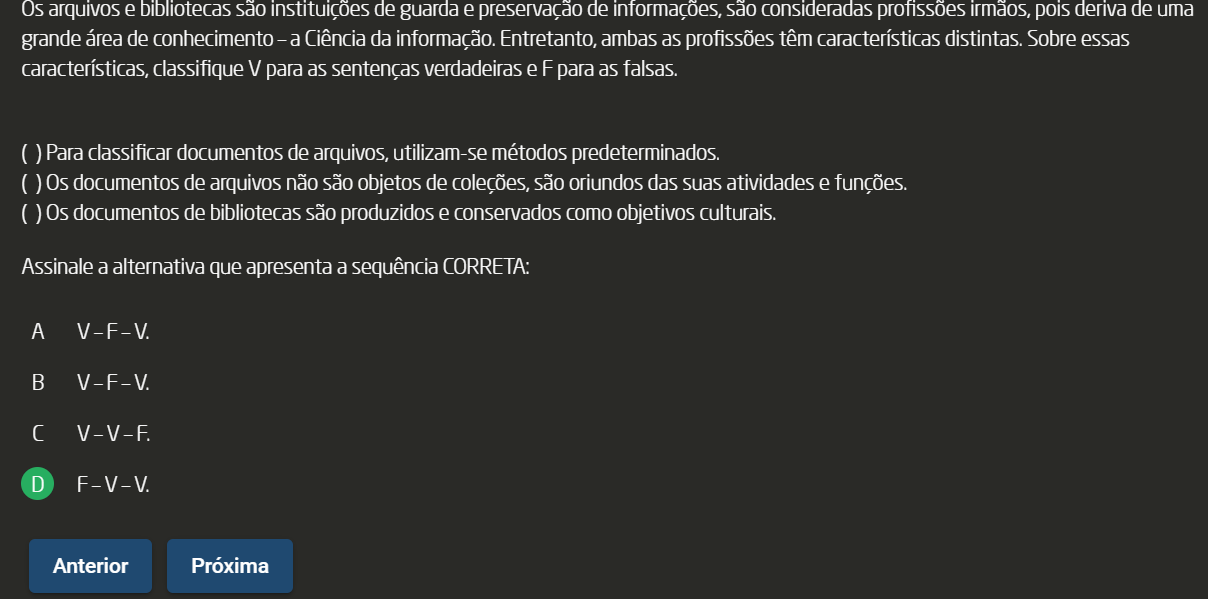 <p>Os arquivos e bibliotecas são instituições de guarda e preservação de informações, são consideradas profissões irmãos, pois deriva de uma grande área de conhecimento - a Ciência da informação. Entretanto, ambas as profissões têm características distintas. Sobre essas características, classifique V para as sentenças verdadeiras e F para as falsas. ( ) Para classificar documentos de arquivos, utilizam-se métodos predeterminados. ( ) Os documentos de arquivos não são objetos de coleções, são oriundos das suas atividades e funções. ( ) Os documentos de bibliotecas são produzidos e conservados como objetivos culturais. Assinale a alternativa que apresenta a CORRETA: A V-F-V V-V-F D F-V-V Anterior Próxima</p>
