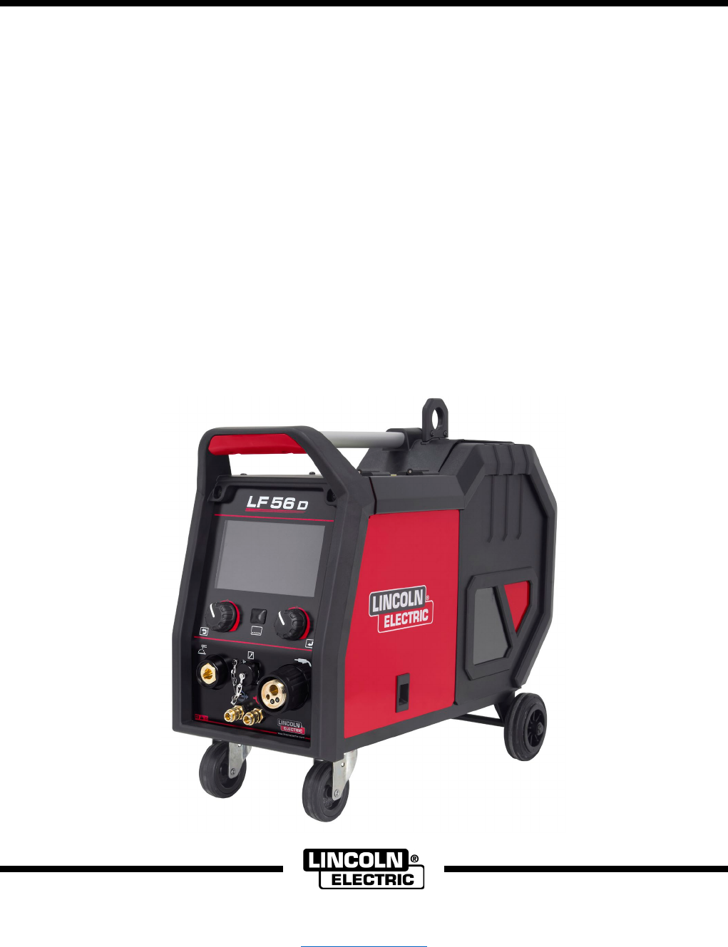 <p>IM3165</p><p>06/2022</p><p>REV04</p><p>LF 56D</p><p>MANUAL DE INSTRUÇÕES</p><p>PORTUGUESE</p><p>Lincoln Electric Bester Sp. z o.o.</p><p>ul. Jana III Sobieskiego 19A, 58-260 Bielawa, Poland</p><p>www.lincolnelectric.eu</p><p>http://www.lincolnelectric.eu/</p><p>Português I Português</p><p>12/05</p><p>OBRIGADO! Por escolher a QUALIDADE dos produtos da Lincoln Electric.</p><p>• Por favor, verifique se o equipamento e a embalagem não estão danificados. Qualquer reclamação relativa a danos</p><p>materiais no transporte deverá ser comunicada imediatamente ao revendedor.</p><p>• Para facilidade de uso, insira os dados de identificação do seu produto na tabela abaixo. O nome do modelo,</p><p>código e número de série encontram-se na chapa de características da máquina.</p><p>Modelo:</p><p>………………...…………………………….…………………………………………………………………………………………..</p><p>Código e Número de Série:</p><p>………………….……………………………………………….. …………………………………………………….……………..</p><p>Data e Local de Compra:</p><p>…………………………………………………………………... ……………………….…………………………………………..</p><p>ÍNDICE PORTUGUÊS</p><p>Especificações Técnicas ..................................................................................................................................................... 1</p><p>Compatibilidade Eletromagnética (CEM) ............................................................................................................................ 2</p><p>Segurança ........................................................................................................................................................................... 3</p><p>Introdução ........................................................................................................................................................................... 5</p><p>Instruções de Instalação e para o Operador ....................................................................................................................... 5</p><p>REEE ................................................................................................................................................................................ 13</p><p>Peças Sobressalentes....................................................................................................................................................... 13</p><p>REACh .............................................................................................................................................................................. 13</p><p>Localização das lojas de assistência autorizada ............................................................................................................... 13</p><p>Esquema de Ligações Elétricas ........................................................................................................................................ 13</p><p>Acessórios ......................................................................................................................................................................... 14</p><p>Configuração das ligações ................................................................................................................................................ 16</p><p>Português 1 Português</p><p>Especificações Técnicas</p><p>NOME ÍNDICE</p><p>LF 56D K14336-1</p><p>ENTRADA</p><p>Tensão de entrada U1 Amperagem de entrada I1 Classe CEM</p><p>40 VCC 4Adc A</p><p>SAÍDA NOMINAL</p><p>Ciclo de funcionamento 40°C</p><p>(baseado num período de 10 minutos) Corrente de Saída</p><p>100% 420A</p><p>60% 500A</p><p>Intervalo de corrente de soldadura Tensão de pico em circuito aberto</p><p>5 ÷ 500A 54 VCC (pico)</p><p>DIMENSÕES</p><p>Peso Altura Largura Comprimento</p><p>17,7 kg 516 mm 302 mm 642 mm</p><p>INTERVALO DE VELOCIDADE DE ALIMENTAÇÃO DO FIO/DIÂMETRO DO FIO</p><p>GAMA WFS Rolos de acionamento Diâmetro do rolo de acionamento</p><p>1,5 - 22 m/min 4 Ø37</p><p>Fios sólidos: Fios de alumínio: Fios fluxados:</p><p>0,8 ÷ 1,6 mm 1,0 ÷ 1,6 mm 0,9 ÷ 1,6 mm</p><p>OUTROS</p><p>Classificação de proteção Pressão máxima do gás</p><p>IP23 0,5 MPa (5 bar)</p><p>Temperatura de funcionamento Temperatura de Armazenamento</p><p>de -10 °C a +40 °C de -25°C a 55°C</p><p>Português 2 Português</p><p>Compatibilidade Eletromagnética (CEM)</p><p>01/11</p><p>Esta máquina foi concebida em conformidade com todas as diretivas e normas relevantes. No entanto, poderá ainda</p><p>gerar interferências eletromagnéticas que podem afetar outros sistemas, como telecomunicações (telefone, rádio e</p><p>televisão) ou outros sistemas de segurança. Estas interferências podem causar problemas de segurança nos sistemas</p><p>afetados. Leia e entenda esta secção para eliminar ou reduzir a quantidade de interferências eletromagnéticas geradas</p><p>por esta máquina.</p><p>Esta máquina foi concebida para áreas industriais. Para operar numa área doméstica, é necessário</p><p>observar precauções especiais para eliminar possíveis perturbações eletromagnéticas. O operador deve</p><p>instalar e operar este equipamento como descrito neste manual. Se forem detetadas quaisquer</p><p>perturbações eletromagnéticas o operador deve pôr em prática ações corretivas para eliminar estas</p><p>perturbações, se necessário com a assistência da Lincoln Electric.</p><p>Antes de instalar a máquina, o operador deve verificar se existe algum dispositivo na área de trabalho que possa</p><p>funcionar anomalamente devido às interferências eletromagnéticas. Deve ter-se em atenção o seguinte.</p><p>• Cabos de entrada
