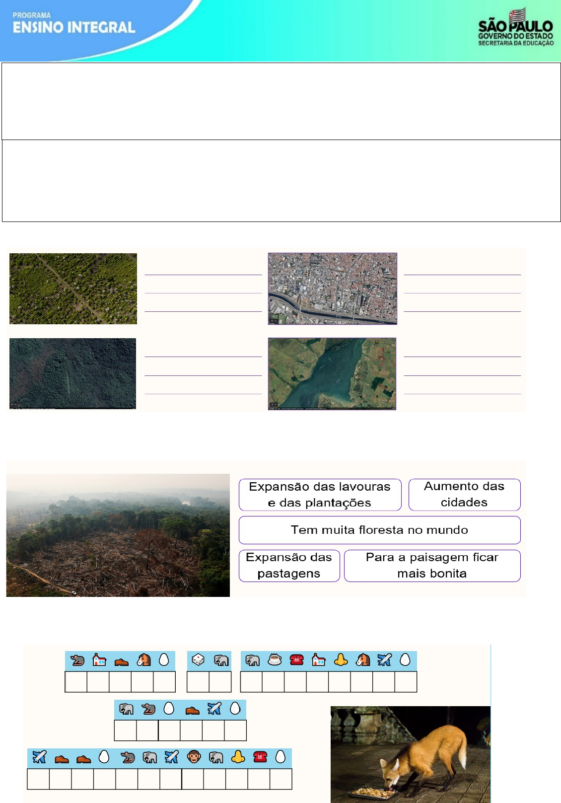 <p>PROVA DE GEOGRAFIA 3º BIMESTRE</p><p>NOME: __________________________________________________________ 3º ANO ___</p><p>PROFESSORA: __________________________________________ DATA: ____/____/____</p><p>HABILIDADES: (EF03GE11) Identificar e comparar os diferentes impactos socioambientais (erosão, deslizamento, escoamento superficial, entre outros) que podem ocorrer em áreas urbanas e rurais, a partir do desenvolvimento e do avanço de algumas atividades econômicas. (EF03GE06) Identificar e interpretar imagens bidimensionais e tridimensionais em diferentes tipos de representação cartográfica. (EF03GE07) Reconhecer e elaborar legendas com símbolos de diversos tipos de representações em diferentes escalas cartográficas.</p><p>1 - OBSERVE AS FOTOS DE SATÉLITE A SEGUIR E REGISTRE AS PAISAGENS QUE ELAS REPRESENTAM:</p><p>2- LEIA AS FRASES ABAIXO E PINTE DE VERDE AS QUE IDENTIFICAM OS MOTIVOS PARA A PRÁTICA DO DESMATAMENTO DE ÁREAS FLORESTAIS.</p><p>3-UTILIZANDO A PRIMEIRA LETRA DO NOME DE CADA EMOJI, DESCUBRA ALGUMAS CONSEQUÊNCIAS DO DESMATAMENTO DE ÁREAS FLORESTAIS:</p><p>4- VOCÊ JÁ PERCEBEU QUE UM MESMO OBJETO PODE SER FEITO COM VÁRIOS TIPOS DE MATERIAIS. POR EXEMPLO: HÁ CADEIRAS DE PLÁSTICO, MADEIRA, FERRO, COURO, ENTRE OUTROS MATERIAIS. AGORA ESCREVA O NOME DE ALGUNS MATERIAIS DE QUE OS OBJETOS NA TABELA PODEM SER FEITOS:</p><p>5- OBSERVANDO OS DESENHOS ABAIXO, QUE MOSTRAM A PRODUÇÃO DO LEITE, ENUMERE-OS DE ACORDO COM A SEQUÊNCIA EM QUE ELA ACONTECE:</p><p>6- SIGA AS COORDENADAS DA TABELA E DESCUBRA AS PALAVRAS QUE FORMAM O NOME DE ALGUNS MAQUINÁRIOS QUE SÃO UTILIZADOS NO CAMPO PARA AS PLANTAÇÕES:</p><p>BOA PROVA</p><p>image6.png</p><p>image7.png</p><p>image1.jpeg</p><p>image2.png</p><p>image3.png</p><p>image4.png</p><p>image5.png</p>