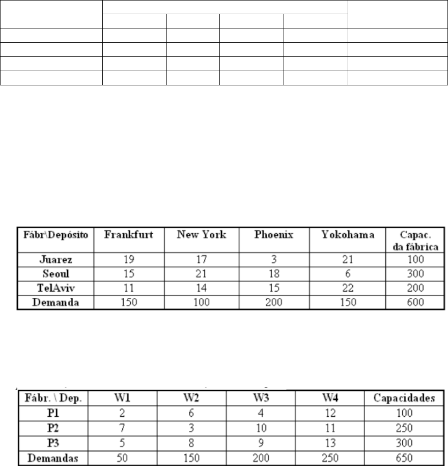 <p>Atividade</p><p>1) Determinada empresa pretende transportar um certo produto, que é fabricado</p><p>nas suas 3 fábricas, para 3 centros de distribuição. A capacidade de produção por dia de cada</p><p>fábrica é a que consta na última coluna da tabela em baixo. A última linha da tabela dá-nos as</p><p>necessidades máximas de cada centro de distribuição. Os custos de transporte, por unidade de</p><p>produto, das fábricas para cada centro encontram-se mencionados na mesma tabela. Definir a</p><p>designação que gere o menor custo de transporte para os dados da tabela abaixo utilizando o</p><p>método Vogel</p><p>Fábrica</p><p>Centros de Distribuição</p><p>Capacidade</p><p>CD 1 CD 2 CD 3 CD 4</p><p>F 1 5 3 1 10 200</p><p>F 2 5 7 3 2 300</p><p>F 3 3 2 1 8 150</p><p>Demanda 150 200 100 300</p><p>2) Uma companhia faz esquis em 3 fábricas através do mundo. As fábricas suprem</p><p>4 depósitos que distribuem os esquis diretamente às lojas. O problema é achar quantos pares</p><p>de esquis devem ser transportados de cada fábrica para os vários depósitos para minimizar o</p><p>custo total</p><p>a) Ache a solução inicial pelo método do Canto Noroeste</p><p>b) Ache a solução inicial pelo método do Custo Mínimo</p><p>c) Ache a solução inicial pelo método de Vogel</p><p>3) Considere o seguinte problema da Distribuidora BGLP, cujos custos de</p><p>transporte das fábricas até os depósitos estão contidos no quadro a seguir:</p><p>a) Utilizando o método que desejar, determine uma solução inicial. Calcule o custo para</p><p>esta solução inicial.</p><p>4) Uma empresa tem 2 fábricas e 3 depósitos de distribuição. Os custos de</p><p>distribuição, demandas e capacidades estão no quadro a seguir. Quanto deve ser enviado de</p><p>cada fábrica para cada depósito de modo a minimizar o custo total de transporte? Ache a</p><p>solução ótima pelos métodos do canto noroeste, custo mínimo e vogel.</p><p>5) A empresa Caramelos & Confetes atua no ramo doceiro desde 1990 e possui 3</p><p>lojas localizadas na Grande São Paulo. Seus principais clientes estão localizados na Capital</p><p>Paulista, Baixada Santista e Vale do Paraíba. A capacidade de produção das lojas, a demanda</p><p>dos clientes e os custos por unidade distribuída de cada loja para cada cliente estão na tabela</p><p>abaixo. A fim de minimizar o custo total de transporte, a empresa quer determinar quanto</p><p>distribuir de cada loja para os respectivos consumidores, respeitando a capacidade de</p><p>produção e garantindo que as demandas serão atendidas. Formule o problema de transporte</p><p>da empresa e resolva pelo método do Canto Noroeste, custo mínimo e vogel.</p>