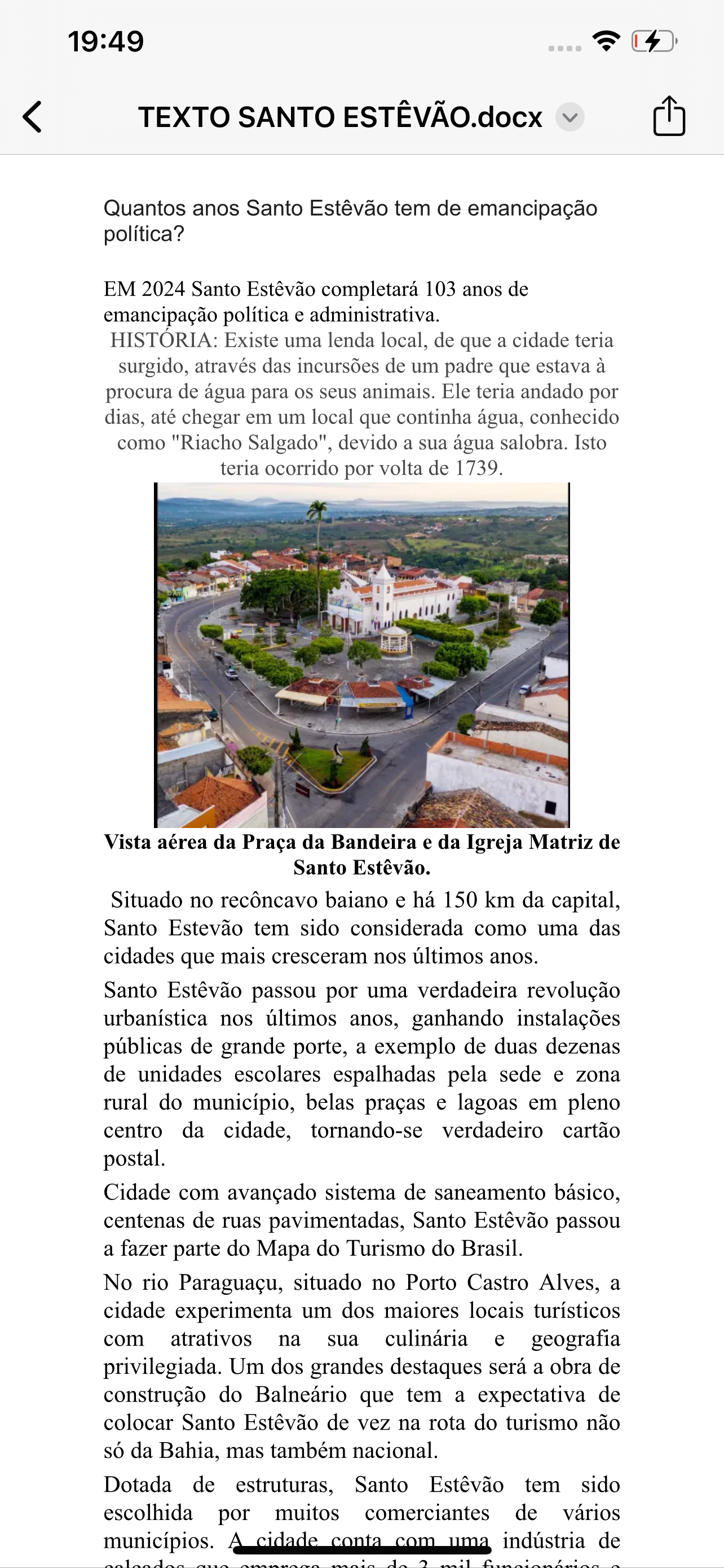 <p>19:49 TEXTO SANTO Quantos anos Santo Estêvão tem de emancipação política? EM 2024 Santo Estêvão completará 103 anos de emancipação política e administrativa. HISTÓRIA: Existe uma lenda local, de que a cidade teria surgido, através das incursões de um padre que estava à procura de água para os seus animais. Ele teria andado por dias, até chegar em um local que continha água, conhecido como "Riacho Salgado", devido a sua água salobra. Isto teria ocorrido por volta de 1739. Vista aérea da Praça da Bandeira e da Igreja Matriz de Santo Situado no baiano e há 150 km da capital, Santo Estevão tem sido considerada como uma das cidades que mais cresceram nos últimos anos. Santo Estêvão passou por uma verdadeira revolução urbanística nos últimos anos, ganhando instalações públicas de grande porte, a exemplo de duas dezenas de unidades escolares espalhadas pela sede e zona rural do município, belas praças e lagoas em pleno centro da cidade, tornando-se verdadeiro cartão postal. Cidade com avançado sistema de saneamento básico, centenas de ruas pavimentadas, Santo Estêvão passou a fazer parte do Mapa do Turismo do Brasil. No rio Paraguaçu, situado no Porto Castro Alves, a cidade experimenta um dos maiores locais turísticos com atrativos na sua culinária e geografia privilegiada. Um dos grandes destaques será a obra de construção do Balneário que tem a expectativa de colocar Santo Estêvão de vez na rota do turismo não só da Bahia, mas também nacional. Dotada de estruturas, Santo Estêvão tem sido escolhida por muitos comerciantes de vários municípios. A cidade conta com uma indústria de 2</p>