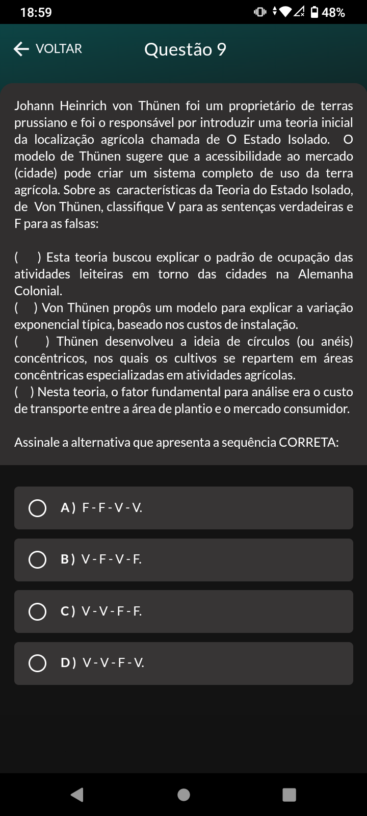 <p>18:59 48% VOLTAR Questão 9 Johann Heinrich von Thünen foi um proprietário de terras prussiano e foi O responsável por introduzir uma teoria inicial da localização agrícola chamada de O Estado Isolado. O modelo de Thünen sugere que a acessibilidade ao mercado (cidade) pode criar um sistema completo de uso da terra agrícola. Sobre as características da Teoria do Estado Isolado, de Von Thünen, classifique V para as sentenças verdadeiras e F para as falsas: ( ) Esta teoria buscou explicar padrão de ocupação das atividades leiteiras em torno das cidades na Alemanha Colonial. ( ) Von Thünen propôs um modelo para explicar a variação exponencial típica, baseado nos custos de instalação. ( ) Thünen desenvolveu a ideia de círculos (ou anéis) concêntricos, nos quais os cultivos se repartem em áreas concêntricas especializadas em atividades agrícolas. ( ) Nesta teoria, fator fundamental para análise era custo de transporte entre a área de plantio e mercado consumidor. Assinale a alternativa que apresenta a sequência CORRETA: A) B) V-F-V-F D)</p>