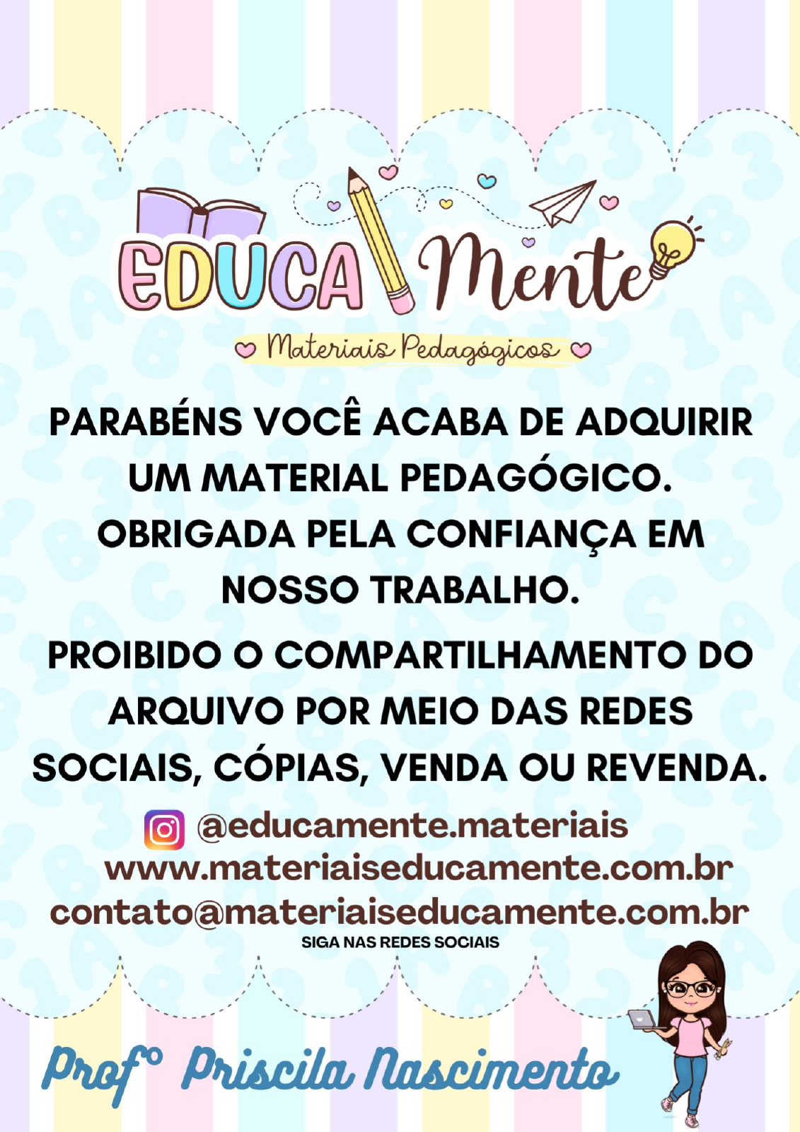 <p>EDUCA Mente Materiais Pedagogicos 0 PARABÉNS ACABA DE ADQUIRIR UM MATERIAL PEDAGÓGICO. OBRIGADA PELA CONFIANÇA EM NOSSO TRABALHO. PROIBIDO COMPARTILHAMENTO DO ARQUIVO POR MEIO DAS REDES SOCIAIS, CÓPIAS, VENDA OU REVENDA. www.materiaiseducamente.com.br contato@materiaiseducamente.com.br SIGA NAS REDES SOCIAIS Priscila Nascimento</p><p>EDUCA Mente Materiais Pedagogicos PARABÉNS ACABA DE ADQUIRIR UM MATERIAL PEDAGÓGICO ELABORADO POR EDUCA MENTE MATERIAIS PEDAGÓGICOS. PROIBIDO COMPARTILHAMENTO DO ARQUIVO EM REDES SOCIAIS COMO: WHATSAPP, TELEGRAM, INSTAGRAM, BLOG E OUTROS. LEMBRANDO QUE ESTE MATERIAL É DE USO PESSOAL, SENDO PROIBIDO A REVENDA DO ARQUIVO. PROIBIDO VENDAS, CÓPIAS, OU COMPARTILHAMENTO Direito autoral é uma garantia concedida ao cidadão pela Constituição Federal de 1988 no inciso XXVII do artigo 5°, e também pela lei de Direitos Autorais n° 9.610/98. Priscila</p><p>Gustavo Machado Rosa nasceu dia 20 de dezembro de 1946, em São Paulo e desde os três anos de idade a arte já fazia parte de sua vida. Desenhava cenas e figuras de seu dia a dia, que se tornaram personagens de sua obra, como a mulher com lata d'água na cabeça, os meninos empinando pipas, o sorveteiro e tantos outros personagens que espelhavam a sociedade do pós guerra. Estudou na Escola Morumbi e no Colégio Paes Leme. Durante as aulas desenhava o tempo todo. Anos mais tarde, estagiou no setor de artes da Editora Abril e em pouco tempo passou a dedicar-se a arte por conta própria, no ateliê na sala de jantar da casa de seus pais. Em 1964 passou a frequentar o curso livre de desenho e pintura da Fundação Armando Álvares Penteado- FAAP, ministrado pela artista plástica Teresa Nazar, pintora pioneira da Pop Art no Brasil, que mais tarde, escolheu quatro de suas obras para serem expostas, na Primeira Anual de Artes Plásticas da FAAP, realizada no MAB Museu de Arte Brasileira. Em 1969 participou de sua primeira exposição coletiva, ao lado de grandes obras.</p><p>Curiosidades sobre as Obras de Gustavo Rosa Gustavo Rosa fez uma incursão por diversos temas que nominaram suas obras, entre ele, os gatos: O tema palhaço também foi desenvolvido por Gustavo, entre as telas dessa fase destaca-se: Entre outros temas que Gustavo Rosa também explorou estão as bicicletas:</p><p>T 79 Obra de 1970</p><p>Obra de 1980</p><p>Obra de 1990</p><p>Obra de 2000</p><p>03 MARQUES HOMEM Q. DANGA TODOS Obra de 2003</p><p>Obra de 2005</p><p>CDA 05 Obra de 2005</p><p>Obra de 2013</p><p>Obra de 2010</p><p>Obra de 2011</p><p>DESCREVA o QUE ESTA ACONTECENDO NESSA ARTE</p><p>REPLIQUE ESSA ARTE:</p><p>REPLIQUE ESSA ARTE:</p><p>REPLIQUE ESSA ARTE:</p><p>REPLIQUE ESSA ARTE:</p><p>AS OBRAS DE GUSTAVO ROSA</p><p>CONTE PORQUE ESSE PALHAÇO ESTA VOANDO</p><p>o QUE ELA ESTA FAZENDO E POR QUE?</p><p>REPLIQUE ESSA ARTE:</p><p>PARA ONDE ELES ESTÃO INDO?</p><p>DESCREVA o QUE ESTA ACONTECENDO NESSA ARTE</p><p>EDUCA Mente Materiais Pedagogicos PARABÉNS ACABA DE ADQUIRIR UM MATERIAL PEDAGÓGICO ELABORADO POR EDUCA MENTE MATERIAIS PEDAGÓGICOS. PROIBIDO COMPARTILHAMENTO DO ARQUIVO EM REDES SOCIAIS COMO: WHATSAPP, TELEGRAM, INSTAGRAM, BLOG E OUTROS. LEMBRANDO QUE ESTE MATERIAL É DE USO PESSOAL, SENDO PROIBIDO A REVENDA DO ARQUIVO. PROIBIDO VENDAS, CÓPIAS, OU COMPARTILHAMENTO Direito autoral é uma garantia concedida ao cidadão pela Constituição Federal de 1988 no inciso XXVII do artigo 5°, e também pela lei de Direitos Autorais n° 9.610/98. Priscila</p>