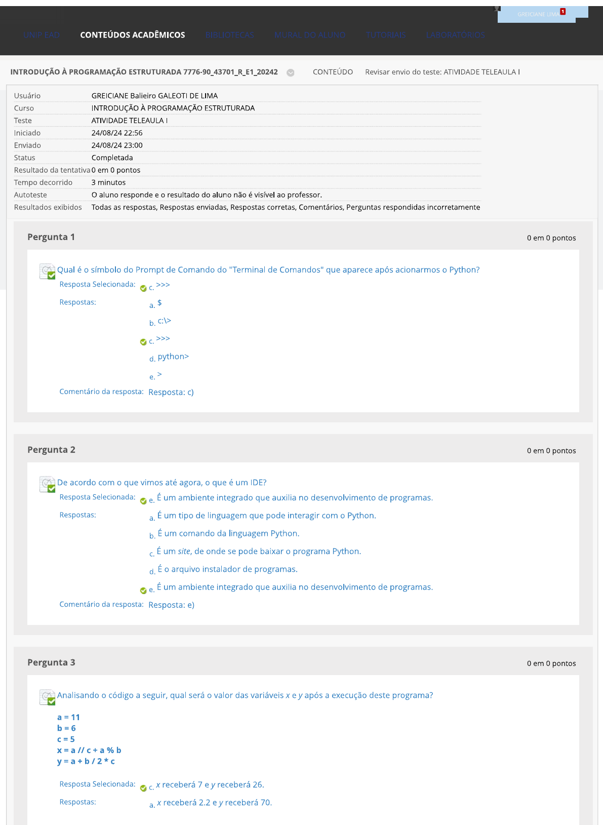<p>UNIP EAD CONTEÚDOS ACADÊMICOS BIBLIOTECAS MURAL DO ALUNO TUTORIAIS LABORATÓRIOS INTRODUÇÃO À PROGRAMAÇÃO ESTRUTURADA 7776-90_43701_R_E1_20242 CONTEÚDO Revisar envio do teste: ATIVIDADE TELEAULA Usuário Curso INTRODUÇÃO À PROGRAMAÇÃO ESTRUTURADA Teste ATIVIDADE TELEAULA Iniciado 08/24 Enviado Status Completada Resultado da tentativa 0 em 0 pontos Tempo decorrido 3 minutos Autoteste aluno responde e o resultado do aluno não é visível ao professor. Resultados exibidos Todas as respostas, Respostas enviadas, Respostas corretas, Comentários, Perguntas respondidas incorretamente Pergunta 1 0 em 0 pontos Qual é o símbolo do Prompt de Comando do "Terminal de Comandos" que aparece após acionarmos Python? Resposta Selecionada: >>> C. Respostas: a. $ b. C. >>> d. python> Comentário da resposta: Resposta: c) Pergunta 2 0 em 0 pontos De acordo com o que vimos até agora, o que é um IDE? Resposta Selecionada: e. É um ambiente integrado que auxilia no desenvolvimento de programas. Respostas: a. É um tipo de linguagem que pode interagir com o Python b. É um comando da linguagem Python. C. É um site, de onde se pode baixar o programa Python. d. É o arquivo instalador de programas. e. É um ambiente integrado que auxilia no desenvolvimento de programas. Comentário da resposta: Resposta: e) Pergunta 3 0 em 0 pontos Analisando o código a seguir, qual será o valor das variáveis X e y após a execução deste programa? a=11 y=a+b/2*c Resposta Selecionada: X receberá 7 e y receberá 26. Respostas: a. X receberá 2.2 e y receberá 70.</p><p>b. X receberá 3 e y receberá 42.5. C. X receberá 7 e y receberá 26. d. X receberá 3 e y receberá 26. e. X receberá 4.03 e y receberá 11.6. Comentário da resposta: Resposta: c) Pergunta 4 0 em 0 pontos Analisando o código a seguir, o que será impresso na tela do console, se entrarmos com o valor 6 para a variável "a" e 12 para a variável "b"? int(input("Digite o valor de a: ")) int(input("Digite o valor de and y =(a<b/2) or print("x =", X, "e Resposta Selecionada: a. X = False ey = True. Respostas: a. X = False e y b. X = True ey C. X = True e y False. = 11. Comentário da resposta: OK</p>
